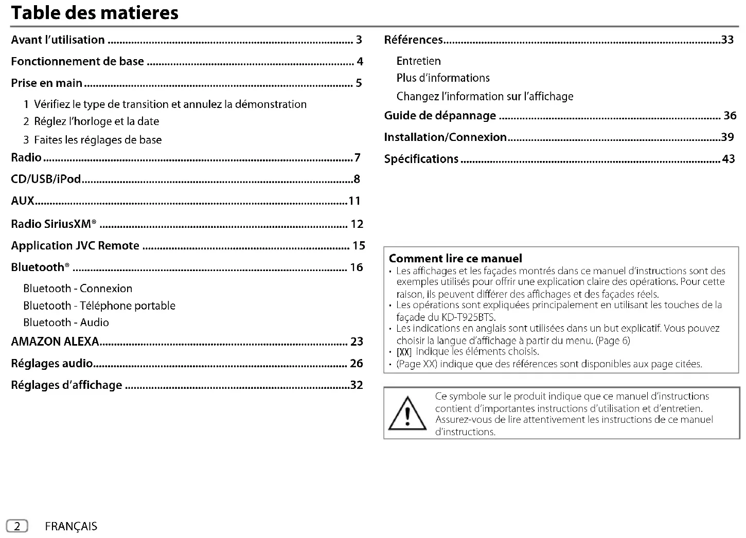 - Mettez l’appareil hors tension pendant environ 10 secondes, remettez-le sous tension et essayez de nouveau. En cas de problèmes, essayez ce qui suit: 1 Vérifiez la section GUIDE DE DÉPANNAGE 2 Réinitialisez l’appareil (page4) 3 Contactez (USA uniquement) Appelez: 1-800-252-5722 ( ou ) consultez: <https://www.jvc.com> KD_T925BTS_K_FR.indd 38KD_T925BTS_K_FR.indd 38 9/3/2022 4:29:07 PM9/3/2022 4:29:07 PMFRANÇAIS