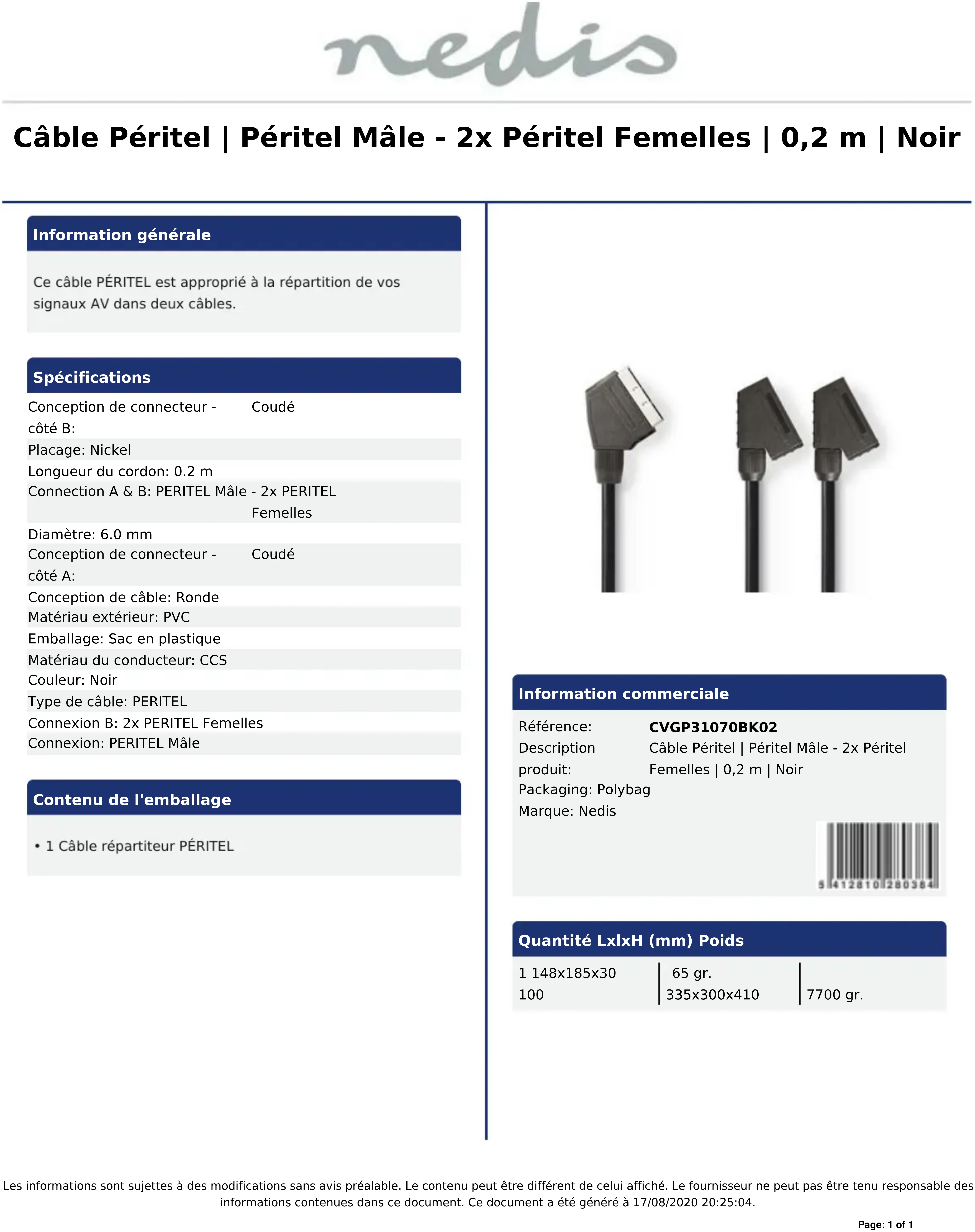 - 1 Câble répartiteur PÉRITEL Information commerciale Référence: CVGP31070BK02 Description produit: Câble Péritel | Péritel Mâle - 2x Péritel Femelles | 0,2 m | Noir Packaging: Polybag Marque: Nedis Quantité LxlxH (mm) Poids 1 148x185x30 65 gr.