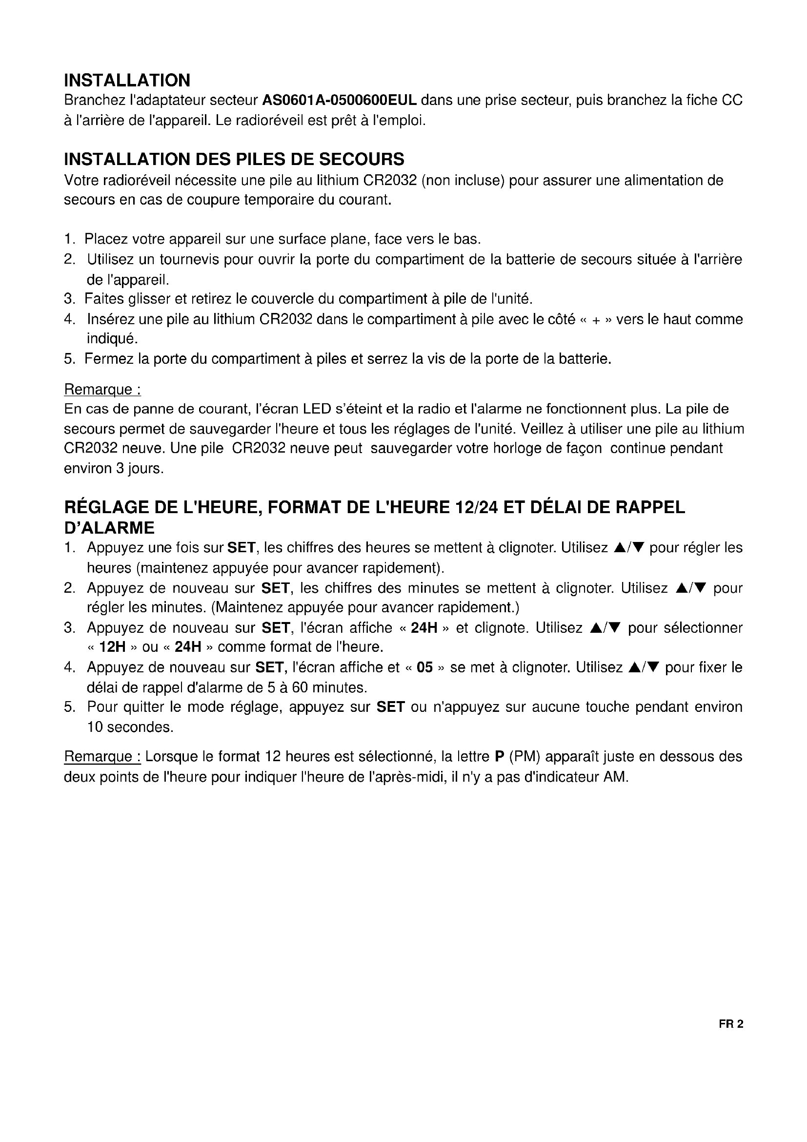 Remarque : En cas de panne de courant, l’écran LED s’éteint et la radio et l'alarme ne fonctionnent plus. La pile de secours permet de sauvegarder l'heure et tous les réglages de l'unité. Veillez à utiliser une pile au lithium CR2032 neuve. Une pile CR2032 neuve peut sauvegarder votre horloge de façon continue pendant environ 3 jours. RÉGLAGE DE L'HEURE, FORMAT DE L'HEURE 12/24 ET DÉLAI DE RAPPEL D’ALARME