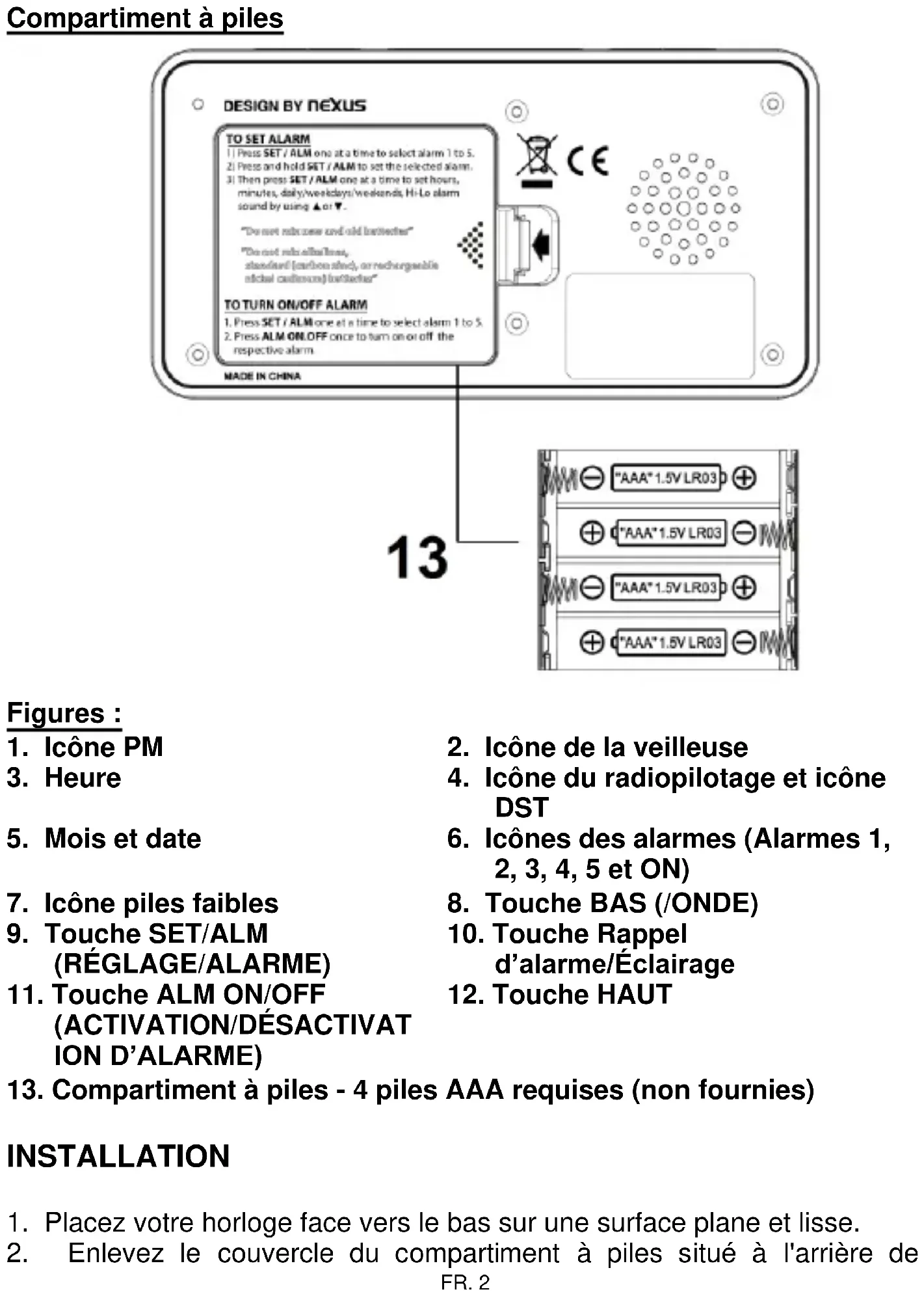 Qualité de la réception L’horloge utilise la technologie de transmission sans fil pour récupérer le signal d'horloge et ajuster l'heure en conséquence. Comme avec tout appareil de communication sans fil, la qualité de cette réception se dégrade dans les circonstances suivantes: longue distance de transmission Montagnes et vallées proches près d'une autoroute, d'un chemin de fer, d'un aéroport, d'une ligne à haute tension, etc. près d'un chantier de construction au milieu de hauts bâtiments à l'intérieur d'un bâtiment en béton à proximité d'un appareil électrique (ordinateur, téléviseur, etc.) et d'une structure métallique à l'intérieur d'un véhicule en déplacement Placez l’horloge à un endroit adapté pour une bonne réception des signaux radio, en l'occurrence près d'une fenêtre et loin de toute surface métallique et de tout appareil électrique. Précautions Installez l'appareil en intérieur. N'exposez pas l'appareil à des forces et des chocs excessifs.FR. 11 N'exposez pas l'appareil à des températures extrêmes, directs du soleil, à la poussière ou à l'humidité. Ne plongez pas l'appareil dans l'eau. Évitez tout contact avec des matériaux corrosifs. Ne jetez pas l'appareil dans le feu, elle risque d'exploser. N'ouvrez pas le coffret de l'appareil et n'altérez aucun de ses composants. Avertissements de sécurité concernant les piles Utilisez uniquement des piles alcalines, ne pas des piles rechargeables. Installez les piles en respectant le sens des polarités (+/-). Remplacez toujours toutes les piles en même temps. Ne combinez pas des piles usagées avec des piles neuves. Retirez immédiatement les piles déchargées de l'appareil. Retirez les piles lorsque vous n'envisagez pas d'utiliser votre appareil avant longtemps. N'essayez pas de recharger des piles qui ne sont pas rechargeables et ne jetez aucune pile dans le feu (elle risque d'exploser). Rangez vos piles de façon à ce qu'aucun objet métallique ne puisse mettre leurs bornes en court-circuit. Évitez d'exposer les piles à des températures extrêmes, à une humidité extrême et aux rayons directs du soleil. Conservez vos piles hors de portée des enfants. Elles présentent un risque d'étouffement. Utilisez le produit uniquement pour son usage prévu! Noter l'obligation de la Loi sur la batterie Les piles ne doivent pas être déposées avec vos ordures ménagères. Dans le cas où vous le faites vous risquez de provoquer des dommages importants à votre environnement ou à la santé d'autrui. Vous pouvez rendre les piles usagées à votre commerçant qui vous les a vendues ou d'office à une collecte. Vous en tant qu'utilisateur ou consommateur vous êtes obligés par la loi de retourner les piles usagées! Noter l'obligation de la Loi sur les appareils électriques Ce symbole signifie que les appareils électriques ne doivent pas être jetés aux ordures ménagères à la fin de leur vie utile. Ramenez votre appareil à votre point local de collecte de déchets ou à un centre de recyclage. Ceci s'applique à tous les pays de l'Union européenne et aux autres pays européens disposant d'un système de collecte des déchets sélectif.FR. 12