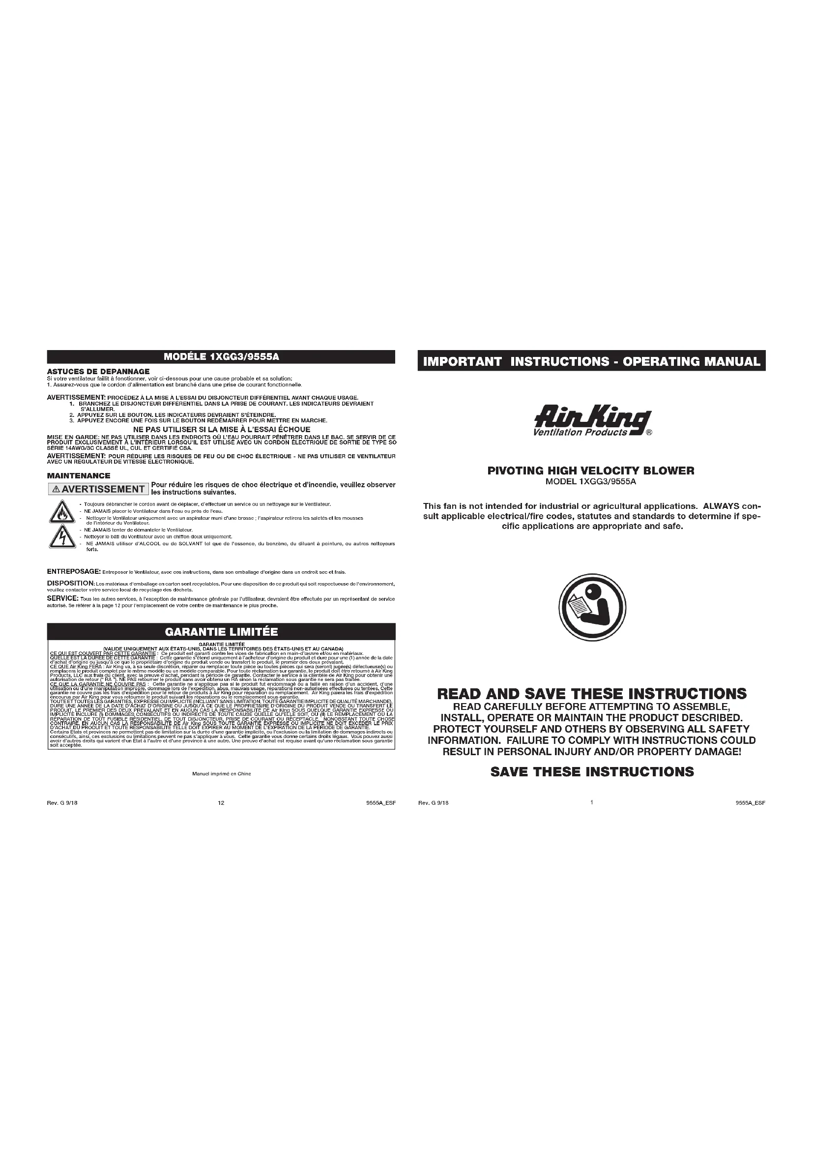 AVEC UN RÉGULATEUR DE VITESSE ÉLECTRONIQUE. This fan is not intended for industrial or agricultural applications. ALWAYS con- sult applicable electrical/fire codes, statutes and standards to determine if spe- cific applications are appropriate and safe. GARANTIE LIMITÉE (VALIDE UNIQUEMENT AUX ÉTATS-UNIS, DANS LES TERRITOIRES DES ÉTATS-UNIS ET AU CANADA) CE QUI EST COUVERT PAR CETTE GARANTIE : Ce produit est garanti contre les vices de fabrication en main-d’œuvre et/ou en matériaux. QUELLE EST LA DURÉE DE CETTE GARANTIE : Cette garantie s’étend uniquement à l’acheteur d’origine du produit et dure pour une (1) année de la date d’achat d’origine ou jusqu’à ce que le propriétaire d’origine du produit vende ou transfert le produit, le premier des deux prévalant. CE QUE Air King FERA : Air King va, à sa seule discrétion, réparer ou remplacer toute pièce ou toutes pièces qui sera (seront) jugée(s) défectueuse(s) ou remplacera le produit complet par le même modèle ou un modèle comparable. Pour toute réclamation sur garantie, le produit doit être retourné à Air King Products, LLC aux frais du client, avec la preuve d’achat, pendant la période de garantie. Contacter le service à la clientèle de Air King pour obtenir une autorisation de retour (“ RA ”). NE PAS retourner le produit sans avoir obtenu un RA sinon la réclamation sous garantie ne sera pas traitée. CE QUE LA GARANTIE NE COUVRE PAS : Cette garantie ne s’applique pas si le produit fut endommagé ou a faillé en raison d’un accident, d’une utilisation ou d’une manipulation impropre, dommage lors de l’expédition, abus, mauvais usage, réparations non-autorisées effectuées ou tentées. Cette garantie ne couvre pas les frais d’expédition pour le retour de produits à Air King pour réparation ou remplacement. Air King paiera les frais d’expédition encourus par Air King pour vous retourner le produit suivant les réparations ou le remplacement sous garantie. TOUTE ET TOUTES LES GARANTIES, EXPRESSE OU IMPLICITE (INCLUANT SANS LIMITATION, TOUTE GARANTIE IMPLICITE DE QUALITÉ MARCHANDE), DURE UNE ANNÉE DE LA DATE D’ACHAT D’ORIGINE OU JUSQU’À CE QUE LE PROPRIÉTAIRE D’ORIGINE DU PRODUIT VENDE OU TRANSFERT LE PRODUIT, LE PREMIER DES DEUX PRÉVALANT ET EN AUCUN CAS LA RESPONSABILITÉ DE Air King SOUS QUELQUE GARANTIE EXPRESSE OU IMPLICITE INCLURE (I) DOMMAGES CONSÉCUTIFS OU INDIRECTS DE TOUTE CAUSE QUELLE QU’ELLE SOIT, OU (II) LE REMPLACEMENT OU LA RÉPARATION DE TOUT FUSIBLE RÉSIDENTIEL, DE TOUT DISJONCTEUR, PRISE DE COURANT OU RÉCEPTACLE. NONOBSTANT TOUTE CHOSE CONTRAIRE, EN AUCUN CAS LA RESPONSABILITÉ DE Air King SOUS TOUTE GARANTIE EXPRESSE OU IMPLICITE NE DOIT EXCÉDER LE PRIX D’ACHAT DU PRODUIT ET TOUTE RESPONSABILITÉ TELLE DOIT EXPIRER AU MOMENT DE L’EXPIRATION DE LA PÉRIODE DE GARANTIE. Certains États et provinces ne permettent pas de limitation sur la durée d’une garantie implicite, ou l’exclusion ou la limitation de dommages indirects ou consécutifs, ainsi, ces exclusions ou limitations peuvent ne pas s’appliquer à vous. Cette garantie vous donne certains droits légaux. Vous pouvez aussi avoir d’autres droits qui varient d’un État à l’autre et d’une province à une autre. Une preuve d’achat est requise avant qu’une réclamation sous garantie soit acceptée.Rev. G 9/18 9555A_ESFRev. G 9/18 9555A_ESF