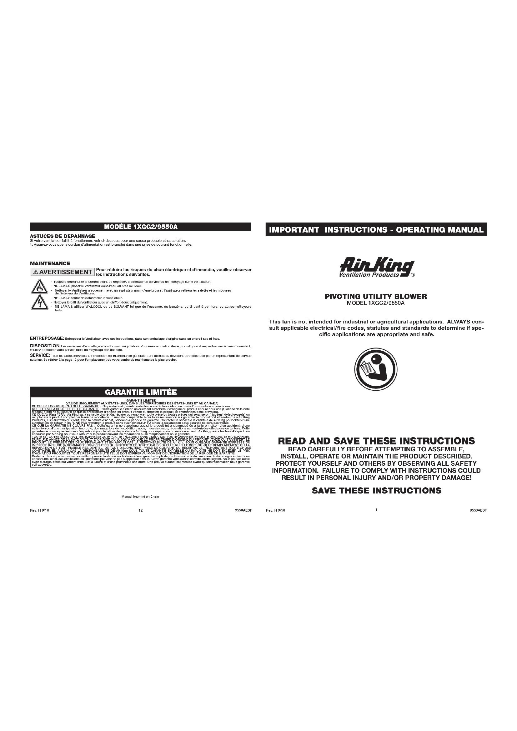 9550 - Ventilateur Air King - Notice d'utilisation et mode d'emploi gratuit
