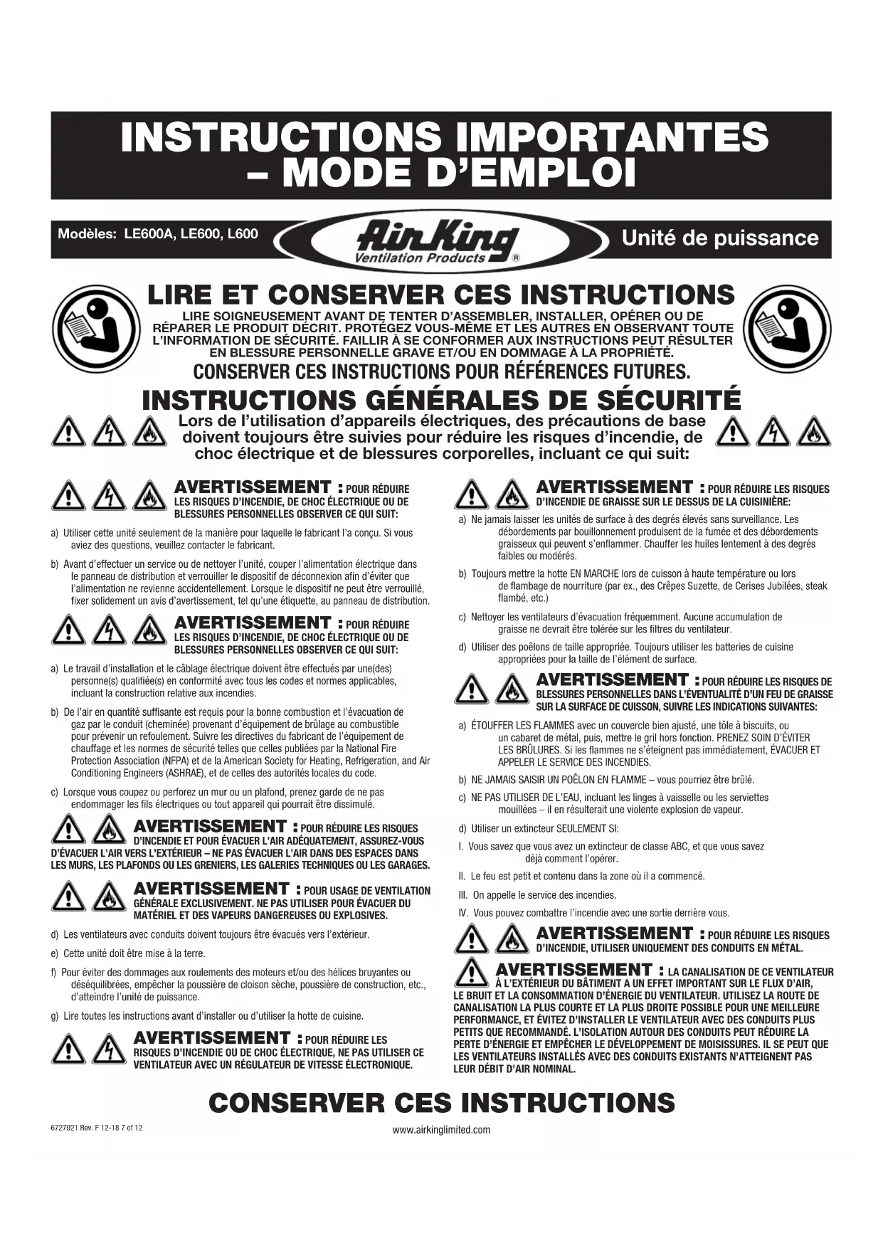 LE600A - Hotte Air King - Notice d'utilisation et mode d'emploi gratuit