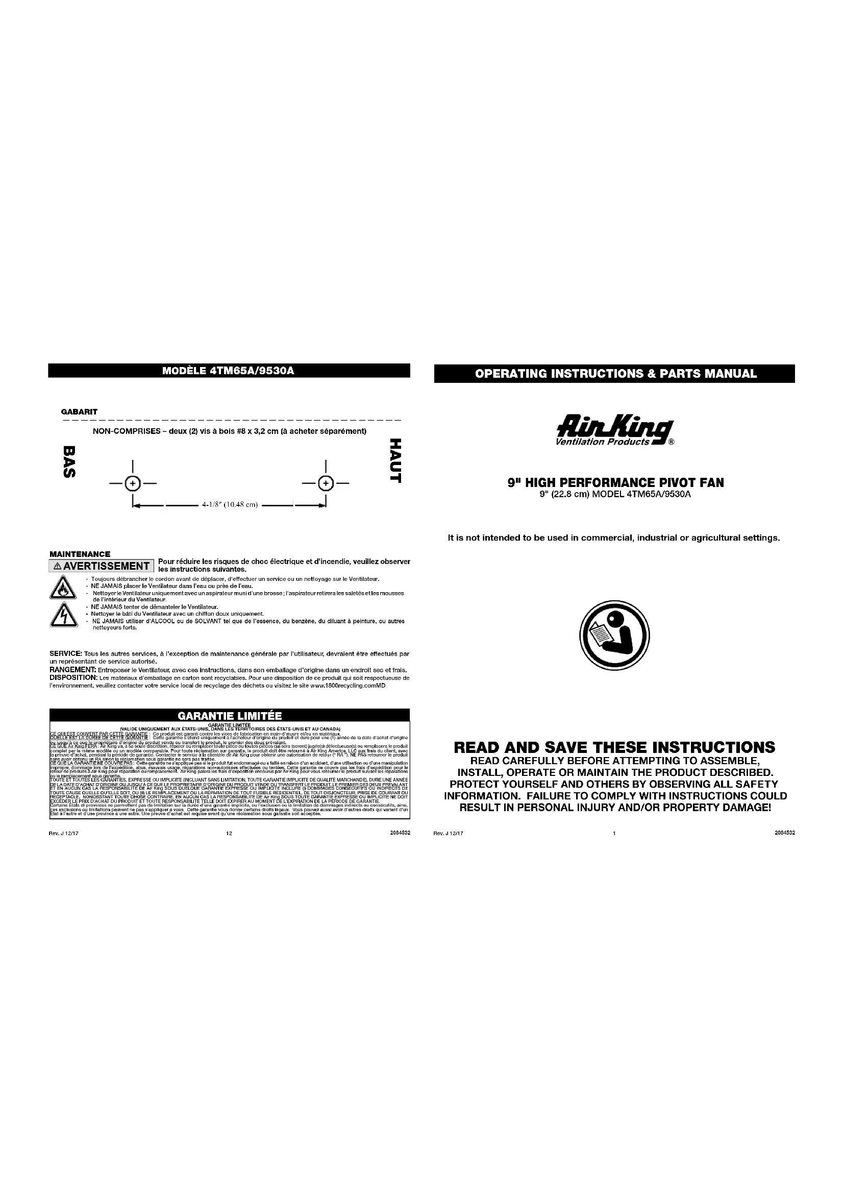 9530 - Ventilateur Air King - Notice d'utilisation et mode d'emploi gratuit