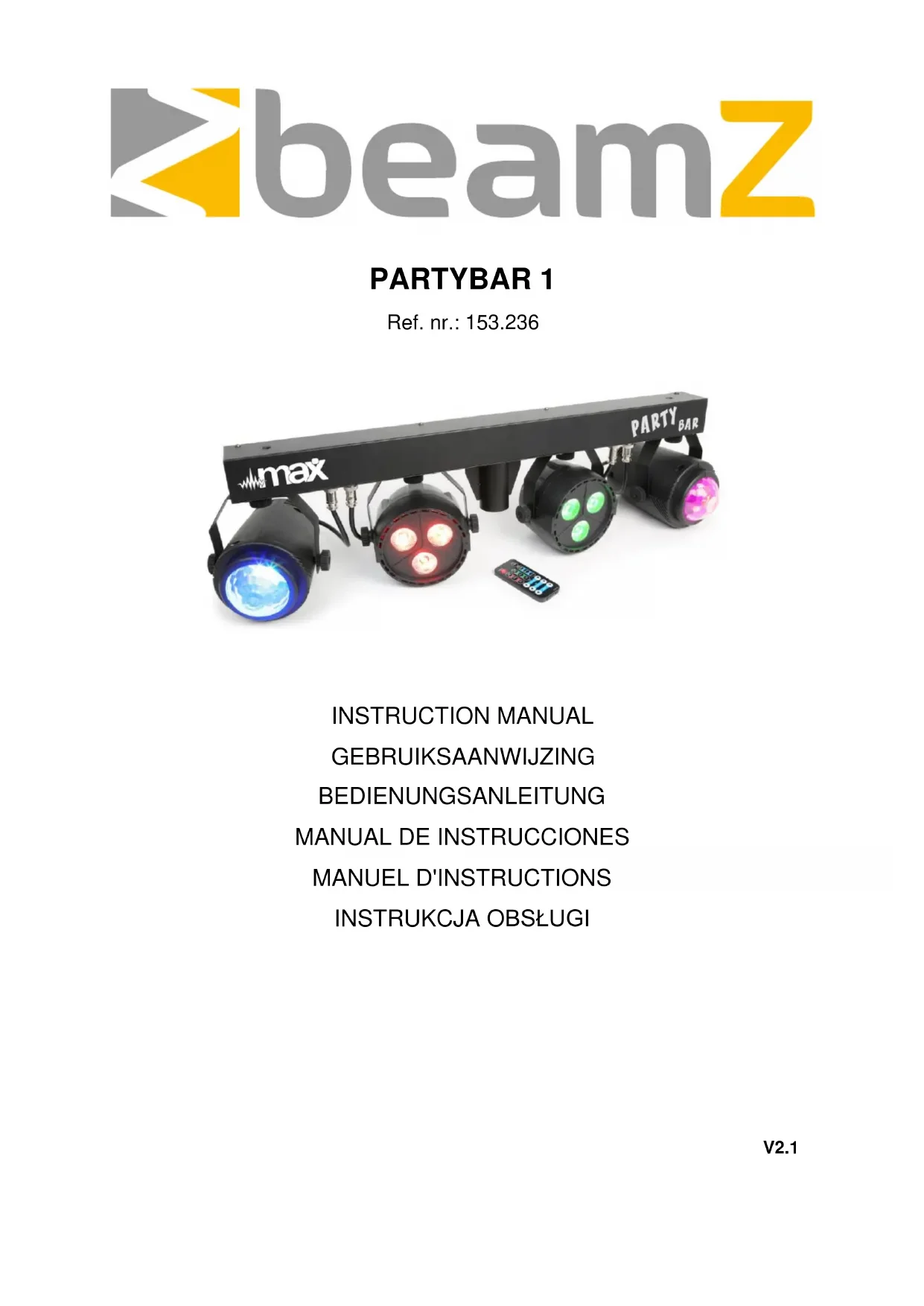 ATENCIÓN: Se recomienda encarecidamente que la limpieza interna sea llevada a cabo por trabajador cualificado!19 FRANÇAIS Nous vous remercions d’avoir acheté un appareil Max. Veuillez lire la présente notice avant l’utilisation afin de pouvoir en profiter pleinement. Veuillez lire la notice avant utilisation. Respectez impérativement les instructions afin de continuer à bénéficier de la garantie. Prenez toutes les précautions nécessaires pour éviter tout incendie ou décharge électrique. Seul un technicien spécialisé peut effectuer les réparations. Nous vous conseillons de conserver la présente notice pour pouvoir vous y reporter ultérieurement. - Avant d’utiliser l’appareil, prenez conseil auprès d’un spécialiste. Lors de la première mise sous tension, il est possible qu’une odeur soit perceptible. C’est normal, l’odeur disparaîtra peu de temps après. - L’appareil contient des composants porteurs de tension. N’OUVREZ JAMAIS le boîtier. - Ne placez pas des objets métalliques ou du liquide sur l’appareil, cela pourrait causer des décharges électriques et dysfonctionnements. - Ne placez pas l’appareil à proximité de sources de chaleur, par exemple radiateur. Ne positionnez pas l’appareil sur une surface vibrante. N’obturez pas les ouïes de ventilation. - L’appareil n’est pas conçu pour une utilisation en continu. - Faites attention au cordon secteur, il ne doit pas être endommagé. - Lorsque vous débranchez l’appareil de la prise secteur, tenez-le par la prise, ne tirez jamais sur le cordon. - Ne branchez pas et ne débranchez pas l’appareil avec les mains mouillées. - Seul un technicien spécialisé peut remplacer la fiche secteur et / ou le cordon secteur. - Si l’appareil est endommagé et donc les éléments internes sont visibles, ne branchez pas l’appareil, NE L’ALLUMEZ PAS. Contactez votre revendeur. NE BRANCHEZ PAS l’appareil à un rhéostat ou un dimmer. - Pour éviter tout risque d’incendie ou de décharge électrique, n’exposez pas l’appareil à la pluie ou à l’humidité. - Seul un technicien habilité et spécialisé peut effectuer les réparations - Branchez l’appareil à une prise 220-240 V/50 Hz avec terre, avec un fusible 10-16 A. - Pendant un orage ou en cas de non utilisation prolongée de l’appareil, débranchez l’appareil du secteur. - En cas de non utilisation prolongée de l’appareil, de la condensation peut être créée. Avant de l’allumer, laissez l’appareil atteindre la température ambiante. Ne l’utilisez jamais dans des pièces humides ou en extérieur. - Pendant le fonctionnement, le boîtier est très chaud. Ne le touchez pas pendant le fonctionnement et juste après. - Afin d’éviter tout accident en entreprise, vous devez respecter les conseils et instructions. - Assurez l’appareil avec une élingue de sécurité s’il doit être monté au plafond. Utilisez un système de crochets. Assurez-vous que personne ne puisse se trouver sous l’appareil. Il doit être monté à 50 cm au moins de tout matériau inflammable et à un mètre au moins de toute surface pour garantir son bon refroidissement. - Cet appareil contient des LEDs de grande intensité. Ne regardez pas directement les LEDs pour éviter tout troubles de la vision. - N’allumez pas et n’éteignez pas l’appareil de manière répétée. Cela réduit sa durée de vie. - Conservez l’appareil hors de la portée des enfants. Ne laissez pas l’appareil sans surveillance. - N’utilisez pas d’aérosols pour nettoyer les interrupteurs. Les résidus créent des dépôts et de la graisse. En cas de dysfonctionnement, demandez conseil à un spécialiste. - Ayez toujours les mains propres pour utiliser l’appareil. - Ne forcez pas les réglages. - Si l’appareil est tombé, faites-le toujours vérifier par un technicien avant de le rallumer. - Pour nettoyer l’appareil, n’utilisez pas de produits chimiques qui abîment le revêtement, utilisez uniquement un tissu sec. - Tenez toujours l’appareil éloigné de tout équipement électrique pouvant causer des interférences. - Pour toute réparation, il faut impérativement utiliser des pièces d’origine, sinon il y a risque de dommages graves et / ou de radiations dangereuses. - Eteignez toujours l’appareil avant de le débrancher du secteur et de tout autre appareil. Débranchez tous les cordons avant de déplacer l’appareil. - Assurez-vous que le cordon secteur n’est pas abîmé si des personnes viennent à marcher dessus. Avant toute utilisation, vérifiez son état. - La tension d’alimentation est de 220-240 V~/50 Hz. Vérifiez la compatibilité. Si vous voyagez, vérifiez que la tension d’alimentation du pays est compatible avec l’appareil. - Conservez l’emballage d’origine pour pouvoir transporter l’appareil en toute sécurité. CE symbole doit attirer l’attention de l’utilisateur sur les tensions élevées présentes dans le boîtier de l’appareil, pouvant engendrer une décharge électrique. CE symbole doit attirer l’attention de l’utilisateur sur des instructions importantes détaillées dans la notice, elles doivent être lues et respectées. NE REGARDEZ PAS DIRECTEMENT LA LENTILLE. Cela peut créer des troubles de la vision. Les personnes photosensibles et épileptiques doivent prendre en compte les effets que ce jeu de lumière peut causer. Cet appareil porte le symbole CE. Il est interdit d’effectuer toute modification sur l’appareil. La certification CE et la garantie deviendraient caduques ! NOTE: Pour un fonctionnement normal de l’appareil, il doit être utilisé en intérieur avec une plage de température maximale autorisée entre 5°C/41°F et 35°C/95°F.
