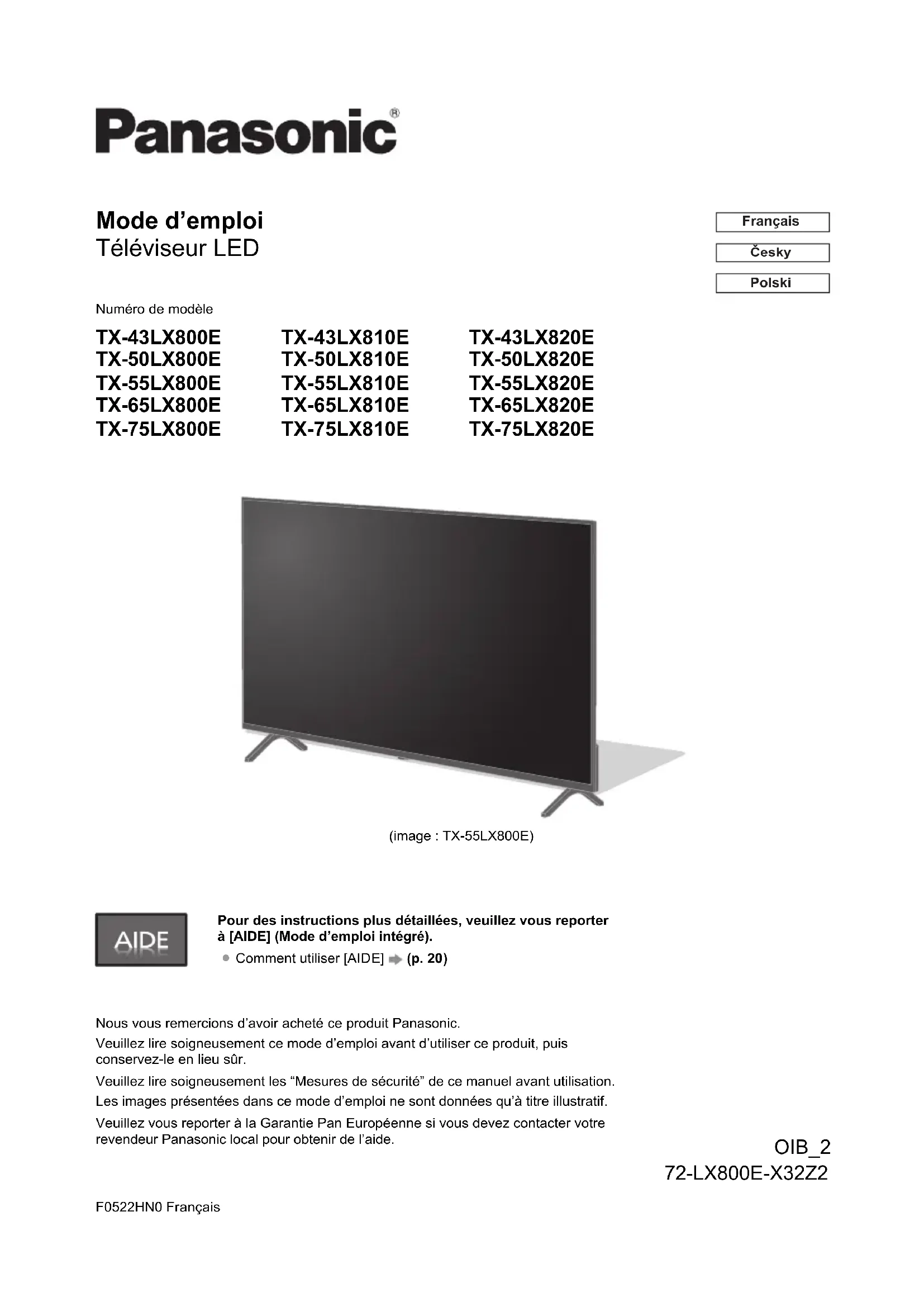 Retrouvez gratuitement la notice de l'appareil TX75LX820E PANASONIC au format PDF.