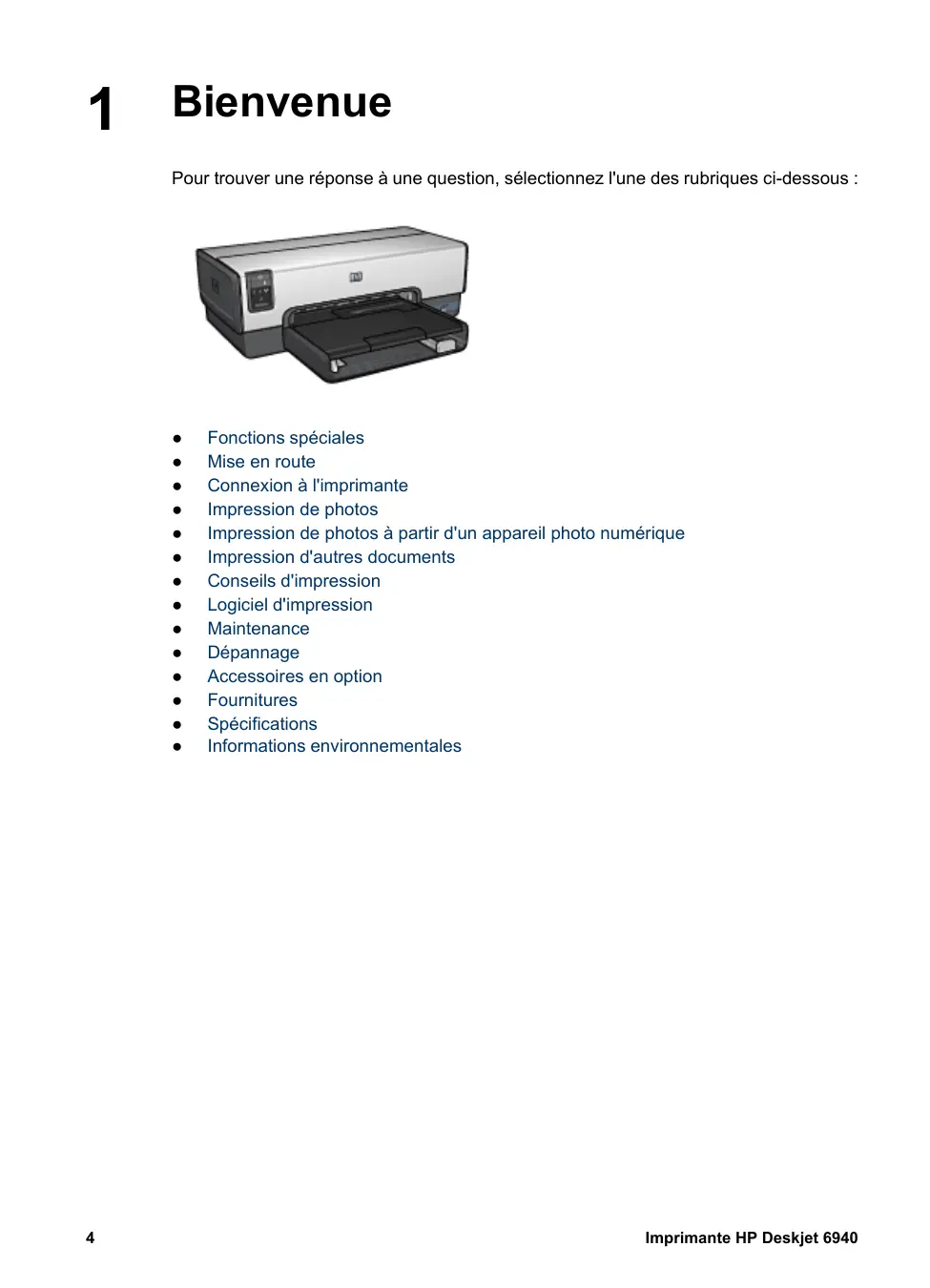 Fonctions spéciales Mise en route Connexion à l'imprimante Impression de photos Impression de photos à partir d'un appareil photo numérique Impression d'autres documents Conseils d'impression Logiciel d'impression Maintenance Dépannage Accessoires en option Fournitures Spécifications Informations environnementales Imprimante HP Deskjet 6940