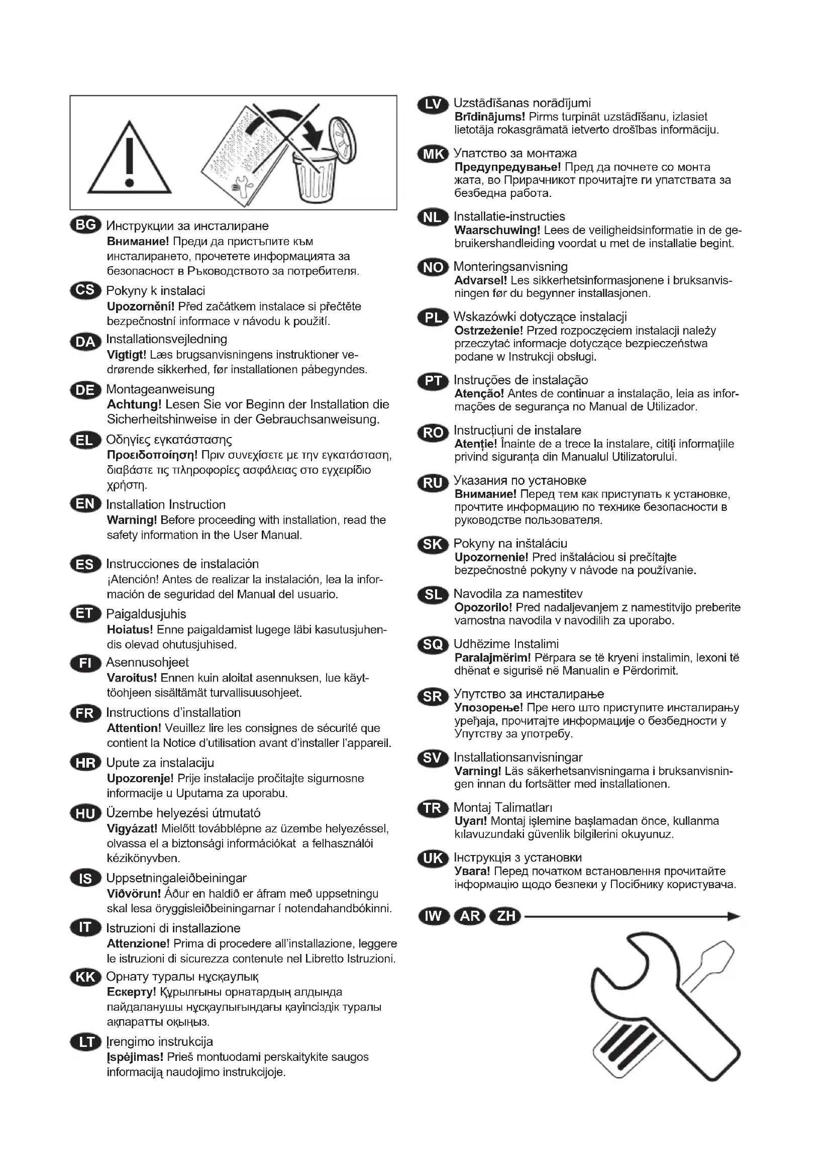 Instructions d’installation Attention! Veuillez lire les consignes de sécurité que contient la Notice d’utilisation avant d’installer l’appareil.