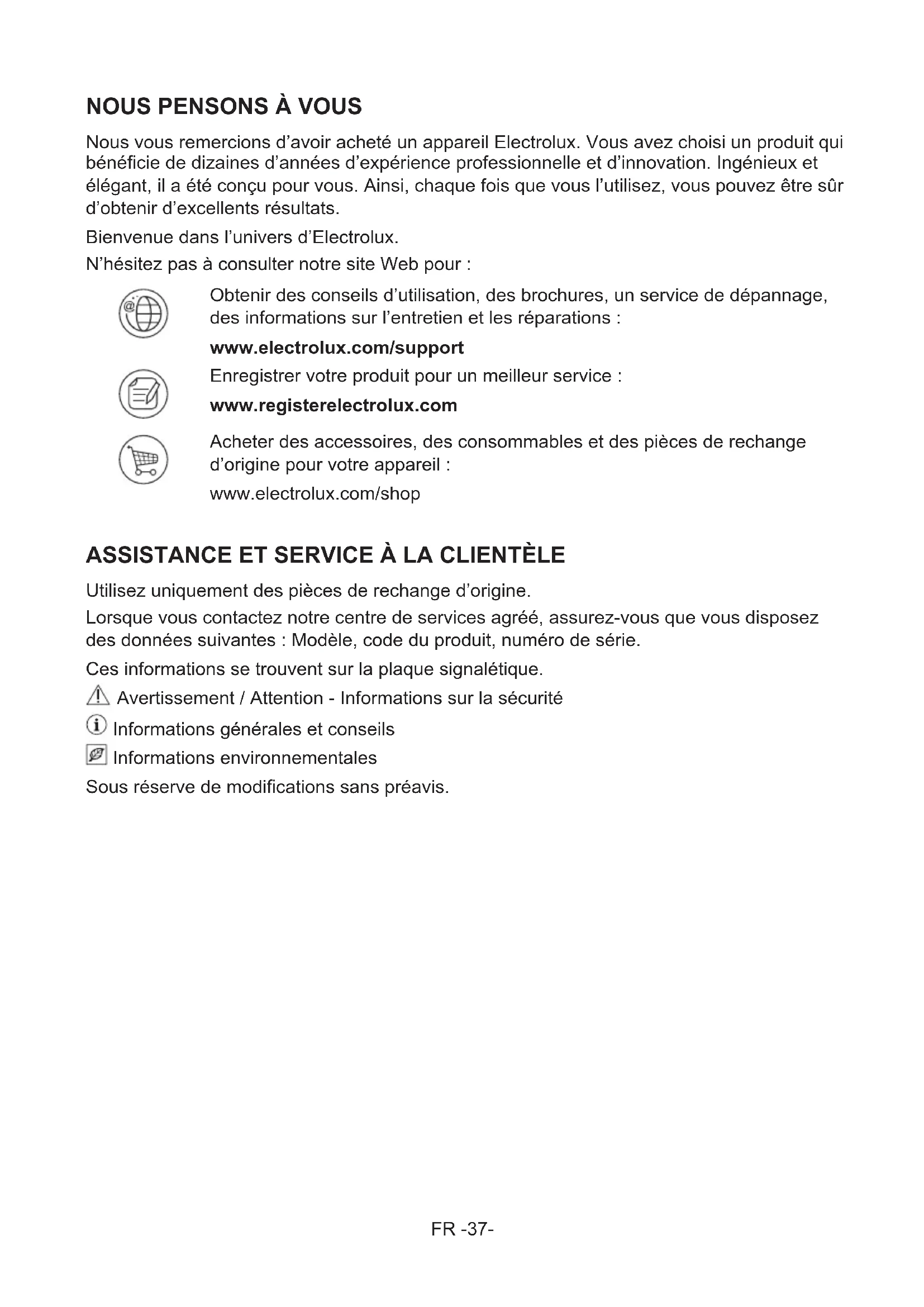 Nous vous remercions d’avoir acheté un appareil Electrolux. Vous avez choisi un produit qui bénécie de dizaines d’années d’expérience professionnelle et d’innovation. Ingénieux et élégant, il a été conçu pour vous. Ainsi, chaque fois que vous l’utilisez, vous pouvez être sûr d’obtenir d’excellents résultats. Bienvenue dans l’univers d’Electrolux. N’hésitez pas à consulter notre site Web pour : Obtenir des conseils d’utilisation, des brochures, un service de dépannage, des informations sur l’entretien et les réparations : www.electrolux.com/support Enregistrer votre produit pour un meilleur service : www.registerelectrolux.com Acheter des accessoires, des consommables et des pièces de rechange d’origine pour votre appareil : www.electrolux.com/shop