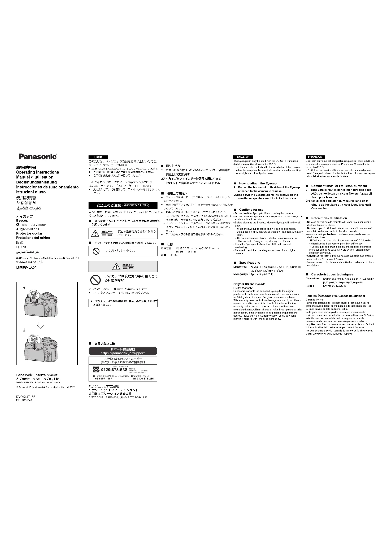 (D)]Mass (Weight):Approx. 9 (0.020 lb)Only for US and CanadaLimited Warranty:Panasonic warrants the enclosed Eyecup to the original purchaser to be free of defects in materials and workmanship for 90 days from the date of original consumer purchase.This warranty does not include damages caused by accidents, misuse or modifications. If the item is defective within the warranty period, we will repair or replace it, with new or refurbished parts, without charge or refund your purchase price at our option, if the Eyecup is sent (postage prepaid) to the address indicated in the warranty section of the operating manual enclosed with lens or camera body.L’œilleton du viseur est compatible uniquement avec le DC-G9, un appareil photo numérique de Panasonic. (À compter de novembre 2017)