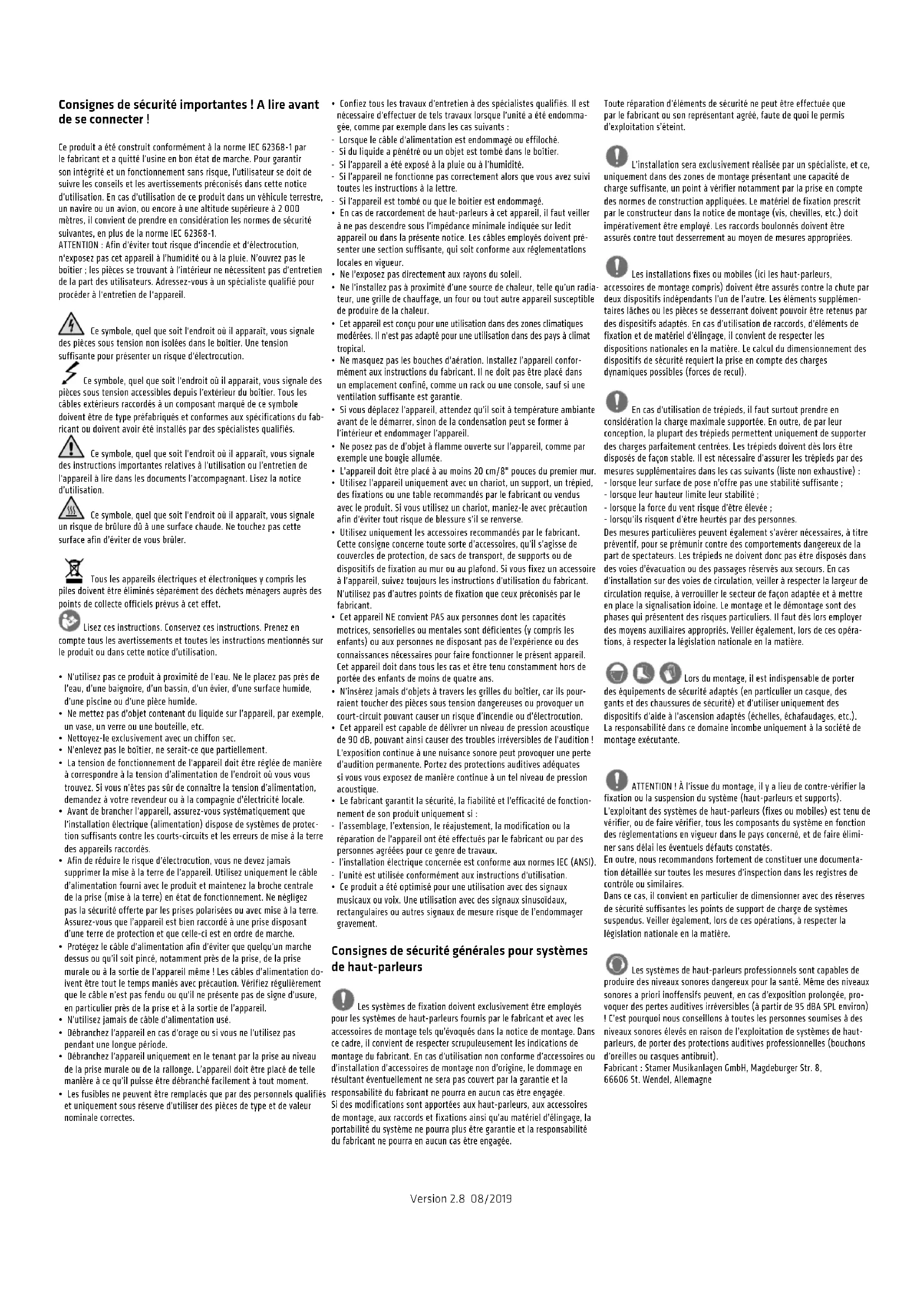 - Ce produit a été optimisé pour une utilisation avec des signaux musicaux ou voix. Une utilisation avec des signaux sinusoïdaux, rectangulaires ou autres signaux de mesure risque de l’endommager gravement. Consignes de sécurité générales pour systèmes de haut-parleurs Les systèmes de fixation doivent exclusivement être employés pour les systèmes de haut-parleurs fournis par le fabricant et avec les accessoires de montage tels qu’évoqués dans la notice de montage. Dans ce cadre, il convient de respecter scrupuleusement les indications de montage du fabricant. En cas d’utilisation non conforme d’accessoires ou d’installation d’accessoires de montage non d’origine, le dommage en résultant éventuellement ne sera pas couvert par la garantie et la responsabilité du fabricant ne pourra en aucun cas être engagée. Si des modifications sont apportées aux haut-parleurs, aux accessoires de montage, aux raccords et fixations ainsi qu’au matériel d’élingage, la portabilité du système ne pourra plus être garantie et la responsabilité du fabricant ne pourra en aucun cas être engagée. Toute réparation d’éléments de sécurité ne peut être effectuée que par le fabricant ou son représentant agréé, faute de quoi le permis d’exploitation s’éteint. L’installation sera exclusivement réalisée par un spécialiste, et ce, uniquement dans des zones de montage présentant une capacité de charge suffisante, un point à vérifier notamment par la prise en compte des normes de construction appliquées. Le matériel de fixation prescrit par le constructeur dans la notice de montage (vis, chevilles, etc.) doit impérativement être employé. Les raccords boulonnés doivent être assurés contre tout desserrement au moyen de mesures appropriées. Les installations fixes ou mobiles (ici les haut-parleurs, accessoires de montage compris) doivent être assurés contre la chute par deux dispositifs indépendants l’un de l’autre. Les éléments supplémen- taires lâches ou les pièces se desserrant doivent pouvoir être retenus par des dispositifs adaptés. En cas d’utilisation de raccords, d’éléments de fixation et de matériel d’élingage, il convient de respecter les dispositions nationales en la matière. Le calcul du dimensionnement des dispositifs de sécurité requiert la prise en compte des charges dynamiques possibles (forces de recul). En cas d’utilisation de trépieds, il faut surtout prendre en considération la charge maximale supportée. En outre, de par leur conception, la plupart des trépieds permettent uniquement de supporter des charges parfaitement centrées. Les trépieds doivent dès lors être disposés de façon stable. Il est nécessaire d’assurer les trépieds par des mesures supplémentaires dans les cas suivants (liste non exhaustive) : - lorsque leur surface de pose n’offre pas une stabilité suffisante; - lorsque leur hauteur limite leur stabilité ; - lorsque la force du vent risque d’être élevée ; - lorsqu’ils risquent d’être heurtés par des personnes. Des mesures particulières peuvent également s’avérer nécessaires, à titre préventif, pour se prémunir contre des comportements dangereux de la part de spectateurs. Les trépieds ne doivent donc pas être disposés dans des voies d’évacuation ou des passages réservés aux secours. En cas d’installation sur des voies de circulation, veiller à respecter la largeur de circulation requise, à verrouiller le secteur de façon adaptée et à mettre en place la signalisation idoine. Le montage et le démontage sont des phases qui présentent des risques particuliers. Il faut dès lors employer des moyens auxiliaires appropriés. Veiller également, lors de ces opéra- tions, à respecter la législation nationale en la matière. Lors du montage, il est indispensable de porter des équipements de sécurité adaptés (en particulier un casque, des gants et des chaussures de sécurité) et d’utiliser uniquement des dispositifs d’aide à l’ascension adaptés (échelles, échafaudages, etc.). La responsabilité dans ce domaine incombe uniquement à la société de montage exécutante. ATTENTION! À l’issue du montage, il y a lieu de contre-vérifier la fixation ou la suspension du système (haut-parleurs et supports). L’exploitant des systèmes de haut-parleurs (fixes ou mobiles) est tenu de vérifier, ou de faire vérifier, tous les composants du système en fonction des réglementations en vigueur dans le pays concerné, et de faire élimi- ner sans délai les éventuels défauts constatés. En outre, nous recommandons fortement de constituer une documenta- tion détaillée sur toutes les mesures d’inspection dans les registres de contrôle ou similaires. Dans ce cas, il convient en particulier de dimensionner avec des réserves de sécurité suffisantes les points de support de charge de systèmes suspendus. Veiller également, lors de ces opérations, à respecter la législation nationale en la matière. Les systèmes de haut-parleurs professionnels sont capables de produire des niveaux sonores dangereux pour la santé. Même des niveaux sonores a priori inoffensifs peuvent, en cas d’exposition prolongée, pro- voquer des pertes auditives irréversibles (à partir de 95 dBA SPL environ) ! C’est pourquoi nous conseillons à toutes les personnes soumises à des niveaux sonores élevés en raison de l’exploitation de systèmes de haut- parleurs, de porter des protections auditives professionnelles (bouchons d’oreilles ou casques antibruit). Fabricant : Stamer Musikanlagen GmbH, Magdeburger Str. 8, 66606 St. Wendel, AllemagneLINEAR 7 1.2