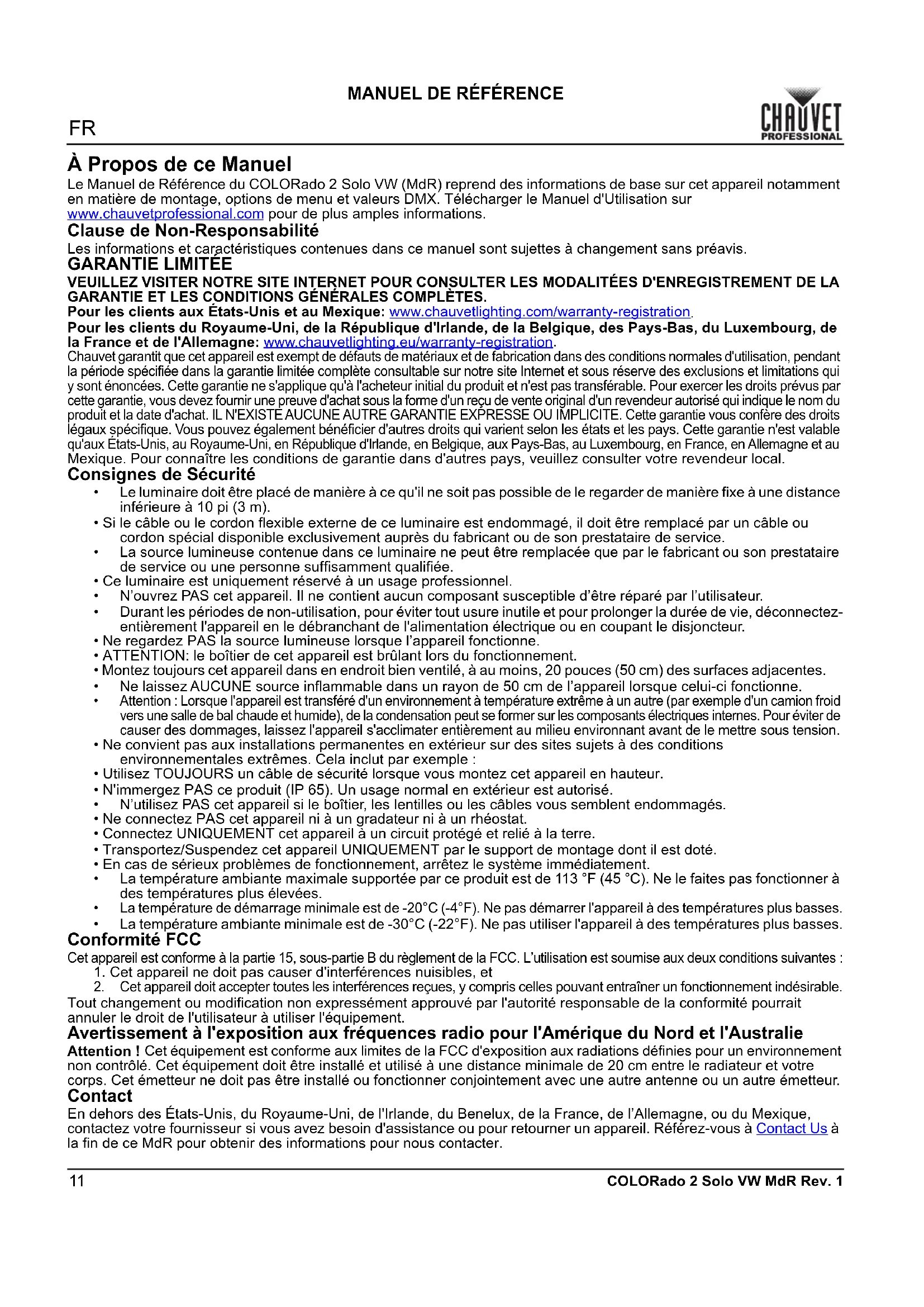 COLORado 2 Solo VW MdR Rev. 1 À Propos de ce Manuel Le Manuel de Référence du COLORado 2 Solo VW (MdR) reprend des informations de base sur cet appareil notamment en matière de montage, options de menu et valeurs DMX. Télécharger le Manuel d'Utilisation sur www.chauvetprofessional.com pour de plus amples informations. Clause de Non-Responsabilité Les informations et caractéristiques contenues dans ce manuel sont sujettes à changement sans préavis.