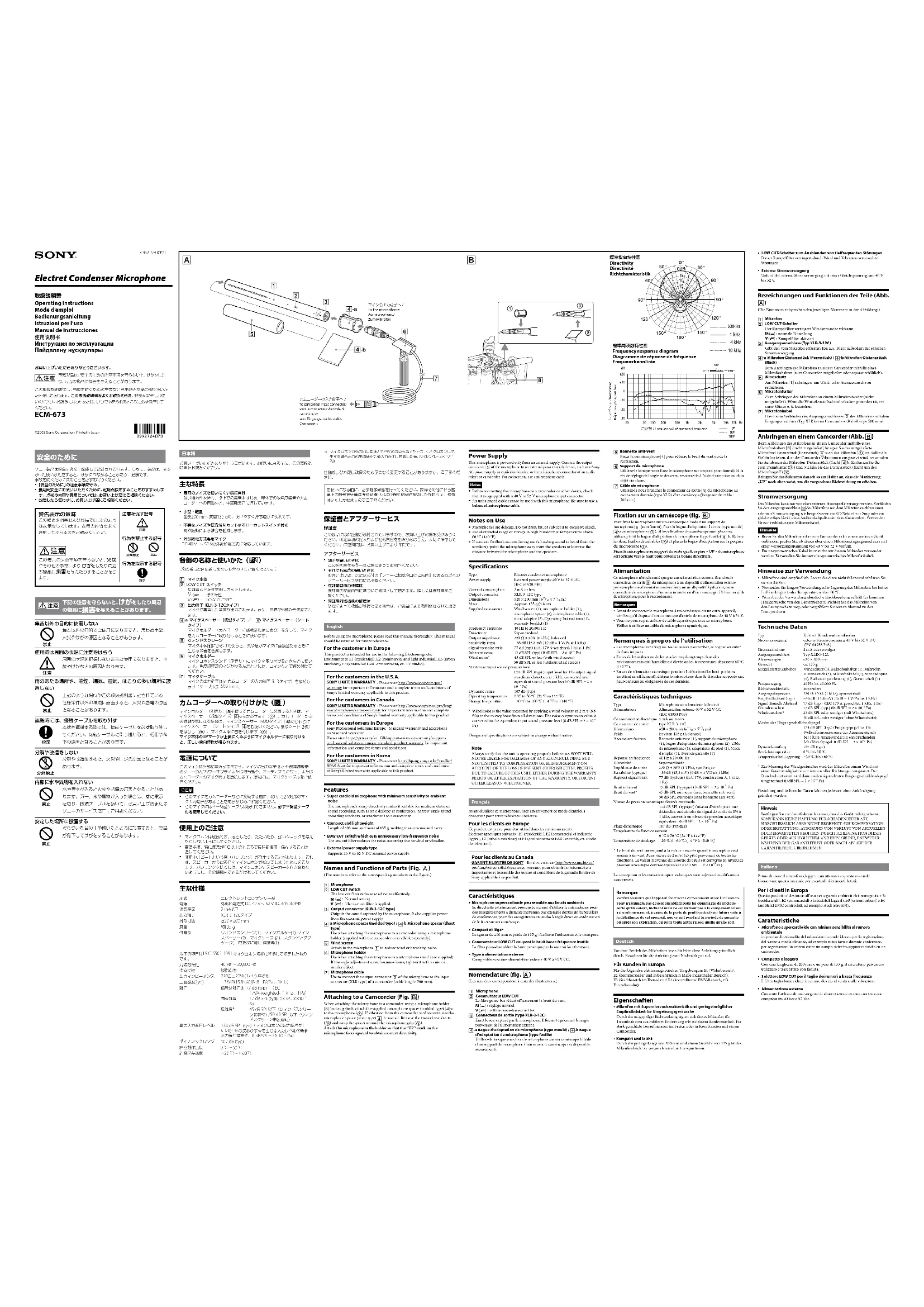 Pa). Design and specifications are subject to change without notice. Note Always verify that the unit is operating properly before use. SONY WILL NOT BE LIABLE FOR DAMAGES OF ANY KIND INCLUDING, BUT NOT LIMITED TO, COMPENSATION OR REIMBURSEMENT ON ACCOUNT OF THE LOSS OF PRESENT OR PROSPECTIVE PROFITS DUE TO FAILURE OF THIS UNIT, EITHER DURING THE WARRANTY PERIOD OR AFTER EXPIRATION OF THE WARRANTY, OR FOR ANY OTHER REASON WHATSOEVER. Français Avant d’utiliser ce microphone, lisez attentivement ce mode d’emploi à conserver pour toute référence ultérieure. Pour les clients en Europe Ce produit est prévu pour être utilisé dans les environnements électromagnétiques suivants : E1 (résidentiel), E2 (commercial et industrie légère), E3 (urbain extérieur) et E4 (environnement EMC contrôlé, ex. studio de télévision). Pour les clients au Canada