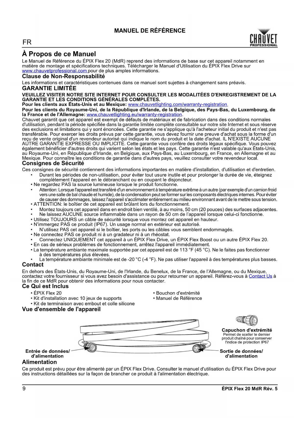 ÉPIX Flex 20 MdR Rév. 5 À Propos de ce Manuel Le Manuel de Référence du ÉPIX Flex 20 (MdR) reprend des informations de base sur cet appareil notamment en matière de montage et spécifications techniques. Télécharger le Manuel d'Utilisation du ÉPIX Flex Drive sur www.chauvetprofessional.com pour de plus amples informations. Clause de Non-Responsabilité Les informations et caractéristiques contenues dans ce manuel sont sujettes à changement sans préavis.