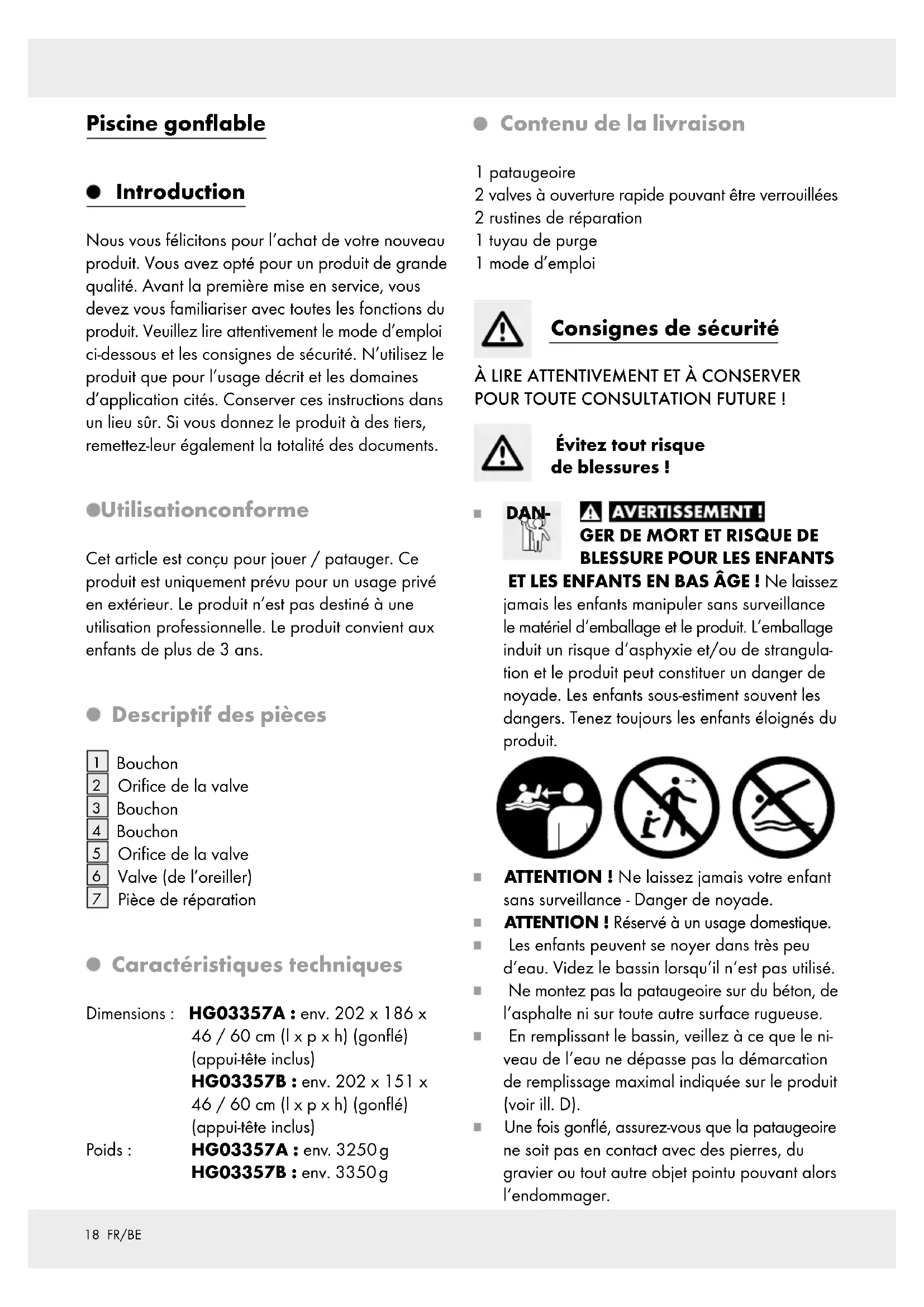 Pièce de réparation Caractéristiques techniques Dimensions : HG03357A : env. 202 x 186 x 46 / 60 cm (l x p x h) (gonflé) (appui-tête inclus) HG03357B : env. 202 x 151 x 46 / 60 cm (l x p x h) (gonflé) (appui-tête inclus) Poids : HG03357A : env. 3250 g HG03357B : env. 3350 g Contenu de la livraison 1 pataugeoire 2 valves à ouverture rapide pouvant être verrouillées 2 rustines de réparation 1 tuyau de purge 1 mode d’emploi Consignes de sécurité