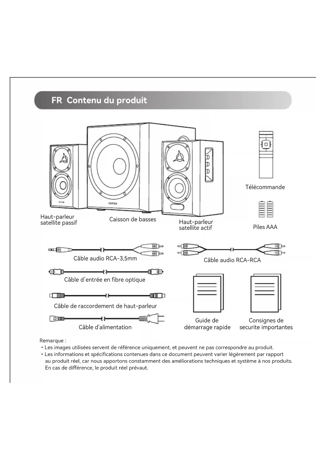 - Les hauts-parleurs d'EDIFIER émettent peu de bruit, tandis que le bruit de fond de ceains dispositifs audio est trop élevé. Veuillez débrancher les câbles audios et augmentez le volume. Si vous ne pouvez pas entendre les hauts-parleurs en vous tenant à 1 mètre d'eux, alors il y a un problème avec ce produit. Pour en savoir plus sur EDIFIER, visitez www.edier.com Pour des demandes relatives à la garantie d'EDIFIER, visitez la page pour votre pays sur www.edier.com et lisez la section intitulée Modalités de garantie. États-Unis et Canada: seice@edier.ca Amérique du Sud: Visitez www.edier.com (anglais) ou www.edierla.com (espagnol/pougais) pour les coordonnées locales.ES Contenido de la caja Altavoz satélite pasivo Altavoz satélite activo Subwoofer Mando a distancia Baterías AAA Guía de inicio rápido Instrucciones de seguridad importantes Cable de audio 3,5mm-RCA Cable de entrada de fibra óptica Cable de alimentación Cable para la conexión de los altavoces Nota: