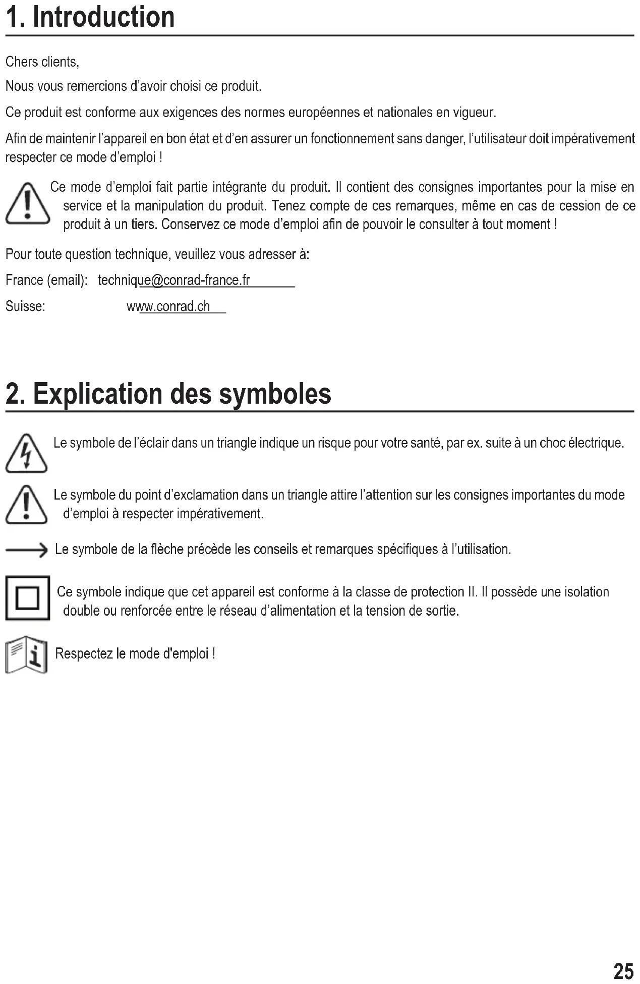 Chers clients, Nous vous remercions d’avoir choisi ce produit. Ce produit est conforme aux exigences des normes européennes et nationales en vigueur. An de maintenir l’appareil en bon état et d’en assurer un fonctionnement sans danger, l’utilisateur doit impérativement respecter ce mode d’emploi ! Ce mode d’emploi fait partie intégrante du produit. Il contient des consignes importantes pour la mise en service et la manipulation du produit. Tenez compte de ces remarques, même en cas de cession de ce produit à un tiers. Conservez ce mode d’emploi an de pouvoir le consulter à tout moment ! Pour toute question technique, veuillez vous adresser à: France (email): technique@conrad-france.fr Suisse: www.conrad.ch