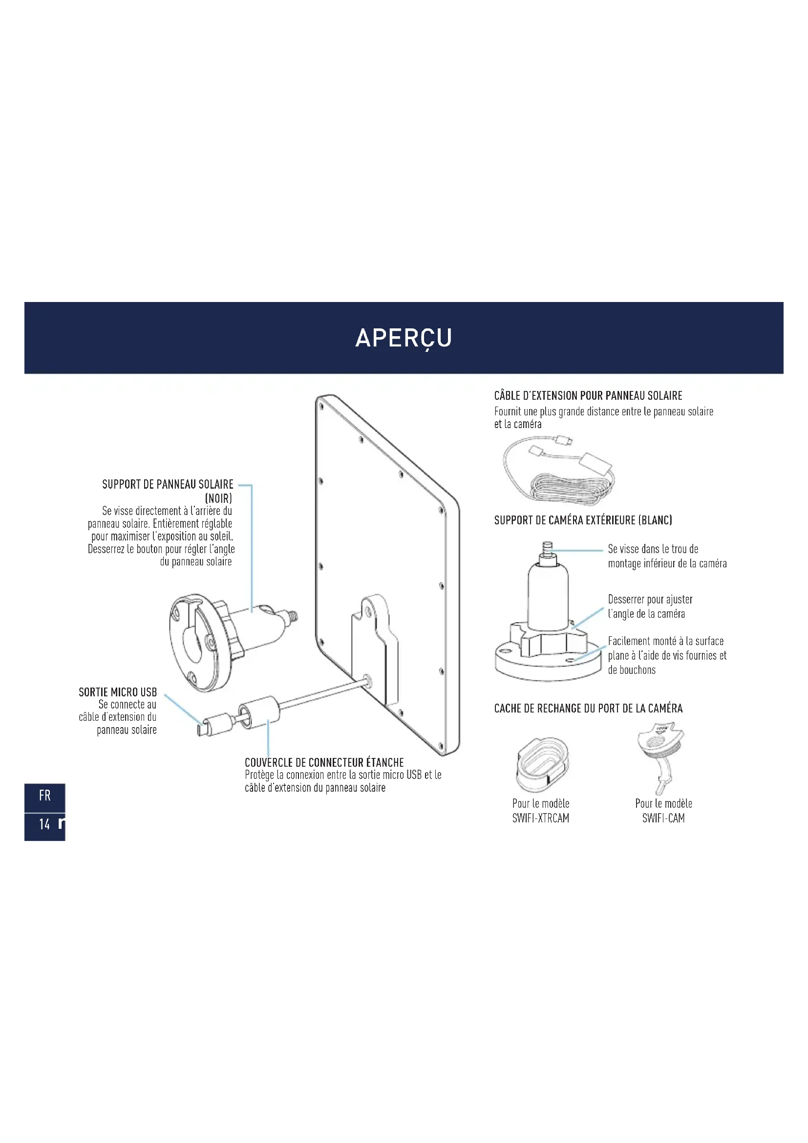 Protège la connexion entre la sortie micro USB et le câble d’extension du panneau solaire CÂBLE D’EXTENSION POUR PANNEAU SOLAIRE Fournit une plus grande distance entre le panneau solaire et la caméra Pour le modèle SWIFI-CAM Se visse dans le trou de montage inférieur de la caméra Desserrer pour ajuster l’angle de la caméra Facilement monté à la surface plane à l’aide de vis fournies et de bouchons Pour le modèle SWIFI-XTRCAM APERÇU15