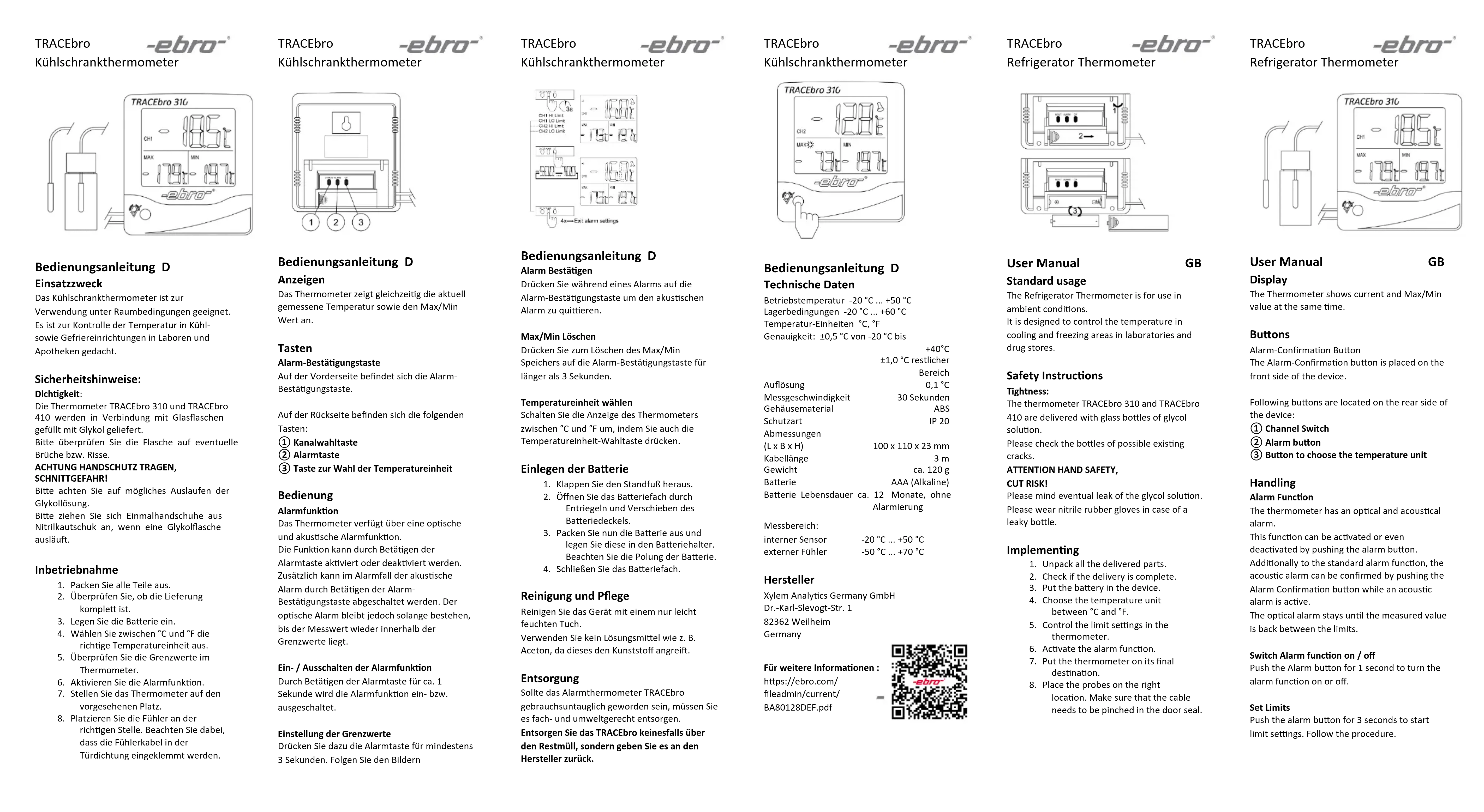 usage, il doit être mis au rebut dans le respect de l’environnement. TRACEbro Thermomètre frigo Mode d‘emploi FR Données techniques Température d’utilisation -20 °C … +50 °C Température de stockage -20 °C … +60 °C Unités de température °C, °F Précision (EMT) ±0.5 °C (-20 °C … +40 °C) ±1.0 °C pour le reste de l’étendue de mesure Résolution 0.1 °C Temps de réponse 30 secondes Type de boîtier ABS Indice de protection IP 20 Dimensions (l x L x H) 100 x 110 x 23 mm Longueur du câble 3 m Poids app. 120 g Type de pile AAA (Alkaline) Durée de vie de la pile env. 12 mois sans utilisation de l’alarme Etendue de mesure: Canal interne -20 °C ... +50 °C Canal externe -50 °C ... +70 °C Fabricant Xylem Analytics Germany GmbH Dr.-Karl-Slevogt-Str. 1 82362 Weilheim Germany Pour plus d’informations : https://ebro.com/ fileadmin/current/ BA80128DEF.pdf