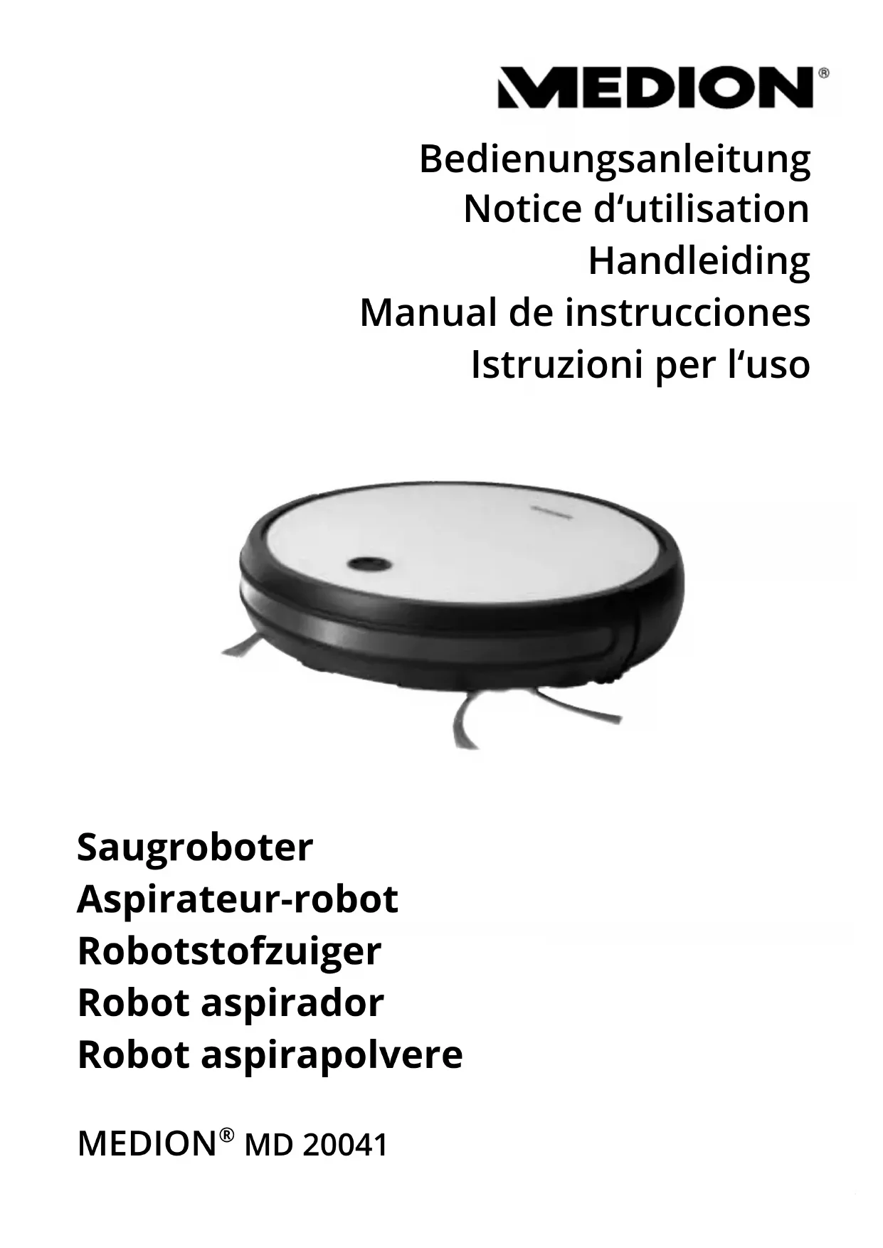 AVERTISSEMENT! Risque de blessure! Risque de blessure pour les enfants et les personnes présentant des capacités physiques, sensorielles ou mentales restreintes (p.ex.personnes partiellement handicapées, personnes âgées avec diminution de leurs capacités physiques et mentales) ou manquant d’expérience et/ou de connaissances (p.ex.enfants plus âgés). Conservez l’appareil et les accessoires dans un endroit hors de portée des enfants. Cet appareil peut être utilisé par des enfants âgés de plus de 8ans et par des personnes présentant des capacités phy- siques, sensorielles ou mentales restreintes ou manquant d’expérience et/ou de connaissances, s’ils sont surveillés ou s’ils ont reçu des instructions pour pouvoir utiliser l’appareil en toute sécurité et ont compris les dangers en résultant. Les enfants ne doivent pas jouer avec l’appareil. Le nettoyage et la maintenance de l’appareil par l’utilisateur ne doivent pas être effectués par des enfants, sauf si ceux-ci sont âgés de 8ans et plus et sont surveillés. Conservez l’appareil et l’adaptateur secteur/le cordon d’ali- mentation hors de portée des enfants de moins de 8ans. DANGER! Risque de suffocation! Il existe un risque de suffocation en cas d’inhalation ou d’ingestion de films ou de petites pièces. Conservez les emballages hors de portée des enfants. 20041 ML DS ML Content 5006 7669 RC2.indb 4720041 ML DS ML Content 5006 7669 RC2.indb 47 05.05.2021 09:14:2905.05.2021 09:14:2948 DANGER! Risque d’électrocution! Pièces sous tension. Les pièces sous tension présentent un risque de choc électrique/court-circuit. Pour recharger la batterie, utilisez l’adaptateur secteur et la station de charge fournis. Utilisez l’adaptateur secteur uniquement dans des pièces sèches. Branchez l’adaptateur secteur uniquement sur une prise de courant réglementaire et facilement accessible. La tension secteur locale doit correspondre à celle indiquée dans les ca- ractéristiques techniques de l’adaptateur secteur. La prise de courant doit rester accessible, s’il devait s’avérer nécessaire de débrancher rapidement l’appareil. Pour débrancher le cordon d’alimentation de la prise, ne tirez jamais sur le cordon, mais toujours au niveau de la fiche. Veil- lez à ne pas plier ou écraser le cordon d’alimentation. Si la fiche, le cordon d’alimentation, la station de charge ou l’appareil est endommagé ou si des liquides ou des corps étrangers ont pénétré à l’intérieur de l’appareil, débranchez immédiatement la fiche de la prise de courant. Utilisez l’appareil uniquement dans des pièces fermées et ne l’exposez jamais à des gouttes d’eau ou à des éclaboussures. Ne touchez pas l’appareil avec les mains mouillées pendant que vous le rechargez. Avant la première utilisation et après chaque utilisation, véri- fiez l’état de l’aspirateur robot ainsi que du cordon d’alimenta- tion. Ne mettez pas l’appareil en marche si l’aspirateur robot, la station de charge ou le cordon d’alimentation présente des dommages visibles. Si vous constatez un dommage causé lors du transport, adres- sez-vous immédiatement au SAV MEDION. 20041 ML DS ML Content 5006 7669 RC2.indb 4820041 ML DS ML Content 5006 7669 RC2.indb 48 05.05.2021 09:14:3205.05.2021 09:14:3249