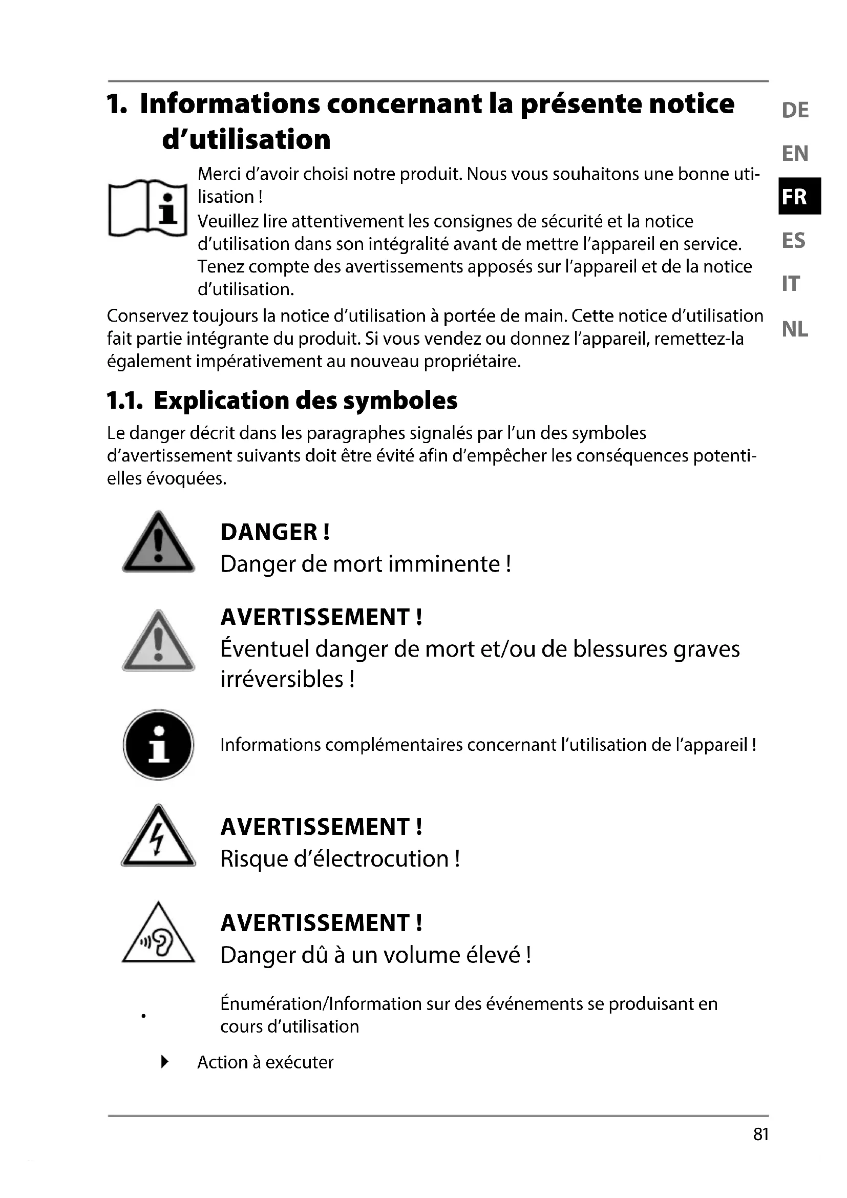 d’utilisation Merci d’avoir choisi notre produit. Nous vous souhaitons une bonne uti- lisation! Veuillez lire attentivement les consignes de sécurité et la notice d’utilisation dans son intégralité avant de mettre l’appareil en service. Tenez compte des avertissements apposés sur l’appareil et de la notice d’utilisation. Conservez toujours la notice d’utilisation à portée de main. Cette notice d’utilisation fait partie intégrante du produit. Si vous vendez ou donnez l’appareil, remettez-la également impérativement au nouveau propriétaire. 1.1. Explication des symboles Le danger décrit dans les paragraphes signalés par l’un des symboles d’avertissement suivants doit être évité afin d’empêcher les conséquences potenti- elles évoquées. DANGER! Danger de mort imminente! AVERTISSEMENT! Éventuel danger de mort et/ou de blessures graves irréversibles! Informations complémentaires concernant l’utilisation de l’appareil! AVERTISSEMENT! Risque d’électrocution! AVERTISSEMENT! Danger dû à un volume élevé!