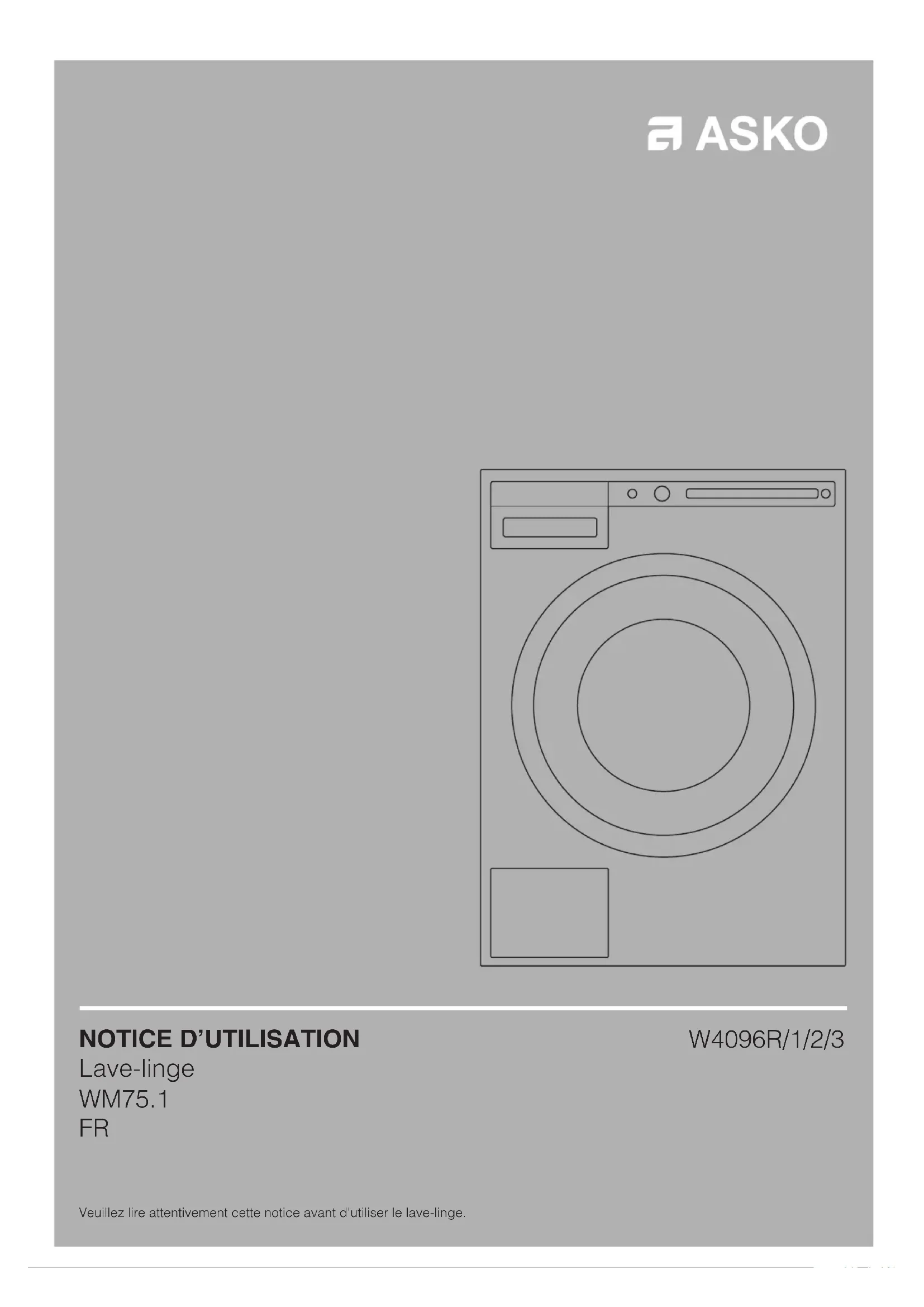 Veuillez lire attentivement cette notice avant d'utiliser le lave-linge. W4096R/1/2/32 Consignes de sécurité 3 Description du lave-linge 6 Tiroir à produits lessiviels 6 Avant d'utiliser l'appareil pour la première fois 7 Installation et raccordement 10 Conseils préliminaires au lavage 17 Les étapes du lavage (1 à 7) 20 Réglages système 32 Fonctions spéciales 36 Notice originale Voir Guide de mise en service rapide sur la dernière page. Chère Cliente, Cher Client, Nous vous remercions d'avoir choisi ce produit de qualité ASKO. Nous espérons qu'il répondra à vos attentes. Le design scandinave associe des lignes pures, des fonctionnalités adaptées au quotidien et une excellente qualité. Tous nos produits bénéfi cient de ces caractéristiques essentielles qui justifi ent leur succès dans le monde entier. Nous vous recommandons de lire d'abord cette notice avant d'utiliser votre appareil pour la première fois. Ce manuel vous indique aussi comment vous pouvez contribuer à la protection de l'environnement. SOMMAIRE Nettoyage et entretien 40 Que faire en cas de problèmes ? 45 Service après-vente 52 Informations techniques 53 Tableau des programmes et consommations 56 Tableau : mode de lavage/température 59 Tableau des options 60 Mise au rebut 61 Guide d'utilisation rapide 63 Les pictogrammes figurant dans cette notice ont les significations suivantes : Informations, conseils, astuces, ou recommandations Attention – risque de brûlure Attention – danger Attention – risque d'incendie Attention – risque de choc électrique3