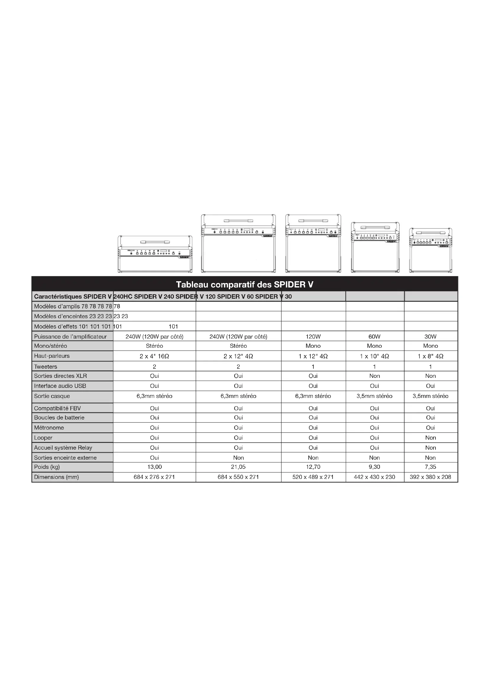 SPIDER V 240 SPIDER V 120 SPIDER V 60 SPIDER V 30 Manuel de pilotage 40-00-0424 Ver. C www.line6.com/manuals © 2021 Yamaha Guitar Group, Inc. Tous droits réservés.Tableau comparatif des SPIDER V Caractéristiques SPIDER V 240HC SPIDER V 240 SPIDER V 120 SPIDER V 60 SPIDER V 30 Modèles d’amplis 78 78 78 78 78 Modèles d’enceintes 23 23 23 23 23 Modèles d’eets 101 101 101 101 101 Puissance de l’amplicateur 240W (120W par côté) 240W (120W par côté) 120W 60W 30W Mono/stéréo Stéréo Stéréo Mono Mono Mono Haut-parleurs 2 x 4" 16Ω 2 x 12" 4Ω 1 x 12" 4Ω 1 x 10" 4Ω 1 x 8" 4Ω Tweeters 2 2 1 1 1 Sorties directes XLR Oui Oui Oui Non Non Interface audio USB Oui Oui Oui Oui Oui Sortie casque 6,3mm stéréo 6,3mm stéréo 6,3mm stéréo 3,5mm stéréo 3,5mm stéréo Compatibilité FBV Oui Oui Oui Oui Oui Boucles de batterie Oui Oui Oui Oui Oui Métronome Oui Oui Oui Oui Oui Looper Oui Oui Oui Oui Non Accueil système Relay Oui Oui Oui Oui Non Sorties enceinte externe Oui Non Non Non Non Poids (kg) 13,00 21,05 12,70 9,30 7,35 Dimensions (mm) 684 x 276 x 271 684 x 550 x 271 520 x 489 x 271 442 x 430 x 230 392 x 380 x 208Présentation Bienvenue au manuel de pilotage pour la série Line 6
