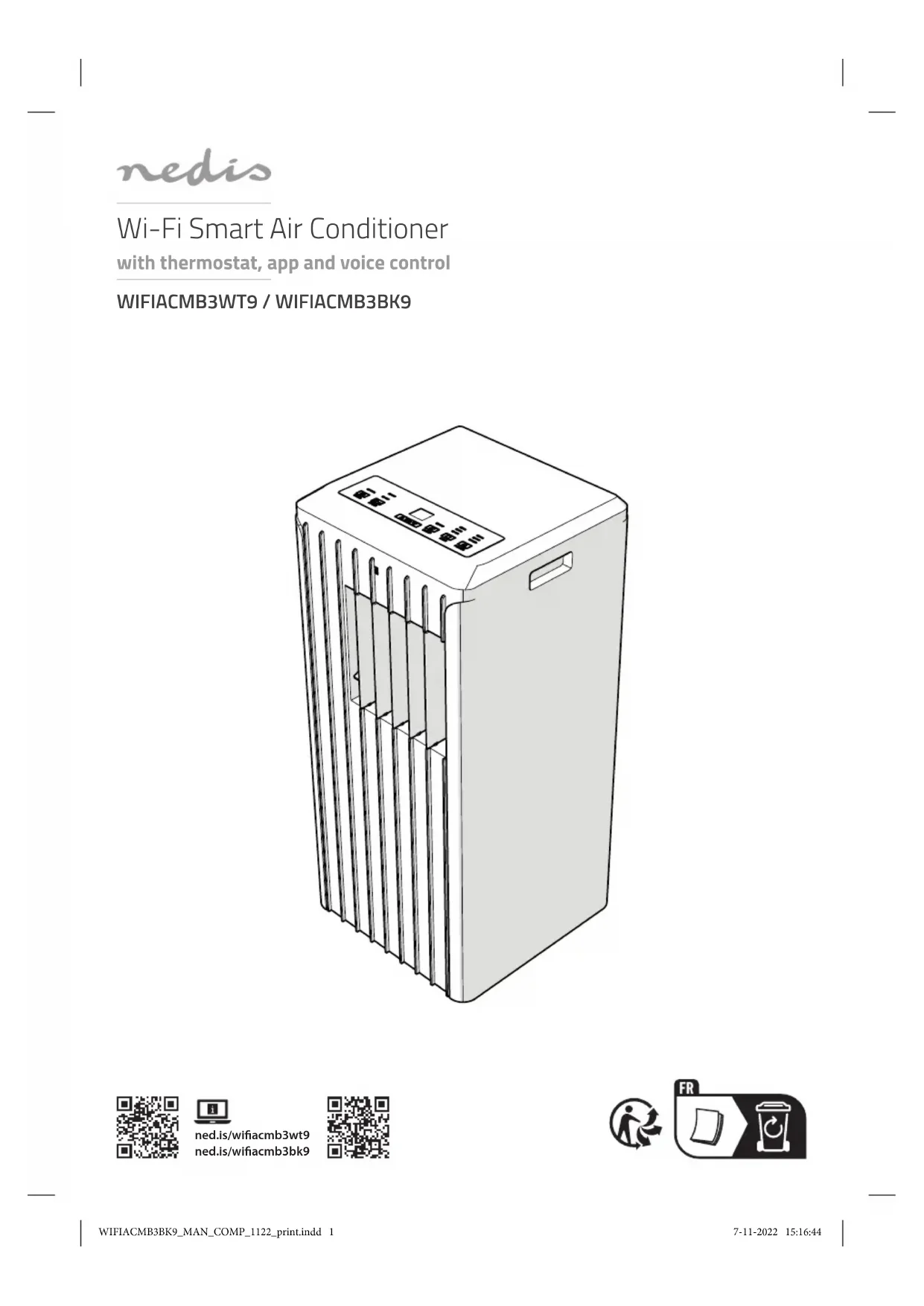 Guide de démarrage rapide Climatiseur Wi-Fi Smart WIFIACMB3WT9 WIFIACMB3BK9Pour plus d'informations, consultez le manuel détaillé en ligne : ned.is/wiacmb3wt9 ned.is/wiacmb3bk9 Utilisation prévue Le WIFIACMB3WT9 / WIFIACMB3BK9 Nedis est un climatiseur mobile utilisé pour le refroidissement et la déshumidication des pièces.Le produit est exclusivement conçu comme un climatiseur mobile pour une utilisation domestique en intérieur.Toute modication du produit peut avoir des conséquences sur la sécurité, la garantie et le bon fonctionnement.Ce produit peut être utilisé par des enfants âgés de 8 ans et plus ainsi que des personnes ayant des capacités physiques, sensorielles ou mentales réduites ou manquant d’expérience et de connaissances s’ils sont supervisés ou ont reçu des instructions sur l’utilisation du produit en toute sécurité et comprennent les dangers impliqués. Les enfants ne doivent pas jouer avec le produit. Le nettoyage et la maintenance ne doivent pas être eectués par des enfants sans surveillance.Le produit est destiné à être utilisé dans des environnements domestiques pour des fonctions de ménage typiques qui peuvent également être réalisées par des utilisateurs non experts pour des fonctions de ménage typiques, tels que : des magasins, bureaux, autres environnements de travail similaires, fermes, par des clients dans des hôtels, motels et autres environnements de type résidentiel et/ou dans des environnements de type chambres d'hôtes.Le produit n’est pas destiné à un usage professionnel. Pièces principales (image A) 1 Panneau de commande 2 Poignée 3 Aérateurs à lames pivotantes 4 Buse d'évacuation 5 Tuyau d’évacuation 6 Kit de fenêtre 7 Fixations pour kit de fenêtre 8 Rangement du câble d'alimentation 9 Sortie d’air q Sortie de vidange w Câble d'alimentation e Raccord de tuyau d'évacuation r Télécommande t Vis de la buse d'évacuation Achage et télécommande (image B ) 1 Écran d’achage 2 Voyant Full (Plein) 3 Indicateur Wi-Fi 4 Bouton de minuterie 5 Bouton de Vitesse 6 Bouton haut 7 Bouton Bas 8 Bouton de sommeil 9 Bouton mode q Bouton d’alimentation Consignes de sécurité Icône DescriptionIndication pour expliquer que le produit :• Contient un ou plusieurs composants (extrêmement / hautement) inammables.• contient un ou plusieurs composants pyrophoriques qui s'enamment spontanément s'ils sont exposés à l'air,• contient un ou plusieurs composants pyrophoriques auto-échauants et pouvant prendre feu,• contient un ou plusieurs composants pyrophoriques libérant des gaz inammables et pouvant s'enammer spontanément au contact de l'eau. AVERTISSEMENT• Assurez-vous d'avoir entièrement lu et compris les instructions de ce document avant d'installer ou d'utiliser le produit. WIFIACMB3BK9_MAN_COMP_1122_print.indd 9WIFIACMB3BK9_MAN_COMP_1122_print.indd 9 7-11-2022 15:16:467-11-2022 15:16:4610 Assembler la vidange continue (en option)