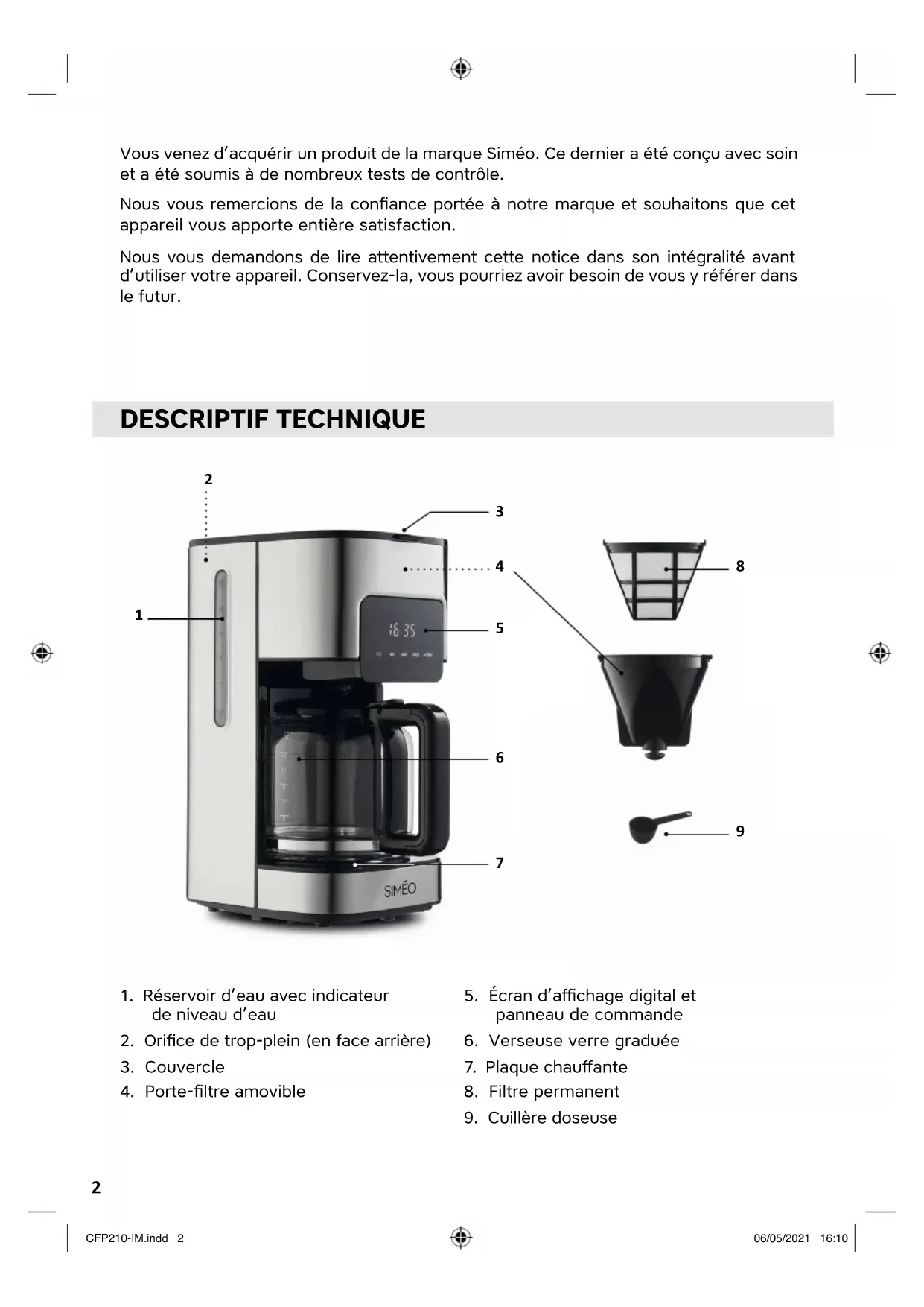 CFP210-IM.indd 1CFP210-IM.indd 1 06/05/2021 16:1006/05/2021 16:102 Vous venez d’acquérir un produit de la marque Siméo. Ce dernier a été conçu avec soin et a été soumis à de nombreux tests de contrôle. Nous vous remercions de la conance portée à notre marque et souhaitons que cet appareil vous apporte entière satisfaction. Nous vous demandons de lire attentivement cette notice dans son intégralité avant d’utiliser votre appareil. Conservez-la, vous pourriez avoir besoin de vous y référer dans le futur. DESCRIPTIF TECHNIQUE