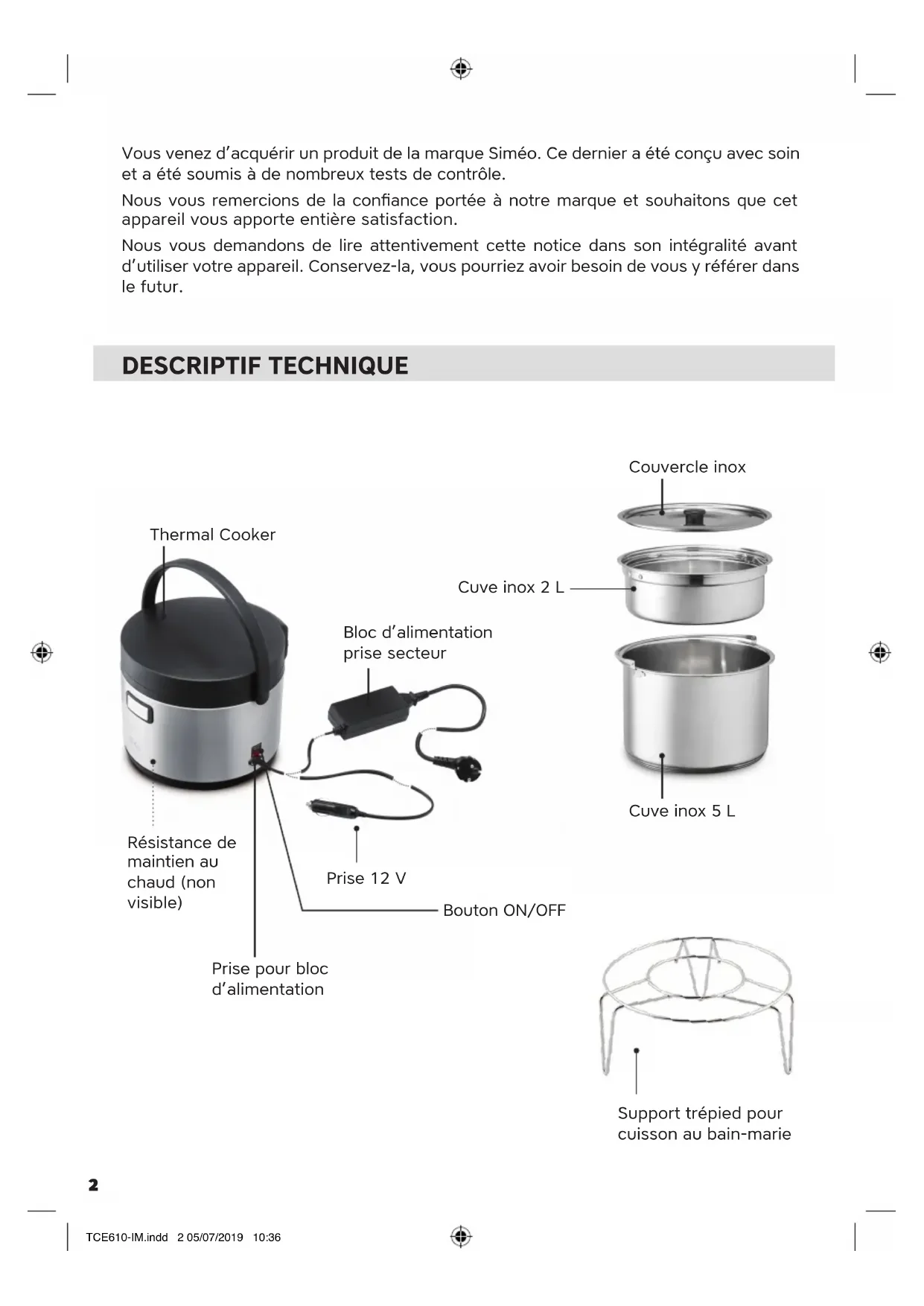 - Le Thermal Cooker doit être impérative- ment alimenté en très basse tension. TCE610-IM.indd 3 05/07/2019 10:364