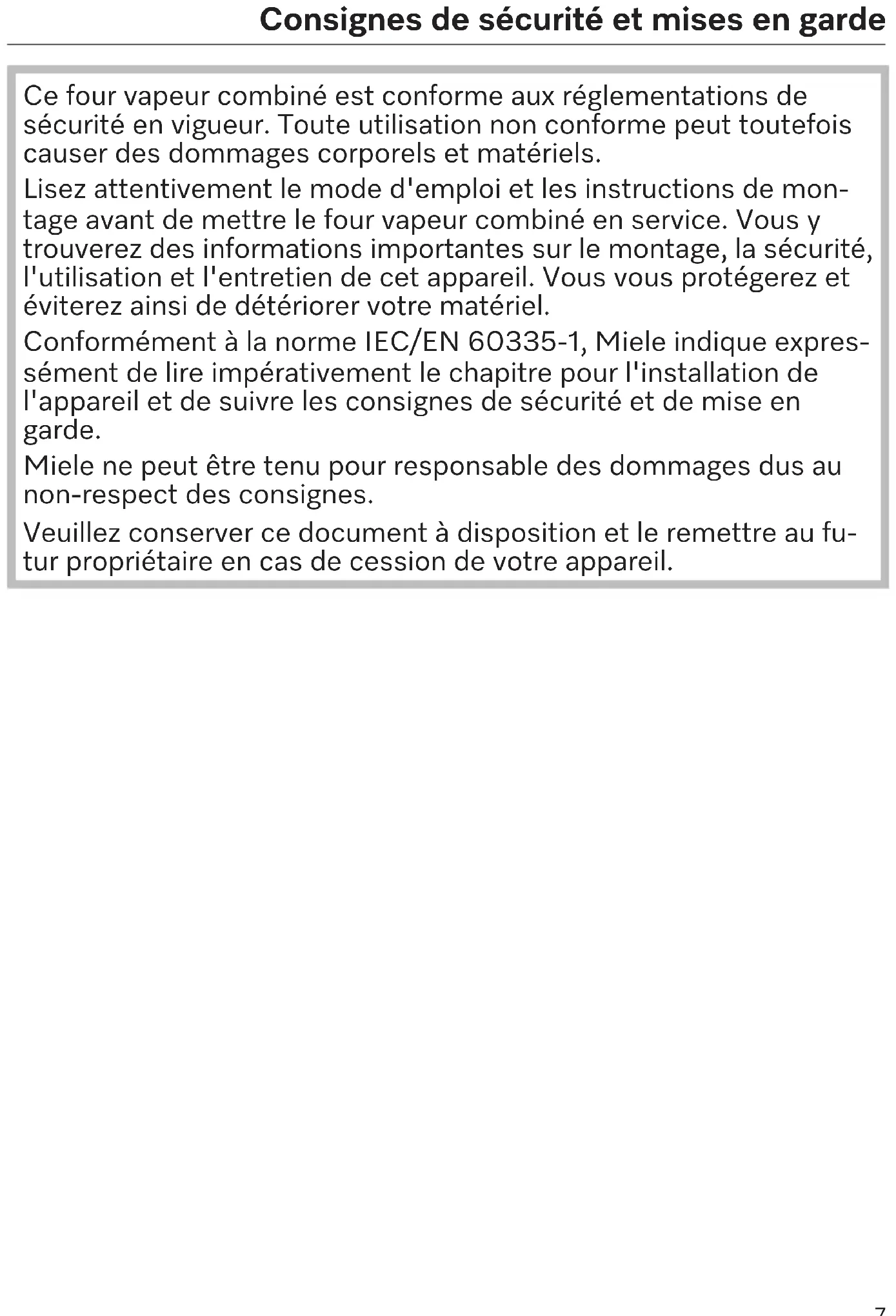 Ce four vapeur combiné est conforme aux réglementations de sécurité en vigueur. Toute utilisation non conforme peut toutefois causer des dommages corporels et matériels. Lisez attentivement le mode d'emploi et les instructions de mon- tage avant de mettre le four vapeur combiné en service. Vous y trouverez des informations importantes sur le montage, la sécurité, l'utilisation et l'entretien de cet appareil. Vous vous protégerez et éviterez ainsi de détériorer votre matériel. Conformément à la norme IEC/EN60335-1, Miele indique expres- sément de lire impérativement le chapitre pour l'installation de l'appareil et de suivre les consignes de sécurité et de mise en garde. Miele ne peut être tenu pour responsable des dommages dus au non-respect des consignes. Veuillez conserver ce document à disposition et le remettre au fu- tur propriétaire en cas de cession de votre appareil.Consignes de sécurité et mises en garde