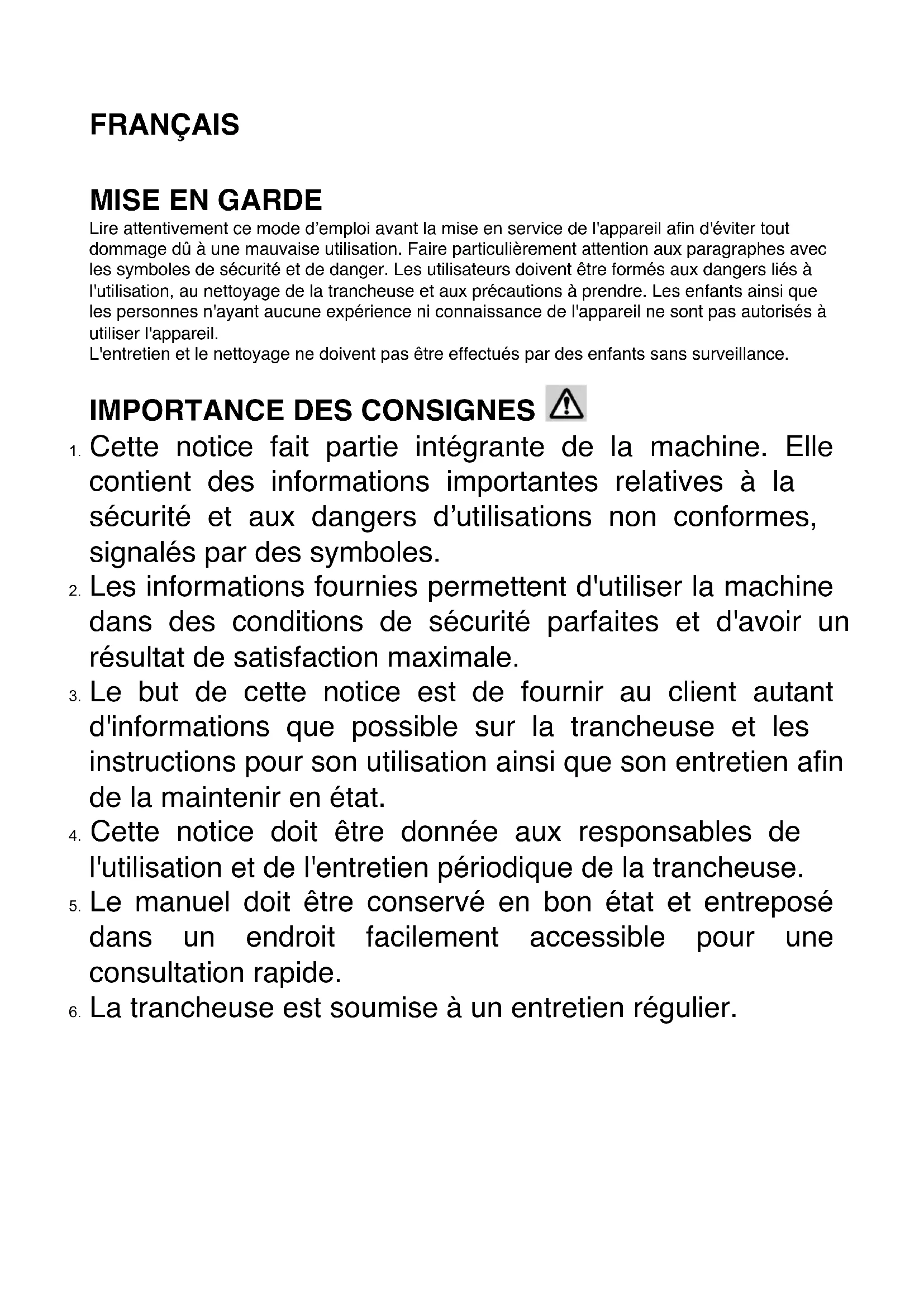 Lire attentivement ce mode d’emploi avant la mise en service de l'appareil afin d'éviter tout dommage dû à une mauvaise utilisation. Faire particulièrement attention aux paragraphes avec les symboles de sécurité et de danger. Les utilisateurs doivent être formés aux dangers liés à l'utilisation, au nettoyage de la trancheuse et aux précautions à prendre. Les enfants ainsi que les personnes n'ayant aucune expérience ni connaissance de l'appareil ne sont pas autorisés à utiliser l'appareil. L'entretien et le nettoyage ne doivent pas être effectués par des enfants sans surveillance.