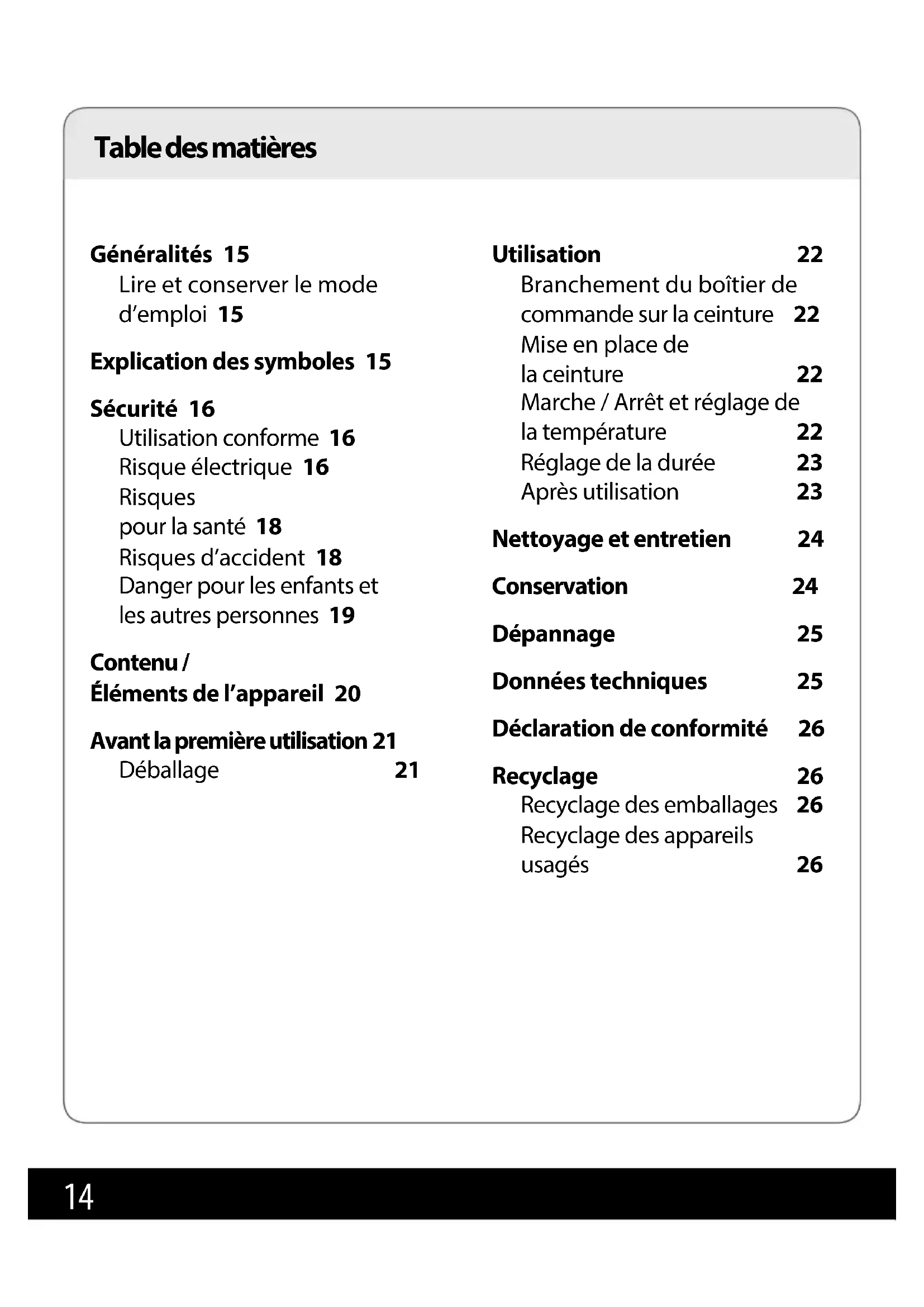 - Cet appareil doit être utilisé exclusive- ment à l’intérieur et à l’abri de l’humidité. Risque électrique Le boîtier de com- mande et la prise ne doivent pas être exposés à des gouttes ou des projections d’eau. Ne ja- mais plonger ces éléments dans l’eau ou d’autres liquides. Si un liquide pénètre à l’intérieur, il existe un risque de choc électrique. Après lavage, attendre le séchage com- plet de la ceinture avant de l’utiliser à nouveau.