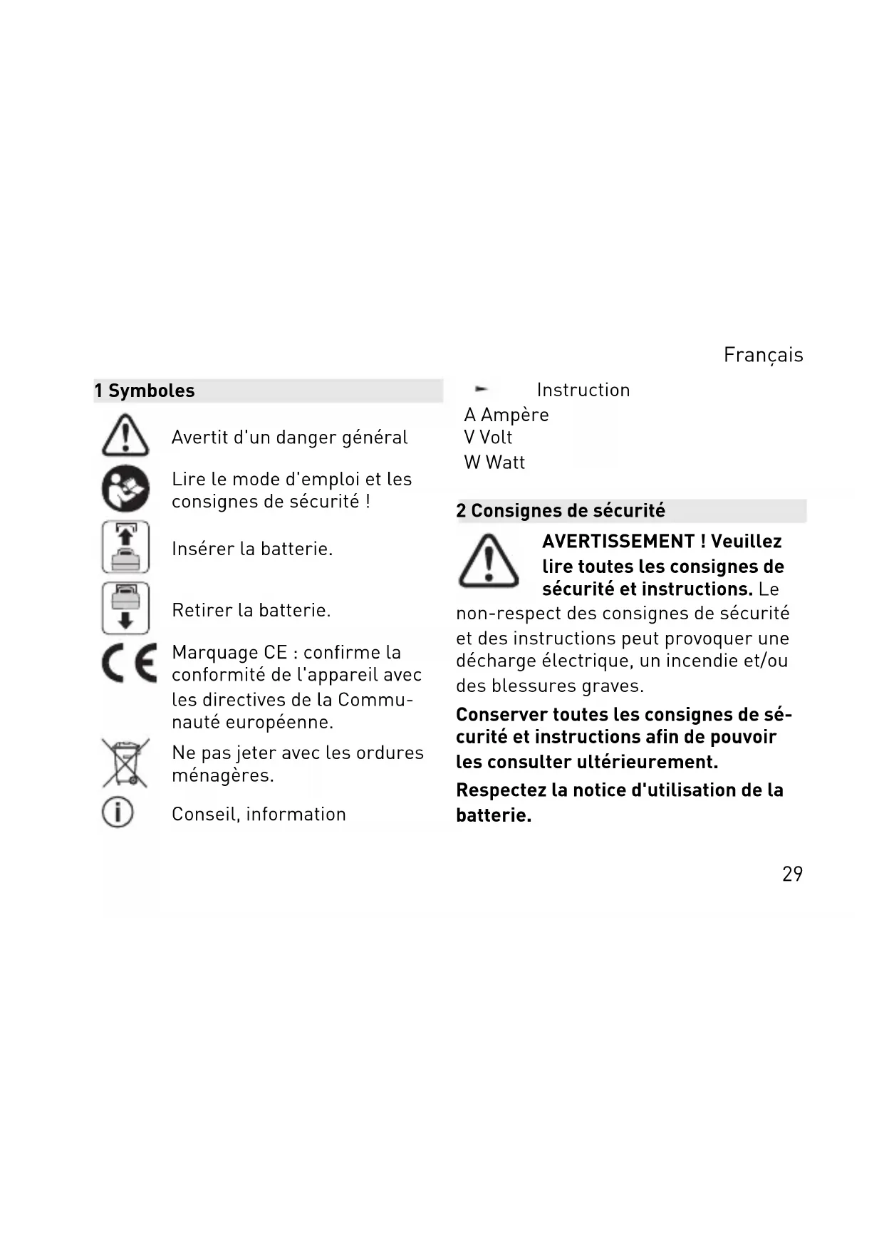 communications (FCC) Déclaration concernant les interférences Rem. : cet appareil a été soumis à des tests qui ont permis de constater sa conformité aux limites applicables aux appareils numériques de la classe B Français 36suivant la partie 15 du règlement de la FCC . Ces limites sont conçues pour of frir une protection raisonnable contre les interférences nuisibles dans un en vironnement domestique. Cet appareil génère, utilise et peut émettre de l'énergie de radiofréquence et, s'il n'est pas installé et utilisé conformément à ces instructions, peut provoquer des in terférences nuisibles pour les radio communications. Cependant, il n'existe aucune garantie que ces interférences ne se produiront pas dans une installa tion quelconque. Si cet appareil provo que des interférences nuisibles pour la réception radiophonique ou télévisuelle, ce qui peut être déterminé en éteignant l'appareil puis en le rallumant, l'utilisa teur est invité à essayer de remédier aux interférences en prenant une ou plusieurs des mesures suivantes : – Modifier l'orientation de l'antenne de réception ou la changer de place. – Augmenter la distance entre l'appa reil et le récepteur. – Brancher l'appareil dans la prise d'un circuit différent de celui auquel le ré cepteur est branché. – Demander de l'aide au revendeur ou à un technicien radio/TV expérimenté. Rem. : en cas de changements ou modi fications effectué(e)s sans l'approbation expresse du responsable de la confor mité, l'utilisateur risque de ne plus être autorisé à se servir de l'appareil. Français 371 Símbolos Aviso de peligro general ¡Leer el manual de instruc ciones y las indicaciones de seguridad! Insertar la batería. Extraer la batería. Marcado CE: Certifica la con formidad de la herramienta con las directivas de la Comu nidad Europea. No depositar en la basura do méstica. Consejo, indicación Guía de procedimiento A Amperios V Voltio W Vatio 2 Indicaciones de seguridad ADVERTENCIA. Lea y observe todas las indicaciones de se guridad. Si no se cumplen de bidamente las indicaciones de seguri dad y las instrucciones, pueden produ cirse descargas eléctricas, quemaduras o lesiones graves. Guarde todas las indicaciones de segu ridad e instrucciones para que sirvan de futura referencia. Español 38Consulte el manual de instrucciones de la batería. – No utilice el dispositivo con lluvia o en un ambiente húmedo. La humedad puede provocar un cortocircuito en el dispositivo y hacer que se incendie. – No introduzca clavos, alambres u otros objetos similares en el puerto USB. Hacerlo podría provocar un cor tocircuito, humo o fuego. – No conectar los puertos USB al en chufe, a otra fuente de alimentación o a una herramienta de alta tensión. De lo contrario, podría producirse un incendio. Los puertos USB solo sirven para cargar dispositivos de bajo volta