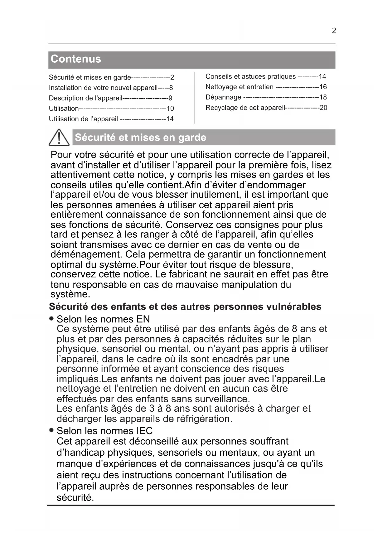 Ce réfrigérateur fonctionne sur un courant à phase unique de 220~240V/50Hz. Si des variations de tensions sont constatées ou que la tension électrique dépasse la valeur conseillée, pour votre sécurité, vérifiez bien que le régulateur de tension automatique C.A supporte bien 350W de plus que l’appareil.Le réfrigérateur doit utiliser une prise murale spécifique plutôt qu’une prise regroupant d’autres appareils électriques.L’appareil doit être relié au sol selon les recommandations en vigueur. Il est dangereux de modifier la composition de cet appareil, de quelque manière que ce soit. Tout dommage fait au cordon peut provoquer un court- circuit, et/ou une électrocution.6 Ne placez pas de produits alimentaires directement à la sortie d’air située au fond de l’appareil. Rangez les aliments déjà emballés conformément aux consignes livrées par leur fabricant. Cet appareil doit être utilisé et traité selon certaines règles spécifiques. Consultez les règles établies en matière de stockage. Ne placez pas de boissons gazeuses ni de boissons carbonatées dans le compartiment de congélation, car cela exercerait une pression sur les bouteilles, qui pourraient exploser à l’intérieur de l’appareil. Les aliments congelés peuvent brûler s’ils sortent directement du froid. N’exposez pas l’appareil directement au soleil. Conservez les bougies, luminaires et autres flammes nues éloignées de l’appareil, afin d’éviter les risques d’incendie. Cet appareil est destiné à ranger des aliments et/ou des boissons domestiques traditionnelles, selon les consignes livrées avec le système. L’appareil est lourd. Soyez prudent lorsque vous le déplacez. Ne retirez pas et ne touchez pas les éléments du congélateur si vous avez les mains mouillées/humides, car cela pourrait provoquer une abrasion de la peau et/ou des brûlures graves. N’utilisez jamais lesocle, les tiroirs, les portes, et autres éléments similaires pour vous appuyer Les aliments congelés ne doivent jamais être recongelés une fois qu’ils ont été décongelés. Les bouteilles pourraient exploser.Ne consommez pas les glaçons formés directement par le congélateur, car vous pourriez vous brûler la bouche et les lèvres. Pour éviter les chutes d’objets et empêcher de détériorer l’appareil, ne surchargez pas les compartiments de portes ni les tiroirs. Attention ! Nettoyage et entretien Cet appareil de réfrigération n'est pas conçu à être utilisé comme un appareil encastré.7 Pour que les branchements électriques soient corrects, suivez bien les consignes livrées dans ce manuel. Déballez l’appareil et vérifiez qu’il n’est pas endommagé visuellement.Ne branchez pas l’appareil si ce dernier est endommagé.Signalez tout dommage au point de vente où vous l’avez acheté.Dans ce cas, conservez l’emballage. Il est recommandé d’attendre au moins quatre heures avant de brancher l’appareil au courant, afin que le compresseur soit bien alimenté en huile. Une bonne circulation de l’air est nécessaire, afin d’éviter les risques de surchauffe.Pour que la ventilation soit suffisante, suivez bien les consignes d’installation fournies. Dans la mesure du possible, l’arrière de l’appareil ne doit pas être collé au mur pour éviter de toucher ou d’attraper des parties chaudes (compresseur, condenseur) pour éviter les risques d’incendie, suivez les instructions d'installation. L’appareil ne doit pas être situé à côté de radiateurs ou de feux de cuisson. Vérifiez bien que les prises sont accessibles une fois l’appareil installé. Dépannage Tout opération électrique doit être effectuée par un technicien qualifié et compétent dans le domaine. Cet appareil doit être dépannée par un Centre de Réparation Agréé, et seules des pièces d’origine doivent être utilisées.