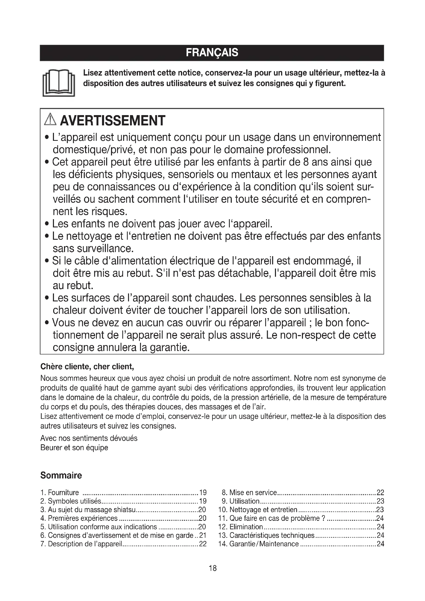 tionnement de l’appareil ne serait plus assuré. Le non-respect de cette consigne annulera la garantie. Chère cliente, cher client, Nous sommes heureux que vous ayez choisi un produit de notre assortiment. Notre nom est synonyme de produits de qualité haut de gamme ayant subi des vérifications approfondies, ils trouvent leur application dans le domaine de la chaleur, du contrôle du poids, de la pression artérielle, de la mesure de température du corps et du pouls, des thérapies douces, des massages et de l’air. Lisez attentivement ce mode d’emploi, conservez-le pour un usage ultérieur, mettez-le à la disposition des autres utilisateurs et suivez les consignes. Avec nos sentiments dévoués Beurer et son équipe19