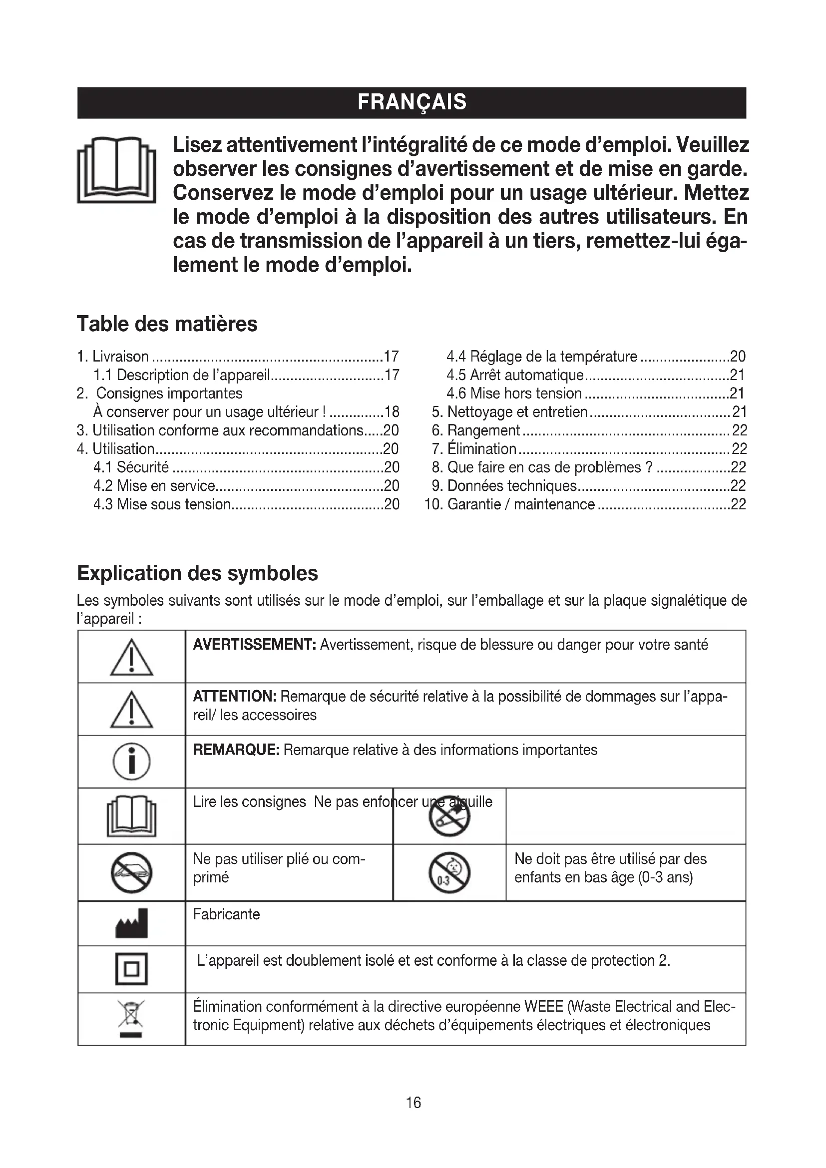 ATTENTION: Remarque de sécurité relative à la possibilité de dommages sur l’appa- reil/ les accessoires REMARQUE: Remarque relative à des informations importantes Lire les consignes Ne pas enfoncer une aiguille Ne pas utiliser plié ou com- primé Ne doit pas être utilisé par des enfants en bas âge (0-3 ans) Fabricante L’appareil est doublement isolé et est conforme à la classe de protection 2. Élimination conformément à la directive européenne WEEE (Waste Electrical and Elec- tronic Equipment) relative aux déchets d’équipements électriques et électroniques FRANÇAIS Lisez attentivement l’intégralité de ce mode d’emploi. Veuillez observer les consignes d’avertissement et de mise en garde. Conservez le mode d’emploi pour un usage ultérieur. Mettez le mode d’emploi à la disposition des autres utilisateurs. En cas de transmission de l’appareil à un tiers, remettez-lui éga