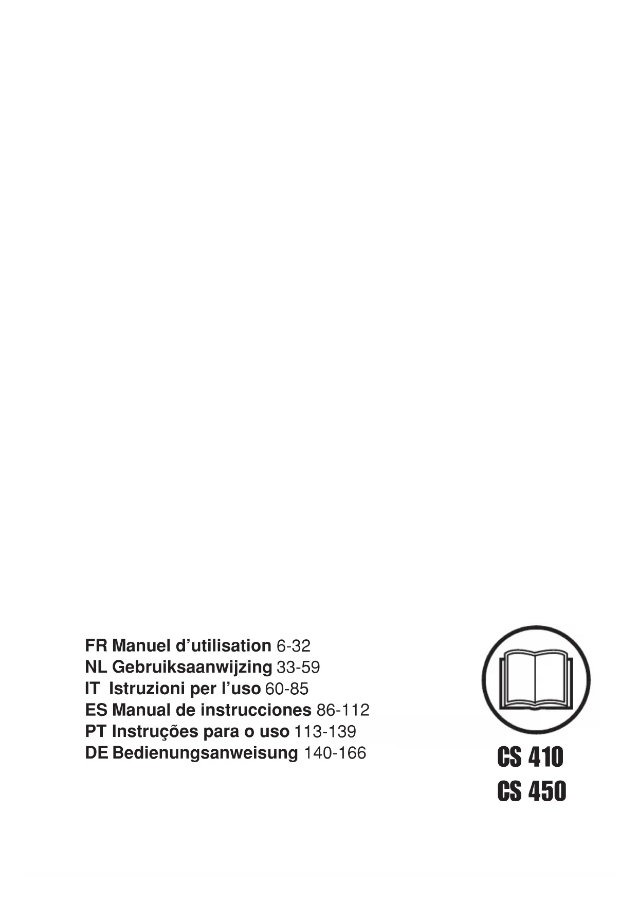 AVERTISSEMENT! Contrôler les points suivants avant la mise en marche: Le frein de chaîne doit être activé lors du démarrage de la tronçonneuse afin de réduire le risque de contact avec la chaîne en rotation. Ne pas démarrer la tronçonneuse si le guide, la chaîne et tous les capots ne sont pas montés. Sinon, l’embrayage risque de se détacher et de causer des blessures personnelles. Placer la machine sur un support stable. Veiller à adopter une position stable et à ce que la chaîne ne puisse pas entrer en contact avec quoi que ce soit. Veiller à ce qu’aucune personne non autorisée ne se trouve dans la zone la travail. Ne jamais enrouler la corde du lanceur autour de la main.DÉMARRAGE ET ARRÊT French – 21 Pompe à carburant (3): Appuyer plusieurs fois sur la poche en caoutchouc de la pompe à carburant jusqu’à ce que le carburant remplisse la poche (env. 6 fois). Il n’est pas nécessaire de remplir la poche complètement. (23) Enfoncez la commande rouge du starter, 5: Cette manœuvre désactive le starter, ce qui n'est pas nécessaire pour démarrer une tronçonneuse à chaud. Toutefois, le mouvement de l'interrupteur marche/arrêt aura engagé un ralenti, facilitant ainsi un démarrage à chaud. Tirer la poignée du lanceur, 6: Saisissez la poignée avant de la main gauche. Maintenez la tronçonneuse au sol en plaçant votre pied droit dans la poignée arrière. (22) Saisissez la poignée du lanceur de la main droite, tirez la corde du lanceur lentement jusqu’à sentir une résistance (les cliquets se mettent en prise). Tirez ensuite rapidement et fermement jusqu’au démarrage du moteur. Le frein de chaîne étant encore activé, le régime du moteur doit être mis sur le ralenti au plus vite en déconnectant la gâchette d’accélération. Il convient pour ce faire de presser très légèrement la gâchette d'accélération. L'on évite ainsi toute usure inutile de l’embrayage, du tambour d’embrayage et de la bande de frein. Laisser la machine tourner au ralenti pendant quelques minutes avant de donner les pleins gaz. (24) Le bord arrière de la tronçonneuse comporte un rappel simple des instructions de démarrage avec des illustrations décrivant les différentes étapes. CS 410 Elite CS 450 Elite Remarque! Réinitialiser le frein de chaîne en poussant la protection anti-rebond contre l’étrier de la poignée. La tronçonneuse est maintenant prête à être utilisée. (25)