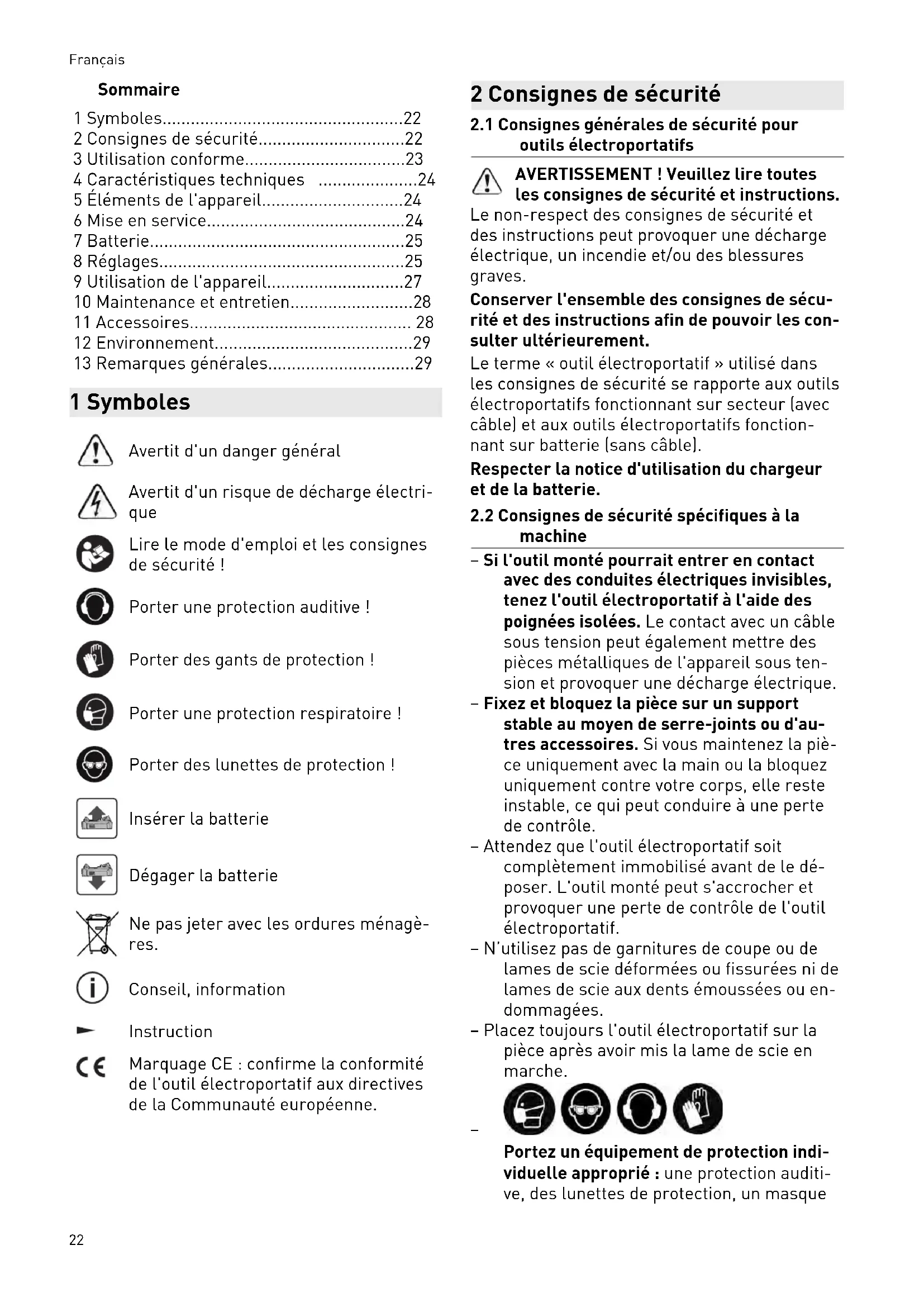 - 13 Remarques générales 1 Symboles Avertit d'un danger général Avertit d'un risque de décharge électri que Lire le mode d'emploi et les consignes de sécurité ! Porter une protection auditive ! Porter des gants de protection ! Porter une protection respiratoire ! Porter des lunettes de protection ! Insérer la batterie Dégager la batterie Ne pas jeter avec les ordures ménagè res. Conseil, information Instruction Marquage CE : confirme la conformité de l'outil électroportatif aux directives de la Communauté européenne. 2 Consignes de sécurité p. 29