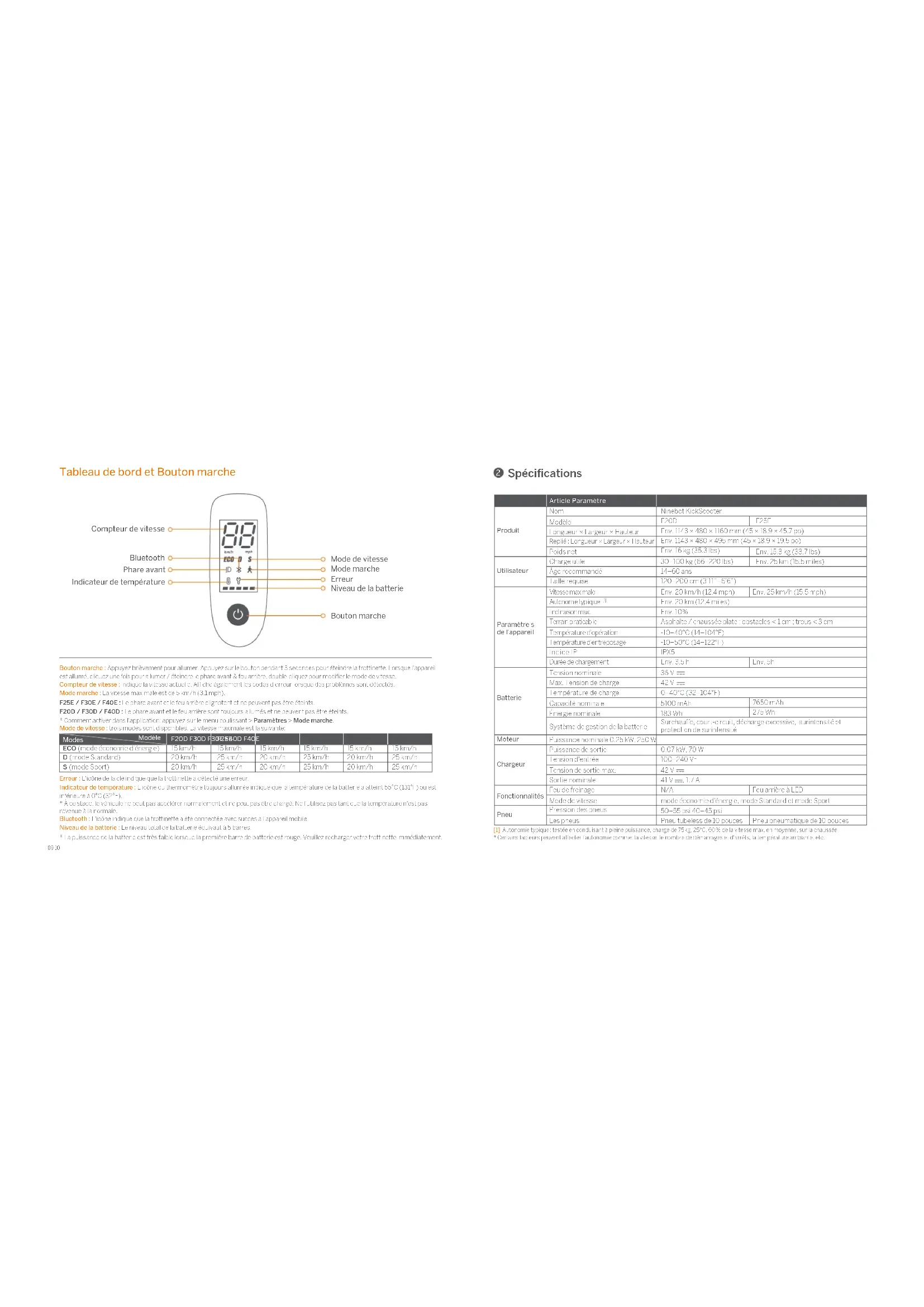 - La puissance de la batterie est très faible lorsque la première barre de batterie est rouge. Veuillez recharger votre trottinette immédiatement. F20D F30D F30E F40D F40E 15 km/h 20 km/h 20 km/h 15 km/h 20 km/h 20 km/h F25E 15 km/h 25 km/h 25 km/h 15 km/h 25 km/h 25 km/h 15 km/h 20 km/h 20 km/h 15 km/h 25 km/h 25 km/h Modèle Modes ECO (mode économie d'énergie) D (mode Standard) S (mode Sport) Tableau de bord et Bouton marche Compteur de vitesse Bluetooth Phare avant Indicateur de température Mode de vitesse Mode marche Erreur Niveau de la batterie Bouton marche Pneu pneumatique de 10 pouces Feu arrière à LED F25E Env. 15.3 kg (33.7 lbs) Env. 25 km (15.5 miles) Env. 25 km/h (15.5 mph) Env. 5h 7650 mAh 275 Wh Spécifications