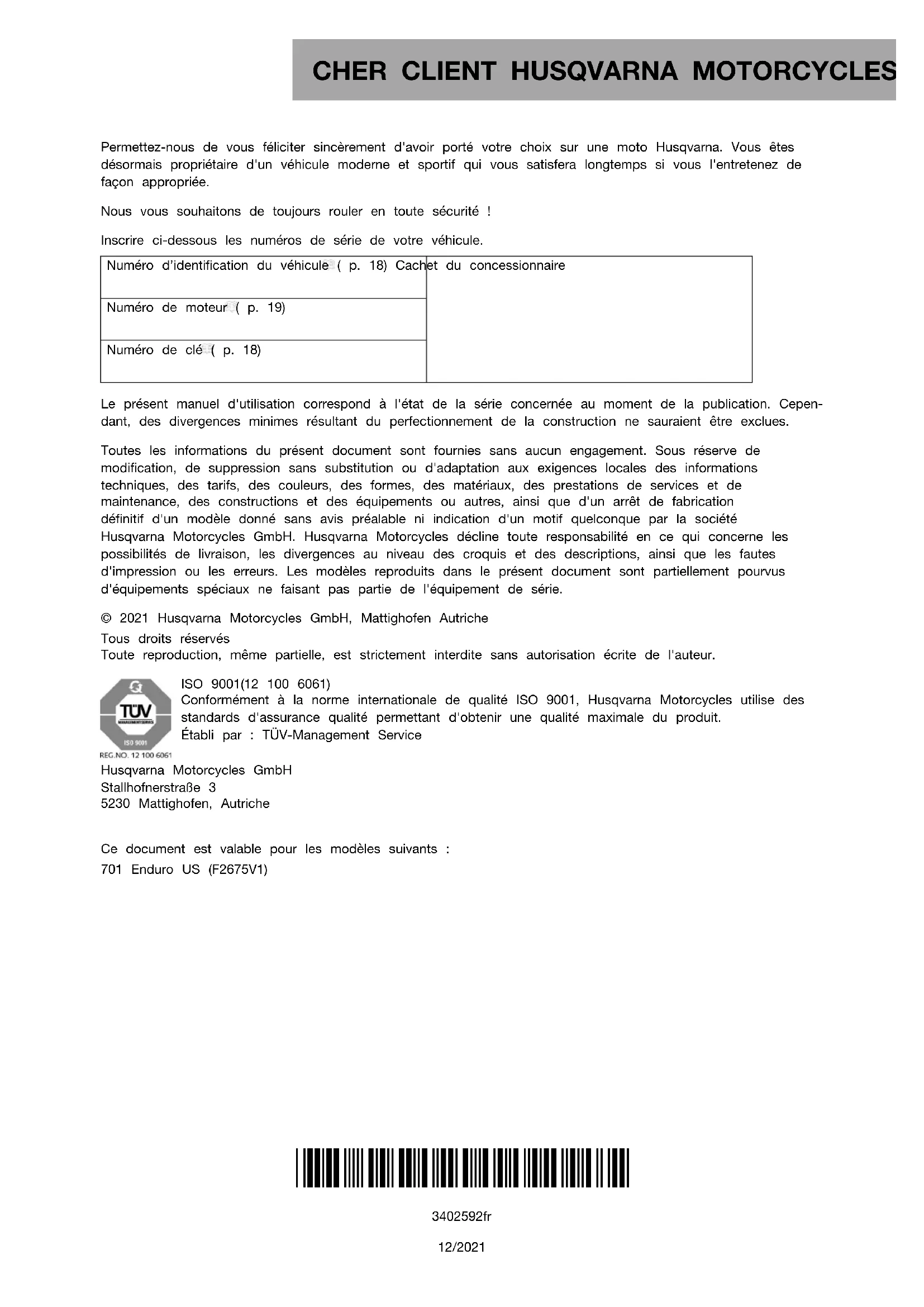 Permettez-nous de vous féliciter sincèrement d'avoir porté votre choix sur une moto Husqvarna. Vous êtes désormais propriétaire d'un véhicule moderne et sportif qui vous satisfera longtemps si vous l'entretenez de façon appropriée. Nous vous souhaitons de toujours rouler en toute sécurité ! Inscrire ci-dessous les numéros de série de votre véhicule. Numéro d’identification du véhicule ( p. 18) Cachet du concessionnaire Numéro de moteur ( p. 19) Numéro de clé ( p. 18) Le présent manuel d'utilisation correspond à l'état de la série concernée au moment de la publication. Cepen- dant, des divergences minimes résultant du perfectionnement de la construction ne sauraient être exclues. Toutes les informations du présent document sont fournies sans aucun engagement. Sous réserve de modification, de suppression sans substitution ou d'adaptation aux exigences locales des informations techniques, des tarifs, des couleurs, des formes, des matériaux, des prestations de services et de maintenance, des constructions et des équipements ou autres, ainsi que d'un arrêt de fabrication définitif d'un modèle donné sans avis préalable ni indication d'un motif quelconque par la société Husqvarna Motorcycles GmbH. Husqvarna Motorcycles décline toute responsabilité en ce qui concerne les possibilités de livraison, les divergences au niveau des croquis et des descriptions, ainsi que les fautes d'impression ou les erreurs. Les modèles reproduits dans le présent document sont partiellement pourvus d'équipements spéciaux ne faisant pas partie de l'équipement de série. © 2021 Husqvarna Motorcycles GmbH, Mattighofen Autriche Tous droits réservés Toute reproduction, même partielle, est strictement interdite sans autorisation écrite de l'auteur. ISO 9001(12 100 6061) Conformément à la norme internationale de qualité ISO 9001, Husqvarna Motorcycles utilise des standards d'assurance qualité permettant d'obtenir une qualité maximale du produit. Établi par : TÜV-Management Service Husqvarna Motorcycles GmbH Stallhofnerstraße 3 5230 Mattighofen, Autriche Ce document est valable pour les modèles suivants : 701 Enduro US (F2675V1)SOMMAIRE
