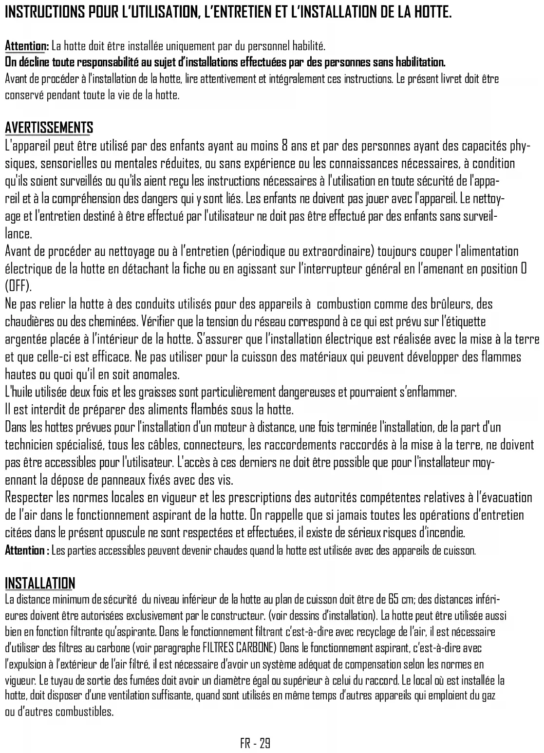 Vor Durchführung von Reinigungs- oder Wartungsarbeiten gleich welcher Art muss der Strom an der Abzugshaube abgeschaltet werden. Dazu den Hauptschalter der Abzugshaube auf 0 (OFF) stellen. Auswechseln der Birnen Halogenbirne 12 V mit Fassung G4: Mit einem Schraubenzieher die Halterung der Scheibe (Abb. 5) abmachen. Die Scheibe abma-DE - 28 chen und die Birne durch eine gleichwertige Birne ersetzen. Die Scheibe wieder anbringen und mit dem Ring sichern. Es handelt sich um handelübliche Birnen, die überall erhältlich sind. Dichroitische Birne mit Fassung GU4: Mit einem Schraubenzieher herausnehmen und durch eine gleichwertige Birne ersetzen (Abb. 6). Im Bedarfsfall darf der LED-Strahler nur von qualifizierten Technikern unter Verwendung von originalen Ersatzteilen ausgeführt werden. Reinigung der Metallfilter Die Metallfilter der Abzugshaube müssen alle 2-3 Monate mit heißem Wasser und einem milden Reinigungsmittel gewaschen werden, je nachdem wie oft die Abzugshaube benützt wird. Zum Herausnehmen der Metallfilter die Filter am Griff anfassen und durch Ziehen nach unten zuerst vorne und dann hinten aus ihrem Sitz lösen (Abb. 7). Die Filter erst dann wieder einsetzen, wenn sie vollständig getrocknet sind. Kohlenstofffilter Wenn die Abzugshaube mit Filtersystem mit interner Rückführung benützt wird, müssen Kohlenstofffilter verwendet werden. Bei diesen Filtern handelt es sich um Behälter, die Aktivkohle enthalten. Die Aktivkohle in den Filtern hält die Küchendünste zurück. Für die Beseitigung oder Austausch der Filter Siehe Abbildung 8. Die POLYESTER Kohlenstofffilter können nicht wiederverwertet oder gewaschen werden, sondern müssen regelmäßig aus- gewechselt werden, und zwar alle 4 Monate, wenn die Abzugshaube zwei Stunden täglich benützt wird. Mit Fett verschmutzte Filter stellen eine Brandgefahr dar! Je nach Modell kann die Abzugshaube mit runden oder rechteckigen Kohlenstofffiltern ausgestattet sein. Im Unterschied zu anderen Kohlefiltern kann der LONG LIFE. Kohlefilter gereinigt und reaktiviert werden. Bei normaler Nutzung der Abzughaube sollte der Filter jeden zweiten Monat gereinigt werden. Der Filter wird am besten in der Spülmaschine gereinigt. Nor- malen Reiniger verwenden un die höchste Temperatur wählen. Der Filter sollte separate gespült werden , damit sich keine Speise- reste am Filter festsetzen und spatër schlechte Gerüche verursachen können. Um die Kohle wieder zu aktivieren, muβ der Filter im Backhofen getrocknet werden . Ober – und Unterhitze sowie eine Temperatur von maximal 100 ° C wählen und den Filter 10 Minuten lang trocken. Der Filter muss ausgewechselt werden, sobald er nicht mehr in der Lage ist die Küchengerüche aufzuneh- men. (Abb.9) Reinigung der Abzugshaube Eine regelmäßige Reinigung der Oberflächen vermeidet eine spätere schwierige Entfernung von sich angesetzten Verkrustungen. Lackierte oder verkupferte Abzugshauben mit einem weichen Lappen und etwas warmem Wasser und neutralem Reinigungsmittel sauber machen. Es ist verboten, Flüssigkeiten direkt auf die Abzugshaube zu schütten! Keine Scheuermittel verwenden! Abzugs- hauben aus Edelstahl mit Spezialprodukten für matte Edelstahlflächen sauber machen (keine Scheuermittel, ätzende Produkte oder chlorhaltigen Produkte verwenden). Dabei darauf achten, dass mit dem Lappe in Richtung der Oberflächenstruktur gewischt wird. Keine aggressiven Produkte, chemischen Lösungsmittel oder Produkte auf Erdölbasis verwenden, da diese ölige Rückstände hinterlassen, die oxydieren oder polymerisieren können. Murano-Manta-Merak-Dubhe: Beim Kochen mit Öl kann das Öl in den unteren Teil der Dunsthaube fließen. Daher sollte man diese Stelle öfters reinigen. Der Hersteller ist nicht für Beeinträchtigungen vom Aussehen der Abzugshaube haftbar, die durch Nichtbeachtung der oben stehenden Hinweise entstanden sind.FR - 29 INSTRUCTIONS POUR L’UTILISATION, L’ENTRETIEN ET L’INSTALLATION DE LA HOTTE. Attention: La hotte doit être installée uniquement par du personnel habilité. On décline toute responsabilité au sujet d’installations effectuées par des personnes sans habilitation. Avant de procéder à l'installation de la hotte, lire attentivement et intégralement ces instructions. Le présent livret doit être conservé pendant toute la vie de la hotte. AVERTISSEMENTS L'appareil peut être utilisé par des enfants ayant au moins 8 ans et par des personnes ayant des capacités phy- siques, sensorielles ou mentales réduites, ou sans expérience ou les connaissances nécessaires, à condition qu'ils soient surveillés ou qu'ils aient reçu les instructions nécessaires à l'utilisation en toute sécurité de l'appa- reil et à la compréhension des dangers qui y sont liés. Les enfants ne doivent pas jouer avec l'appareil. Le nettoy- age et l'entretien destiné à être effectué par l'utilisateur ne doit pas être effectué par des enfants sans surveil- lance. Avant de procéder au nettoyage ou à l’entretien (périodique ou extraordinaire) toujours couper l'alimentation électrique de la hotte en détachant la fiche ou en agissant sur l’interrupteur général en l’amenant en position 0 (OFF). Ne pas relier la hotte à des conduits utilisés pour des appareils à combustion comme des brûleurs, des chaudières ou des cheminées. Vérifier que la tension du réseau correspond à ce qui est prévu sur l’étiquette argentée placée à l’intérieur de la hotte. S’assurer que l’installation électrique est réalisée avec la mise à la terre et que celle-ci est efficace. Ne pas utiliser pour la cuisson des matériaux qui peuvent développer des flammes hautes ou quoi qu’il en soit anomales. L'huile utilisée deux fois et les graisses sont particulièrement dangereuses et pourraient s’enflammer. Il est interdit de préparer des aliments flambés sous la hotte. Dans les hottes prévues pour l'installation d'un moteur à distance, une fois terminée l'inst