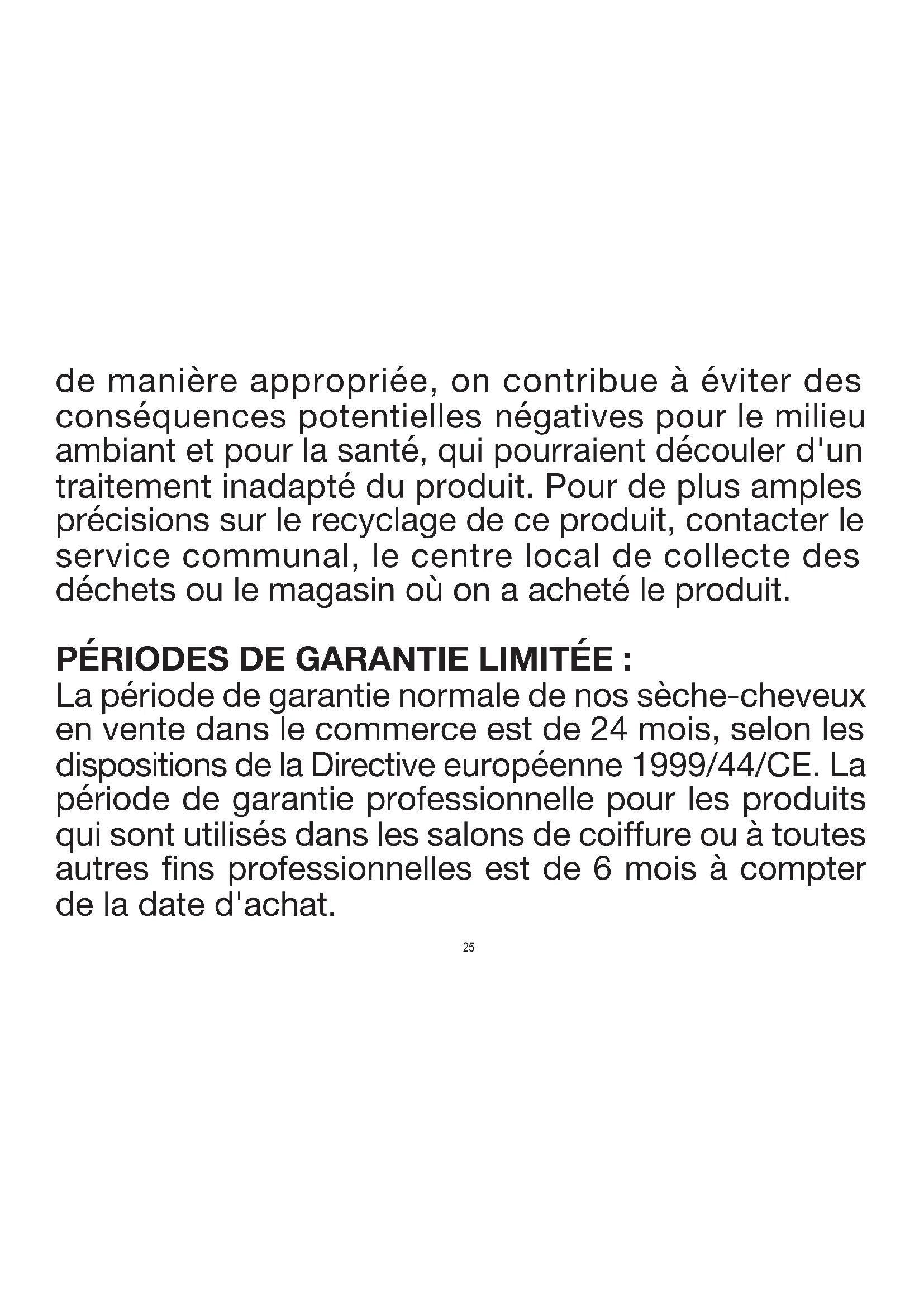 ou d’autres vasques ou récipients contenant de l’eau. 3- 20αρνητικών συνεπειών για το περιβάλλον και την υγεία, που μπορεί να προέρχονται από την ακατάλληλη επεξεργασία του προϊόντος. Για περαιτέρω πληροφορίες για την ανακύκλωση αυτού του προϊόντος επικοινωνήστε με το δήμο, την τοπική υπηρεσία ειδικών απορριμμάτων ή το κατάστημα όπου αγοράστηκε το προϊόν. ΠΕΡΙΟΡΙΣΜΕΝΟΣ ΧΡΟΝΟΣ ΕΓΓΥΗΣΗΣ: Ο στάνταρ χρόνος εγγύησης για τους στεγνωτήρες μαλλιών που διατίθενται στο κοινό είναι 24 μήνες, όπως απαιτείται από την Ευρωπαϊκή Οδηγία 1999/44/ΕΚ. Ο χρόνος εγγύησης για επαγγελματίες για τους στεγνωτήρες μαλλιών που χρησιμοποιούνται στα ινστιτούτα αισθητικής και για άλλους επαγγελματικούς σκοπούς, προβλέπει την διάρκεια 6 μηνών από την ημερομηνία αγοράς. Και για τις δύο περιπτώσεις, η εγγύηση θα ισχύει με την επίδειξη της πρωτότυπης απόδειξης αγοράς, αναγνώσιμης Débrancher l’appareil quand il est éteint puisque la proximité de l’eau pourrait représenter un danger ; faire attention quand vous l’utilisez dans la salle de bain. 4- Éviter d’utiliser cet appareil électrique s'il a été en contact avec des substances liquides, si son câble d’alimentation est abîmé ou s’il présente des signes évidents de ruptures à l’extérieur du corps ou sur l’un des accessoires. Si l’appareil ne fonctionne pas correctement, le débrancher immédiatement du courant et se rendre dans un centre technique pour le faire contrôler. 5- Afin d’éviter tout risque, si le câble d’alimentation est abîmé, demander immédiatement son remplacement au fabricant, à un centre de réparation autorisé ou bien en s’adressant à du personnel qualifié.