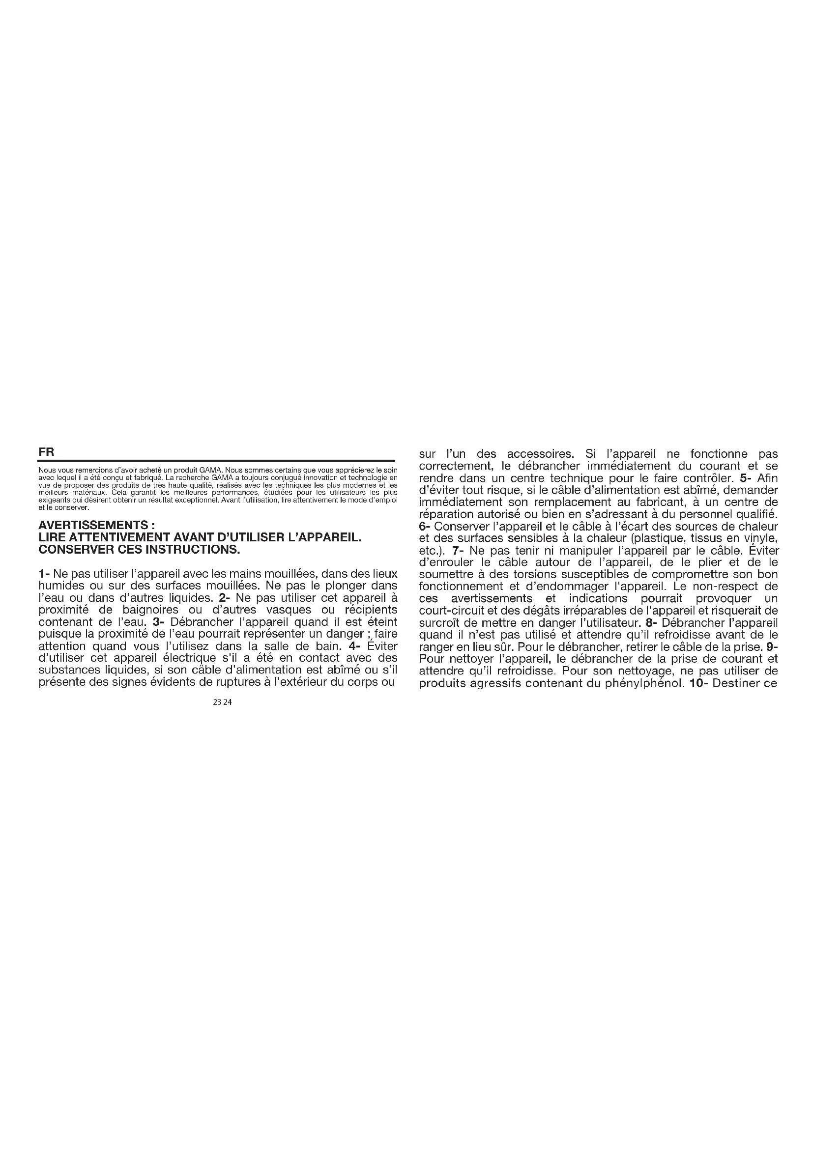 Nous vous remercions d'avoir acheté un produit GAMA. Nous sommes certains que vous apprécierez le soin avec lequel il a été conçu et fabriqué. La recherche GAMA a conjugué innovation et technologie en vue de proposer des produits de très haute qualité, réalisés avec les techniques les plus modernes et les meilleurs matériaux. Cela garantit les meilleures performances, étudiées pour les utilisateurs les plus exigeants qui désirent obtenir un résultat exceptionnel. Avant l'utilisation, lire attentivement le mode d'emploi et le conserver.