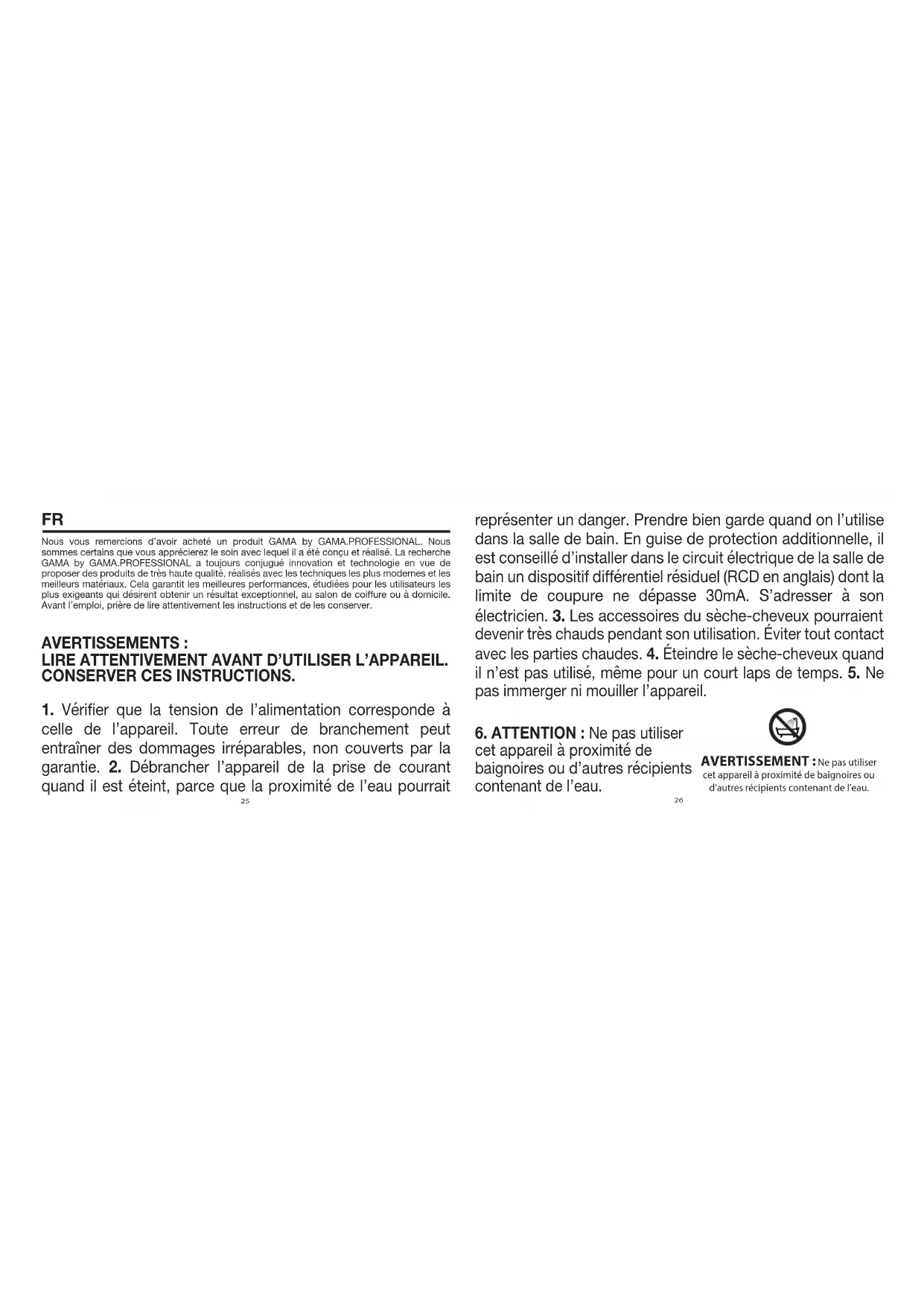 Nous vous remercions d’avoir acheté un produit GAMA by GAMA.PROFESSIONAL. Nous sommes certains que vous apprécierez le soin avec lequel il a été conçu et réalisé. La recherche GAMA by GAMA.PROFESSIONAL a toujours conjugué innovation et technologie en vue de proposer des produits de très haute qualité, réalisés avec les techniques les plus modernes et les meilleurs matériaux. Cela garantit les meilleures performances, étudiées pour les utilisateurs les plus exigeants qui désirent obtenir un résultat exceptionnel, au salon de coiffure ou à domicile. Avant l’emploi, prière de lire attentivement les instructions et de les conserver. AVERTISSEMENTS : LIRE ATTENTIVEMENT AVANT D’UTILISER L’APPAREIL. CONSERVER CES INSTRUCTIONS.