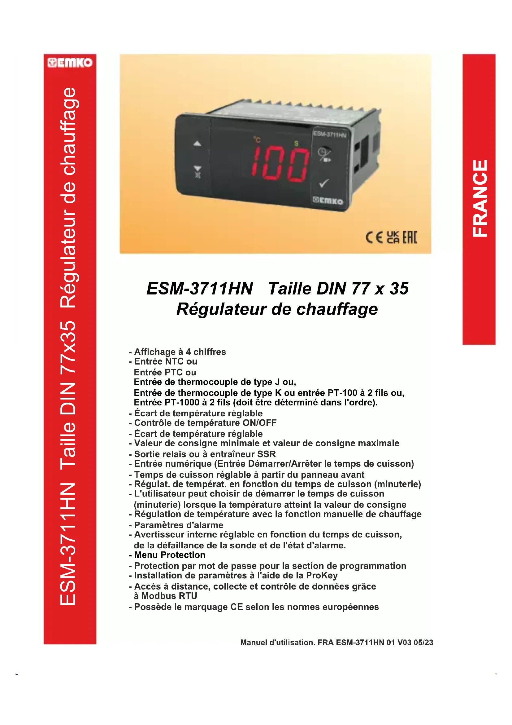 24V ( %15) 50/60Hz - 2.5VAV ± 24VW ( %15) 50/60Hz - 2.5VA ± 100-240VV ( %15, +%10) 50/60Hz - 2.5VA - CustomerFRANCE ESM-3711HN Taille DIN 77x35 Régulateur de chauffage Manuel d'utilisation. FRA ESM-3711HN 01 V03 05/23 - Affichage à 4 chiffres - Entrée NTC ou Entrée PTC ou - Écart de température réglable - Contrôle de température ON/OFF - Écart de température réglable - Valeur de consigne minimale et valeur de consigne maximale - Sortie relais ou à entraîneur SSR - Entrée numérique (Entrée Démarrer/Arrêter le temps de cuisson) - Temps de cuisson réglable à partir du panneau avant - Régulat. de températ. en fonction du temps de cuisson (minuterie) - L'utilisateur peut choisir de démarrer le temps de cuisson (minuterie) lorsque la température atteint la valeur de consigne - Régulation de température avec la fonction manuelle de chauffage - Paramètres d'alarme - Avertisseur interne réglable en fonction du temps de cuisson, de la défaillance de la sonde et de l'état d'alarme. - Protection par mot de passe pour la section de programmation - Installation de paramètres à l'aide de la ProKey - Accès à distance, collecte et contrôle de données grâce à Modbus RTU - Possède le marquage CE selon les normes européennes Entrée de thermocouple de type J ou, Entrée de thermocouple de type K ou entrée PT-100 à 2 fils ou, Entrée PT-1000 à 2 fils (doit être déterminé dans l'ordre). - Menu Protection ESM-3711HN Taille DIN 77 x 35 Régulateur de chauffageTempérature de fonctionnement : -30 à 80°C Humidité max. de fonctionnement : 90% Hr (sans condensation) Altitude : Jusqu'à 2000 m. Conditions interdites: Atmosphère corrosive Atmosphère explosive Applications intérieures (L'appareil est conçu uniquement pour les applications industrielles)