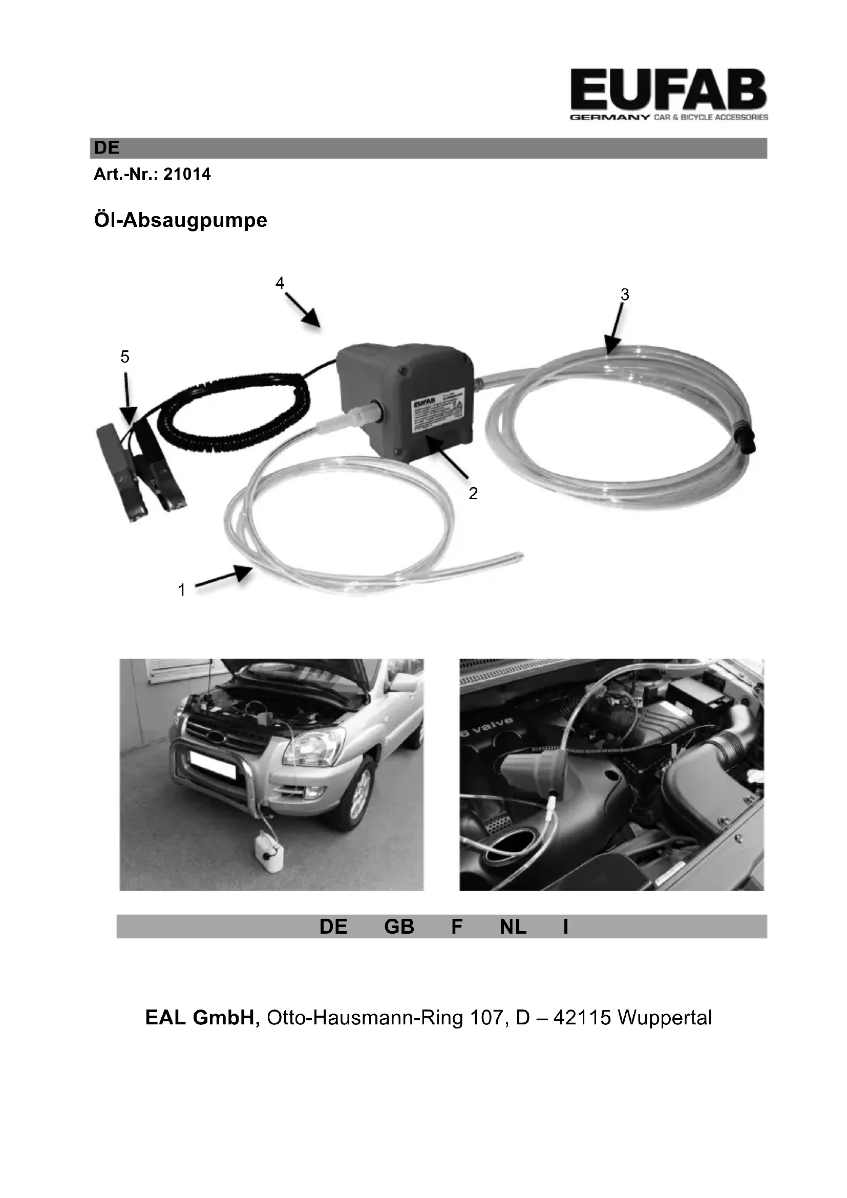 F N° d'art. 21014 La pompe à huile Le mode d’emploi Chers clients! Avant d’utiliser cet article lisez s. v. p. attentivement le mode d’emploi et réspectez toutes les instructions. Gardez ce mode d’emploi pour s’y rendre ultérieurement. La déscription de l‘article: Cette pompe à huile convient au vidange propre d’huile ou bien à l’épuisement d’huile moteur, de gazole et de mazout.