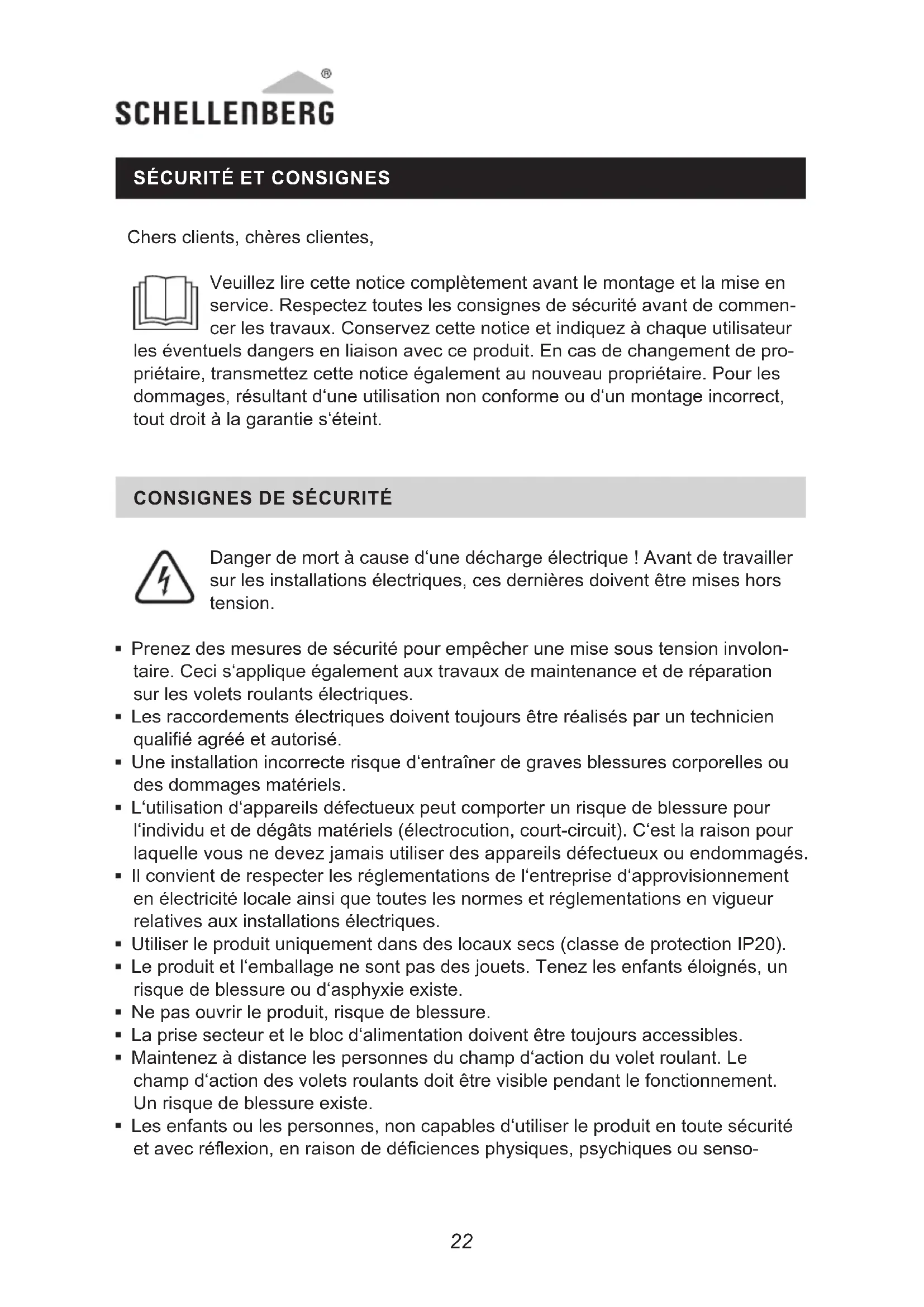 Danger de mort à cause d‘une décharge électrique ! Avant de travailler sur les installations électriques, ces dernières doivent être mises hors tension Prenez des mesures de sécurité pour empêcher une mise sous tension involon- taire. Ceci s‘applique également aux travaux de maintenance et de réparation sur les volets roulants électriques Les raccordements électriques doivent toujours être réalisés par un technicien qualié agréé et autorisé. Une installation incorrecte risque d‘entraîner de graves blessures corporelles ou des dommages matériels L‘utilisation d‘appareils défectueux peut comporter un risque de blessure pour l‘individu et de dégâts matériels (électrocution, court-circuit). C‘est la raison pour laquelle vous ne devez jamais utiliser des appareils défectueux ou endommagés. Il convient de respecter les réglementations de l‘entreprise d‘approvisionnement en électricité locale ainsi que toutes les normes et réglementations en vigueur relatives aux installations électriques Utiliser le produit uniquement dans des locaux secs (classe de protection IP20). Le produit et l‘emballage ne sont pas des jouets. Tenez les enfants éloignés, un risque de blessure ou d‘asphyxie existe Ne pas ouvrir le produit, risque de blessure. La prise secteur et le bloc d‘alimentation doivent être toujours accessibles. Maintenez à distance les personnes du champ d‘action du volet roulant. Le champ d‘action des volets roulants doit être visible pendant le fonctionnement. Un risque de blessure existe. Les enfants ou les personnes, non capables d‘utiliser le produit en toute sécurité et avec réexion, en raison de déciences physiques, psychiques ou senso-2322