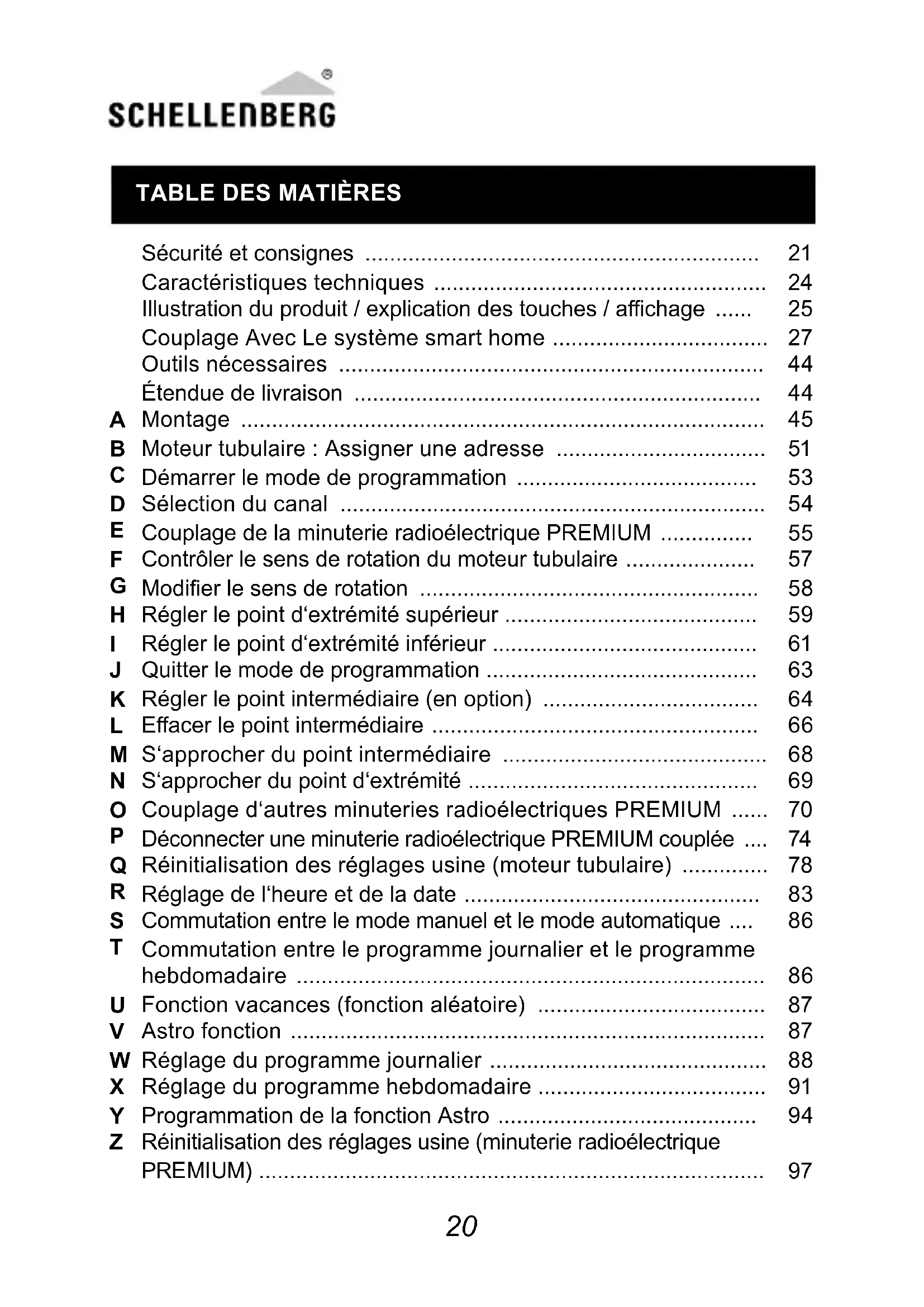 Sécurité et consignes ................................................................ Caractéristiques techniques ...................................................... Illustration du produit / explication des touches / achage ...... Couplage Avec Le système smart home ................................... Outils nécessaires ..................................................................... Étendue de livraison .................................................................. Montage ..................................................................................... Moteur tubulaire : Assigner une adresse .................................. Démarrer le mode de programmation ....................................... Sélection du canal ..................................................................... Couplage de la minuterie radioélectrique PREMIUM ............... Contrôler le sens de rotation du moteur tubulaire ..................... Modier le sens de rotation ....................................................... Régler le point d‘extrémité supérieur ......................................... Régler le point d‘extrémité inférieur ........................................... Quitter le mode de programmation ............................................ Régler le point intermédiaire (en option) ................................... Eacer le point intermédiaire ..................................................... S‘approcher du point intermédiaire ........................................... S‘approcher du point d‘extrémité ............................................... Couplage d‘autres minuteries radioélectriques PREMIUM ...... Déconnecter une minuterie radioélectrique PREMIUM couplée .... Réinitialisation des réglages usine (moteur tubulaire) .............. Réglage de l‘heure et de la date ................................................ Commutation entre le mode manuel et le mode automatique .... Commutation entre le programme journalier et le programme hebdomadaire ............................................................................ Fonction vacances (fonction aléatoire) ..................................... Astro fonction ............................................................................. Réglage du programme journalier ............................................. Réglage du programme hebdomadaire ..................................... Programmation de la fonction Astro .......................................... Réinitialisation des réglages usine (minuterie radioélectrique PREMIUM) ..................................................................................