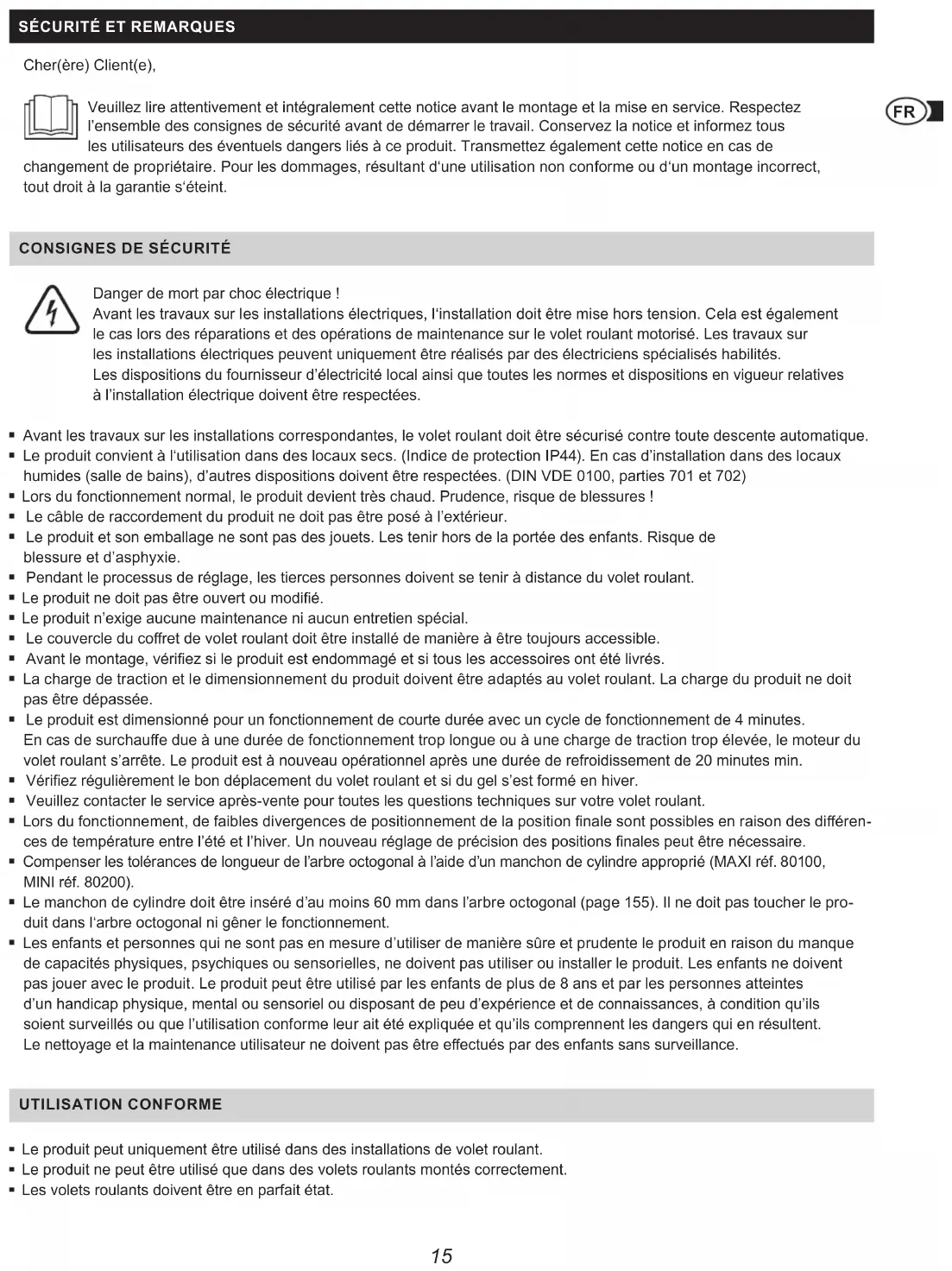 Danger de mort par choc électrique ! Avant les travaux sur les installations électriques, l‘installation doit être mise hors tension. Cela est également le cas lors des réparations et des opérations de maintenance sur le volet roulant motorisé. Les travaux sur les installations électriques peuvent uniquement être réalisés par des électriciens spécialisés habilités. Les dispositions du fournisseur d’électricité local ainsi que toutes les normes et dispositions en vigueur relatives à l’installation électrique doivent être respectées. Avant les travaux sur les installations correspondantes, le volet roulant doit être sécurisé contre toute descente automatique. Le produit convient à l‘utilisation dans des locaux secs. (Indice de protection IP44). En cas d’installation dans des locaux humides (salle de bains), d’autres dispositions doivent être respectées. (DIN VDE 0100, parties 701 et 702) Lors du fonctionnement normal, le produit devient très chaud. Prudence, risque de blessures ! Le câble de raccordement du produit ne doit pas être posé à l’extérieur. Le produit et son emballage ne sont pas des jouets. Les tenir hors de la portée des enfants. Risque de blessure et d’asphyxie. Pendant le processus de réglage, les tierces personnes doivent se tenir à distance du volet roulant. Le produit ne doit pas être ouvert ou modié. Le produit n’exige aucune maintenance ni aucun entretien spécial. Le couvercle du coret de volet roulant doit être installé de manière à être toujours accessible. Avant le montage, vériez si le produit est endommagé et si tous les accessoires ont été livrés. La charge de traction et le dimensionnement du produit doivent être adaptés au volet roulant. La charge du produit ne doit pas être dépassée. Le produit est dimensionné pour un fonctionnement de courte durée avec un cycle de fonctionnement de 4 minutes. En cas de surchaue due à une durée de fonctionnement trop longue ou à une charge de traction trop élevée, le moteur du volet roulant s’arrête. Le produit est à nouveau opérationnel après une durée de refroidissement de 20 minutes min. Vériez régulièrement le bon déplacement du volet roulant et si du gel s’est formé en hiver. Veuillez contacter le service après-vente pour toutes les questions techniques sur votre volet roulant. Lors du fonctionnement, de faibles divergences de positionnement de la position nale sont possibles en raison des diéren- ces de température entre l’été et l’hiver. Un nouveau réglage de précision des positions nales peut être nécessaire. Compenser les tolérances de longueur de l’arbre octogonal à l’aide d’un manchon de cylindre approprié (MAXI réf. 80100, MINI réf. 80200). Le manchon de cylindre doit être inséré d’au moins 60 mm dans l’arbre octogonal (page 155). Il ne doit pas toucher le pro- duit dans l‘arbre octogonal ni gêner le fonctionnement. Les enfants et personnes qui ne sont pas en mesure d’utiliser de manière sûre et prudente le produit en raison du manque de capacités physiques, psychiques ou sensorielles, ne doivent pas utiliser ou installer le produit. Les enfants ne doivent pas jouer avec le produit. Le produit peut être utilisé par les enfants de plus de 8 ans et par les personnes atteintes d’un handicap physique, mental ou sensoriel ou disposant de peu d’expérience et de connaissances, à condition qu’ils soient surveillés ou que l’utilisation conforme leur ait été expliquée et qu’ils comprennent les dangers qui en résultent. Le nettoyage et la maintenance utilisateur ne doivent pas être eectués par des enfants sans surveillance. UTILISATION CONFORME Le produit peut uniquement être utilisé dans des installations de volet roulant. Le produit ne peut être utilisé que dans des volets roulants montés correctement. Les volets roulants doivent être en parfait état.16 Avant de monter le produit, les défauts au niveau des volets roulants doivent être éliminés et les pièces endommagées remplacées. Toute utilisation du produit diérente de celle indiquée est considérée comme non conforme. Le volet roulant doit être sécurisé contre tout déplacement latéral. (Tablier de volet roulant bloqué selon DIN EN 13695, EN 12045) En cas de mauvaise utilisation, la société Alfred Schellenberg GmbH n’assume aucune responsabilité pour tout dommage matériel, corporel et consécutif. Le produit doit uniquement être utilisé avec les émetteurs radio autorisés par Schellenberg.